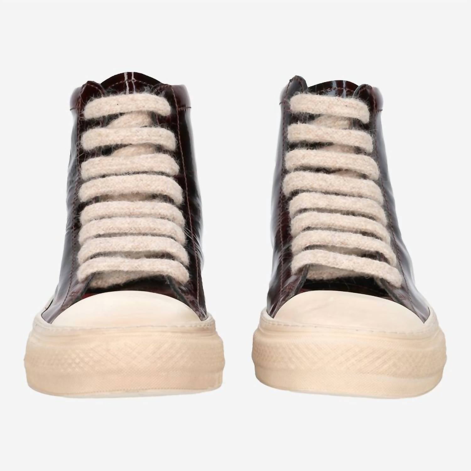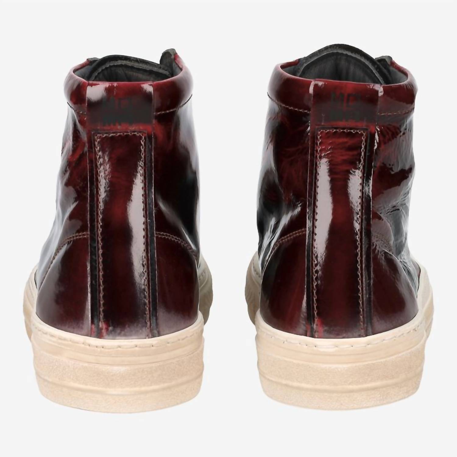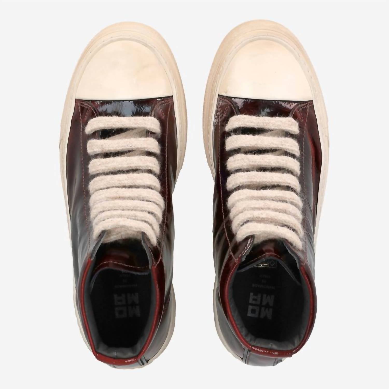 When fashion and function come together seamlessly. Elevate your fall streetwear with the Women's Bell Rosso Sneakers by Moma Shoes, a vibrant red masterpiece handcrafted in Italy. These high-top sneakers are skillfully made with a leather upper in a crumpled varnish finish, complete with leather lining and insole. Designed with a round toe, flat heel, and a 30 mm heel height, they offer both style and comfort, emphasizing a vintage used look and unique decorative stitching. The lace-up closure ensures a secure fit, and the removable footbed makes these sneakers suitable for insoles. The rubber sole provides durability, and the overall design guarantees optimum flexibility without compromising on luxury.