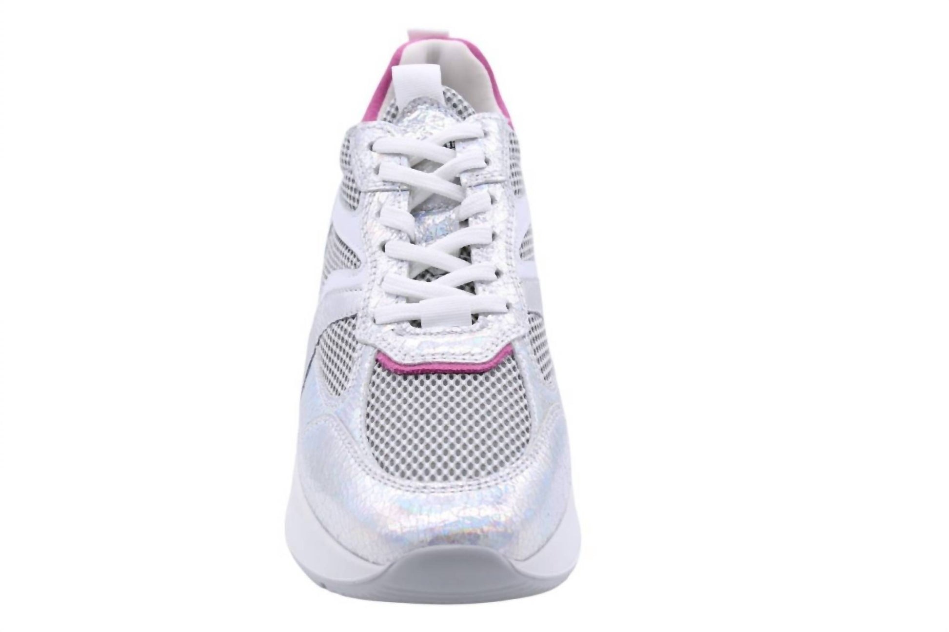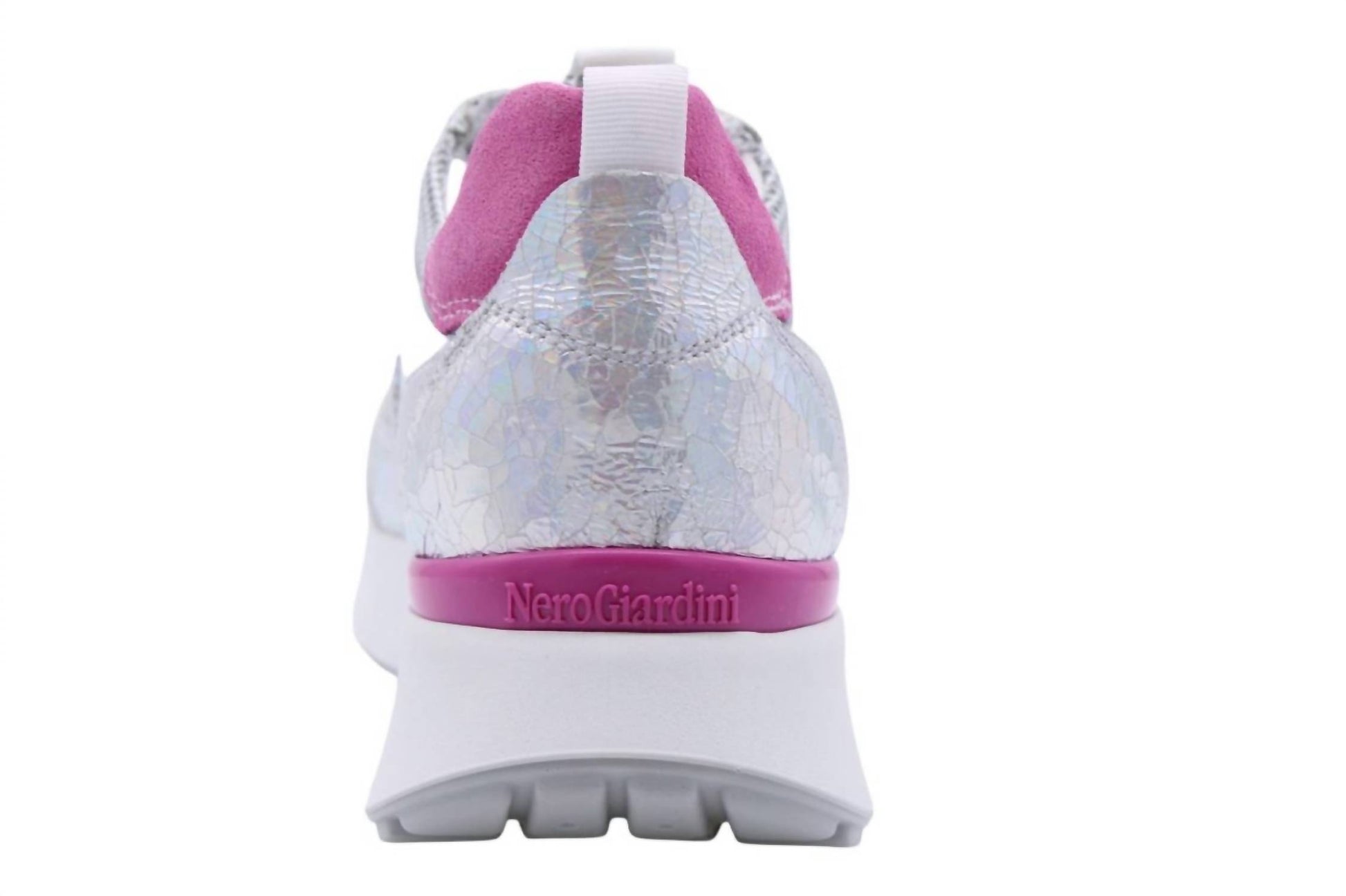 Get your daily steps in with these adorable sneakers. Elevate your streetwear style with the NeroGiardini Women's E512880 Sneaker, a chic choice in silver and pink. These sneakers feature a stylish mix of leather and mesh, complete with a platform sole for added height. The round toe design ensures comfort, while the removeable insole offers versatile wear. Perfect for spring travel, these sneakers embody fashion-forward femininity.