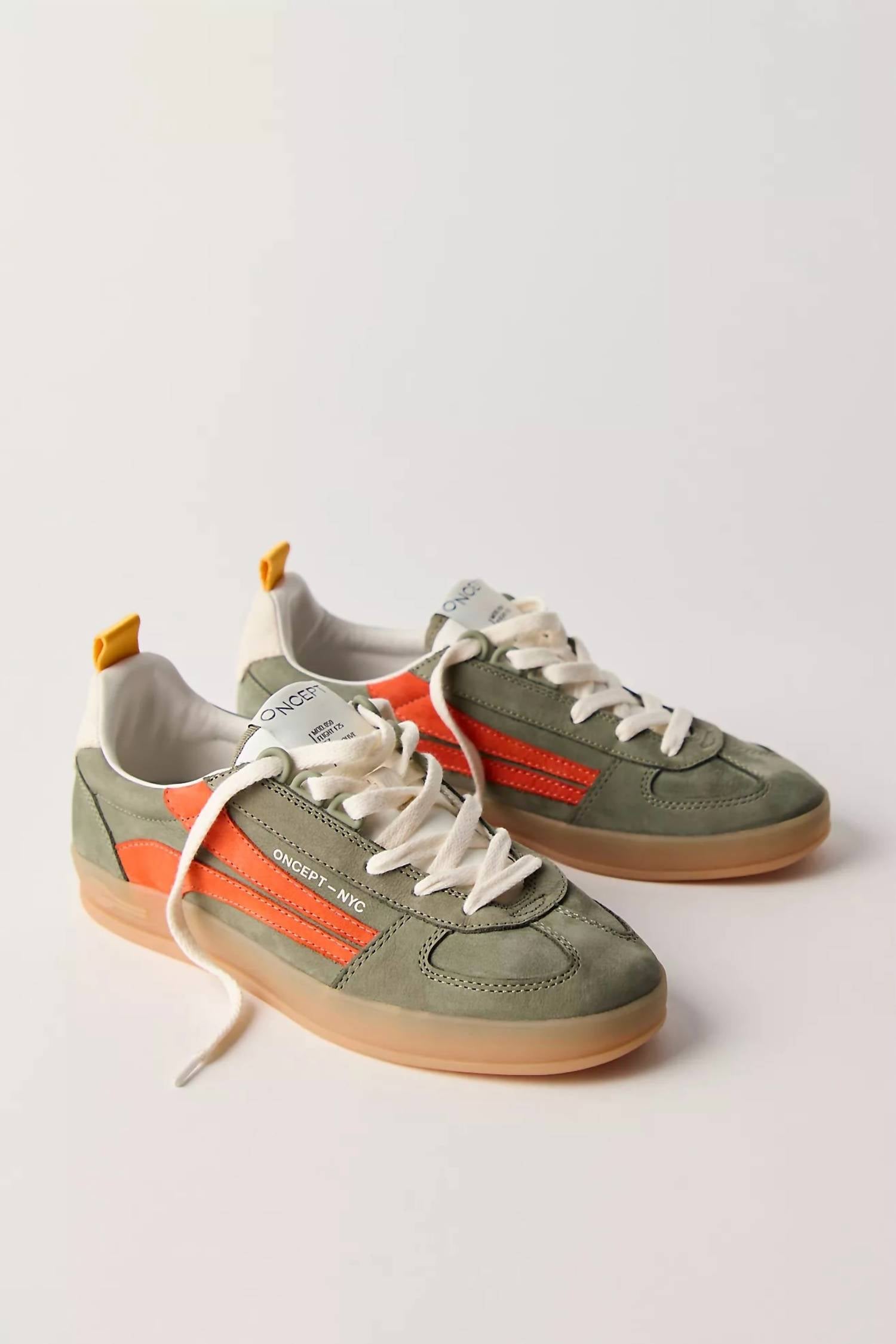 Cute, functional, and comfortable. These sneakers check all the boxes. Introducing the Women's Fez Court Sneaker by Oncept, a stylish addition to your streetwear collection in versatile dark olive. These low-top sneakers feature LWG-certified leather and Tencel uppers, offering breathable comfort with organic cotton laces and a removable memory foam footbed. The honey-colored translucent and ultra-flexible rubber outsole not only provides a classic look but also ensures ease of movement, making them ideal for fitness or workout occasions. Proudly imported, these shoes are true to size and are perfect for the spring season with a flat, round toe design for modern appeal.