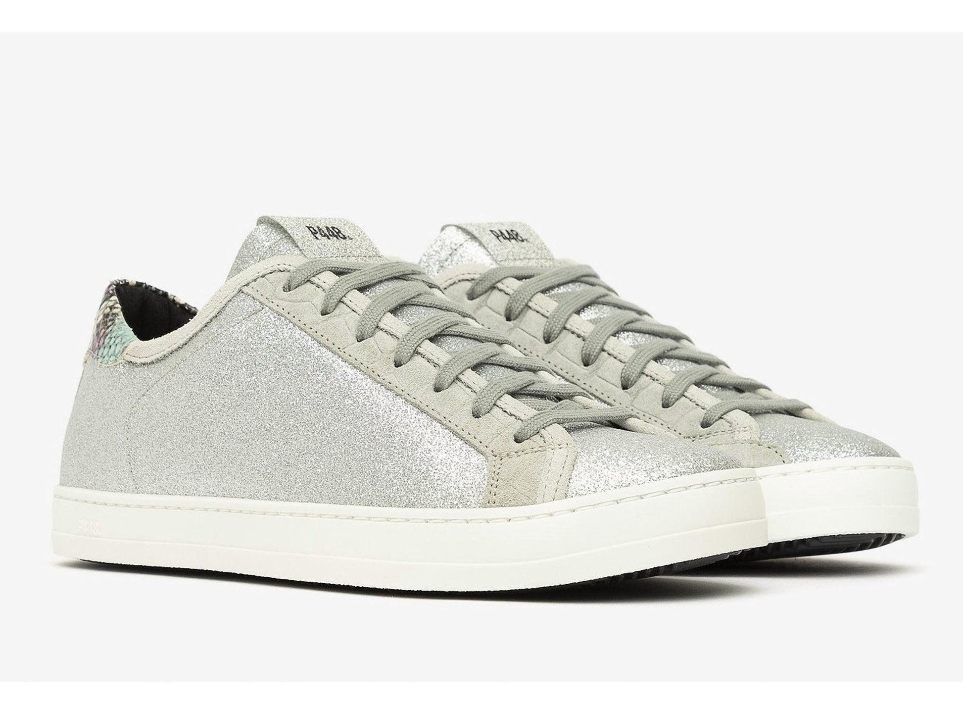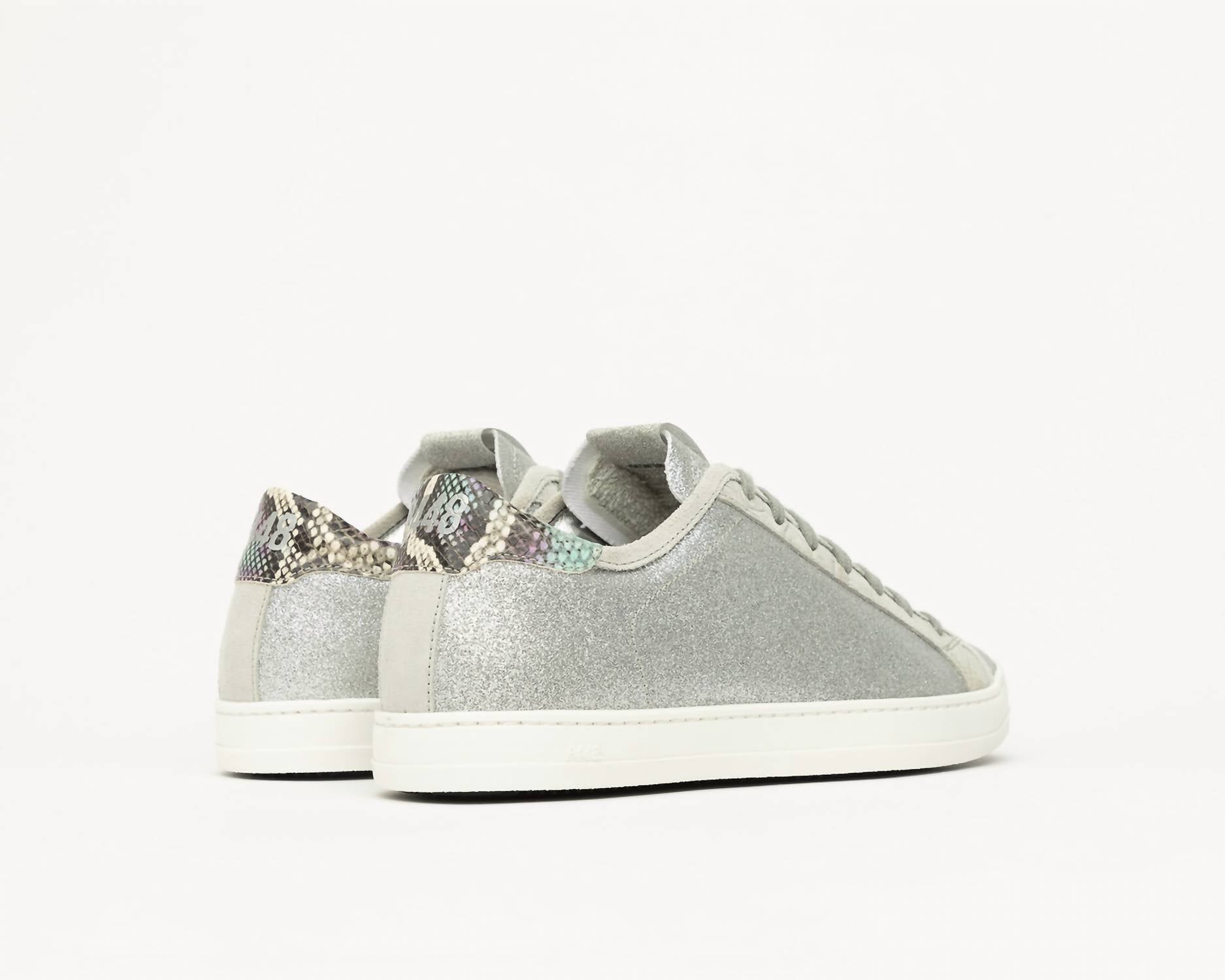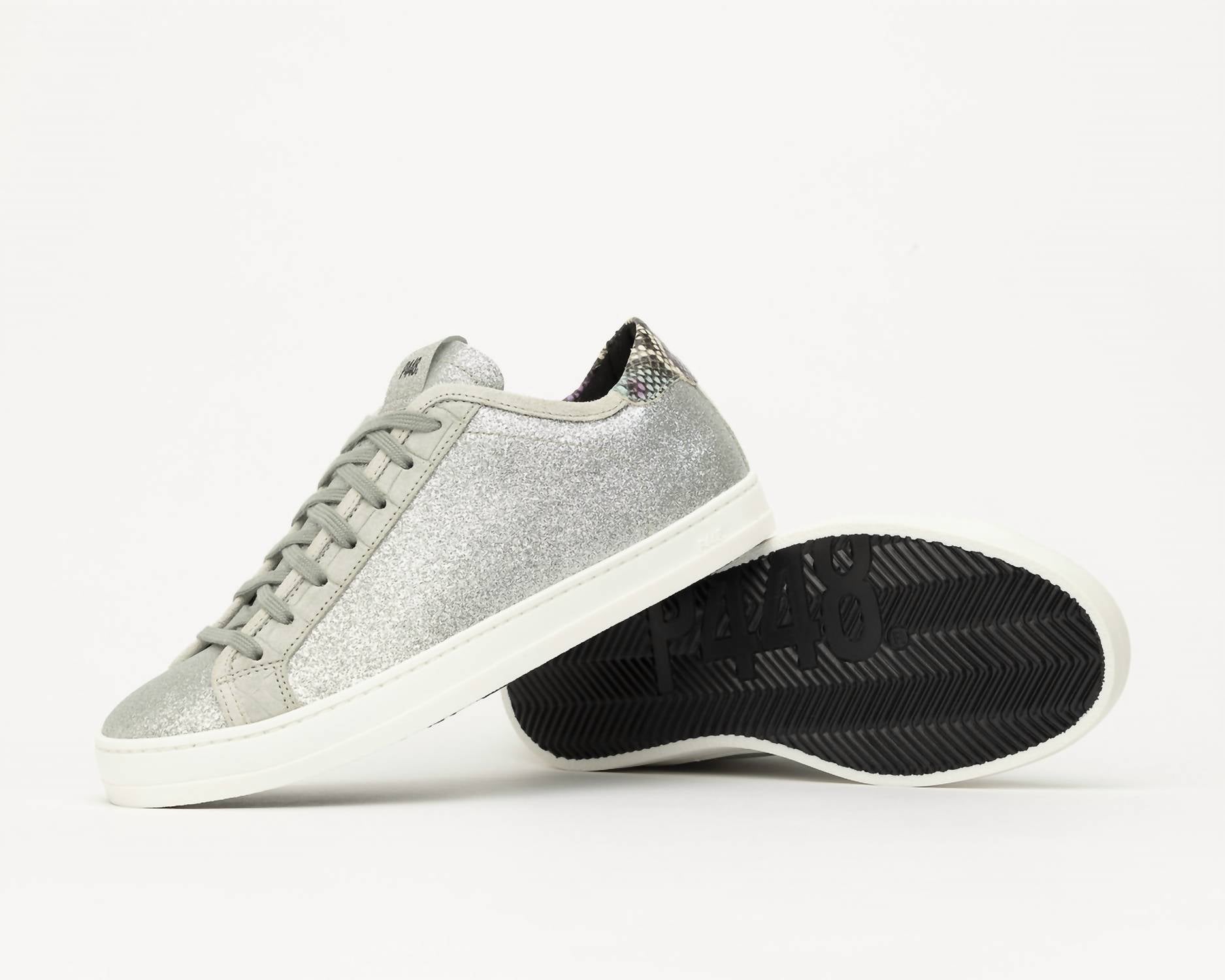 When fashion and function come together seamlessly. Step into style with the Women's Johnny Sneakers by P448, featuring a chic Glitter Ice Python design. Showcasing a silver-tone glitter upper, accented by a grey coconut printed leather trim, and adorned with a multicolor python printed leather heel tab for a touch of luxury. These sneakers maintain a minimalistic silhouette with the iconic perforated logo and a customized rubber cupsole for comfort. Sporting a lace-up closure, these Italian-made sneakers include a cushioned footbed and fit true to size, perfect for your daily adventures.