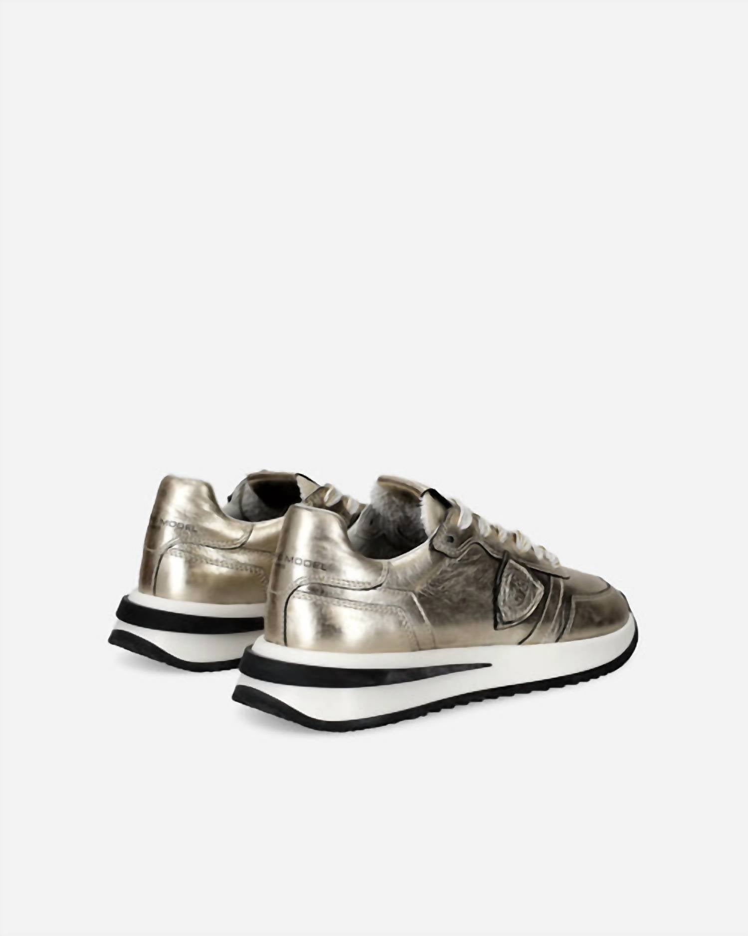 Cute, functional, and comfortable. These sneakers check all the boxes. Elevate your footwear collection with the Women's Tropez 2.1 Low Sneaker in Metal Gold by PHILIPPE MODEL, a perfect blend of contemporary design and casual-active charm. The sneaker boasts a striking metallic-effect leather upper with nylon details, while the TPU sole, with a height of 3.5 cm, ensures both lightness and flexibility. Crafted with 88% calf leather and 12% nylon, the sneaker features a Strobel-crafted upper and an Ortholite leather and terry cotton lining for unparalleled comfort. Ideal for a holiday party and perfect for the preppy trend this spring season, opt for a size larger than usual for the perfect fit.