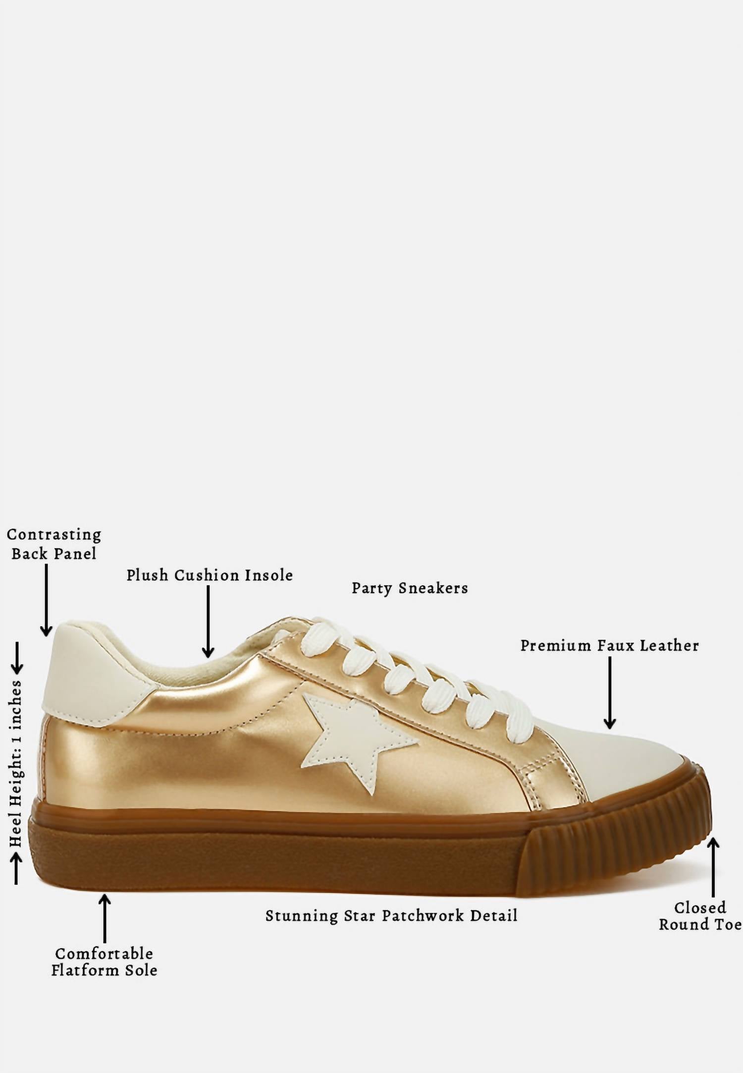 Cute, functional, and comfortable. These sneakers check all the boxes. Add a touch of glam to your ensemble with the Jumping Jacks Metallic Faux Leather Star Sneakers by Rag Company. Crafted from high-quality gold metallic faux leather, these sneakers boast a lace-up design and comfortable cushion insoles for a secure fit. Featuring a 1-inch chunky platform and TPR closed round toe, they are perfect for adding a hint of height without sacrificing comfort. Ideal for dancing the night away or making a statement at any spring or New Year's Eve occasion.