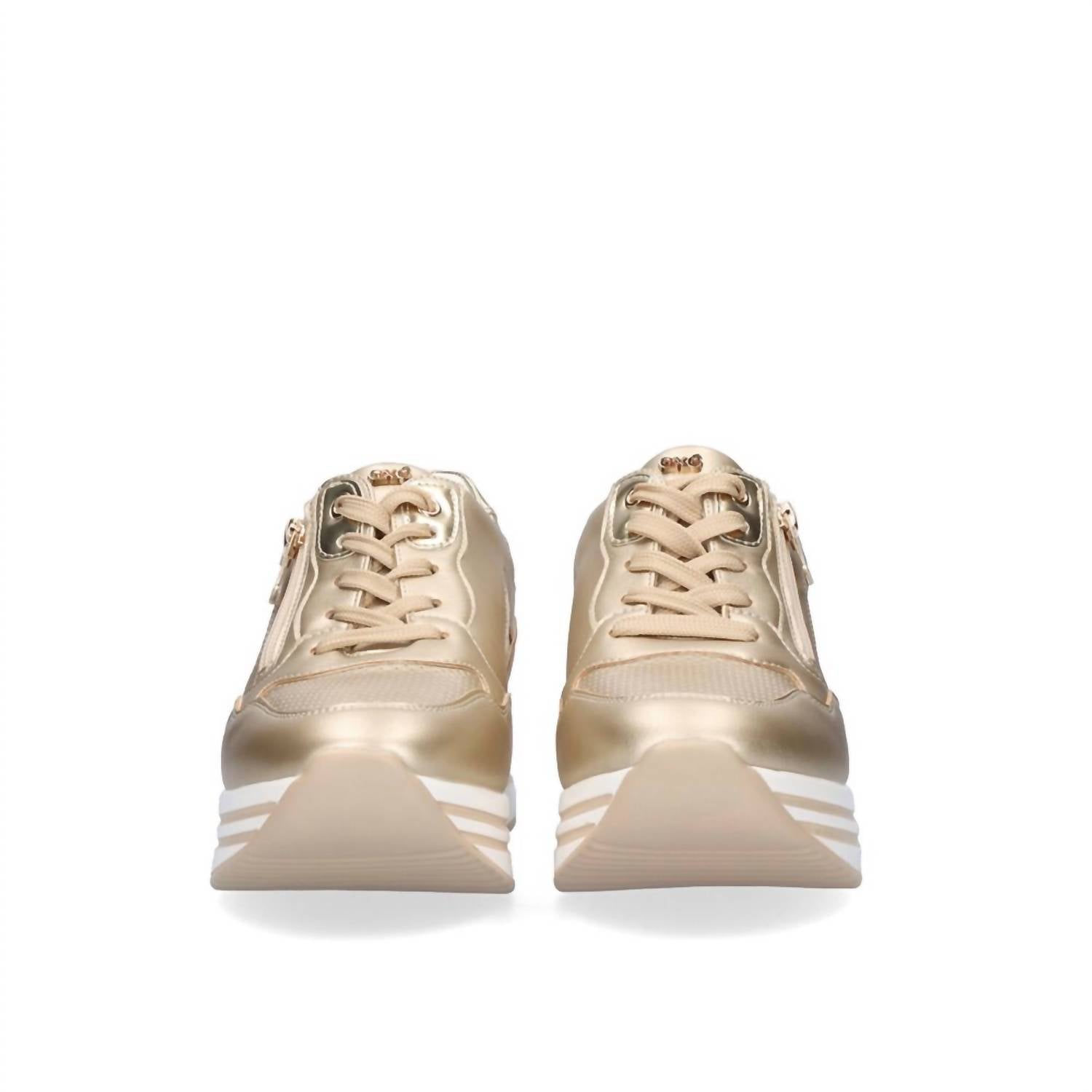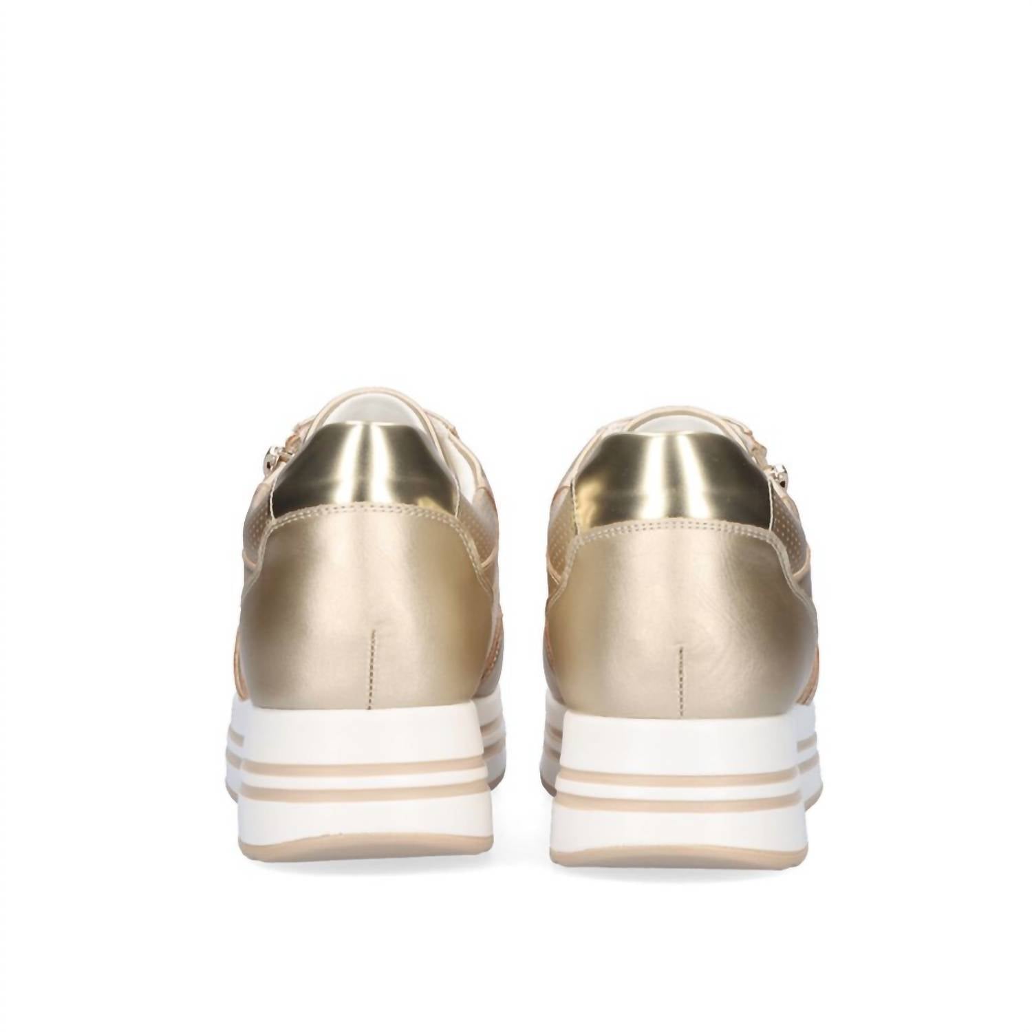 When fashion and function come together seamlessly. Step into comfort and style with the Women's Perforated Low Top Sneaker by Renato Garini, a perfect addition to your spring wardrobe. Crafted from luxurious leather in a striking gold hue, these sneakers feature a soft insole and a classic round toe design. With their flat heel height of 1" and under, they are tailored for both travel and streetwear occasions. Designed in Greece, these sneakers are especially ideal for Easter celebrations and ensure a chic, effortless look.