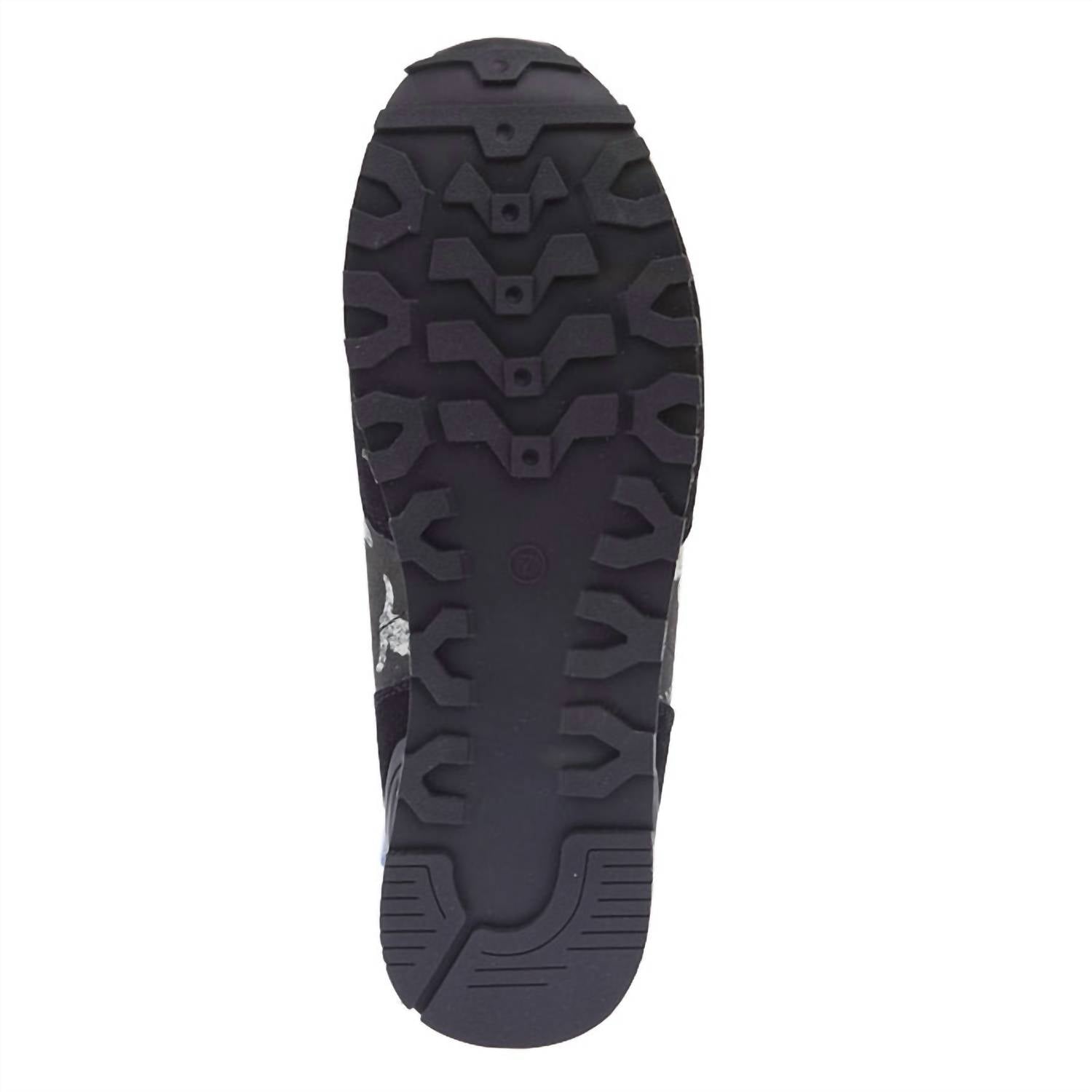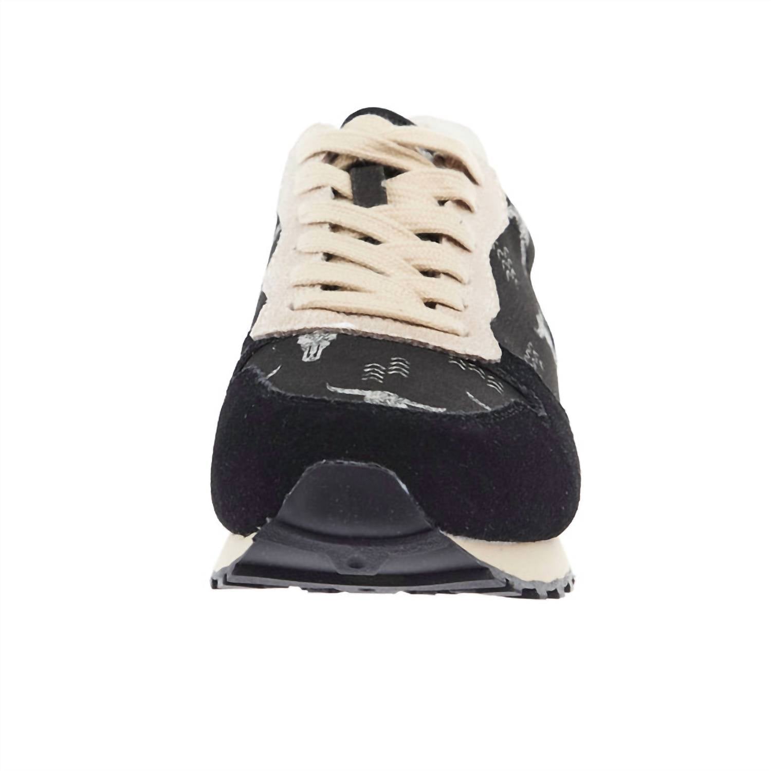 Cute, functional, and comfortable. These sneakers check all the boxes. Roper presents the Ladies Giddy Up Longhorn Print Casual Shoes, a perfect blend of comfort and style for game day events. Featuring a black suede upper with a distinctive longhorn canvas print, these lace-up sneakers are crafted for the modern woman seeking a streetwear aesthetic. The shoes come with a supportive heel stabilizer and a flat rubber outsole, complemented by an EVA midsole and removable comfort insole. With moisture-wicking linings and a padded collar, these imported shoes ensure your feet stay comfortable all day.