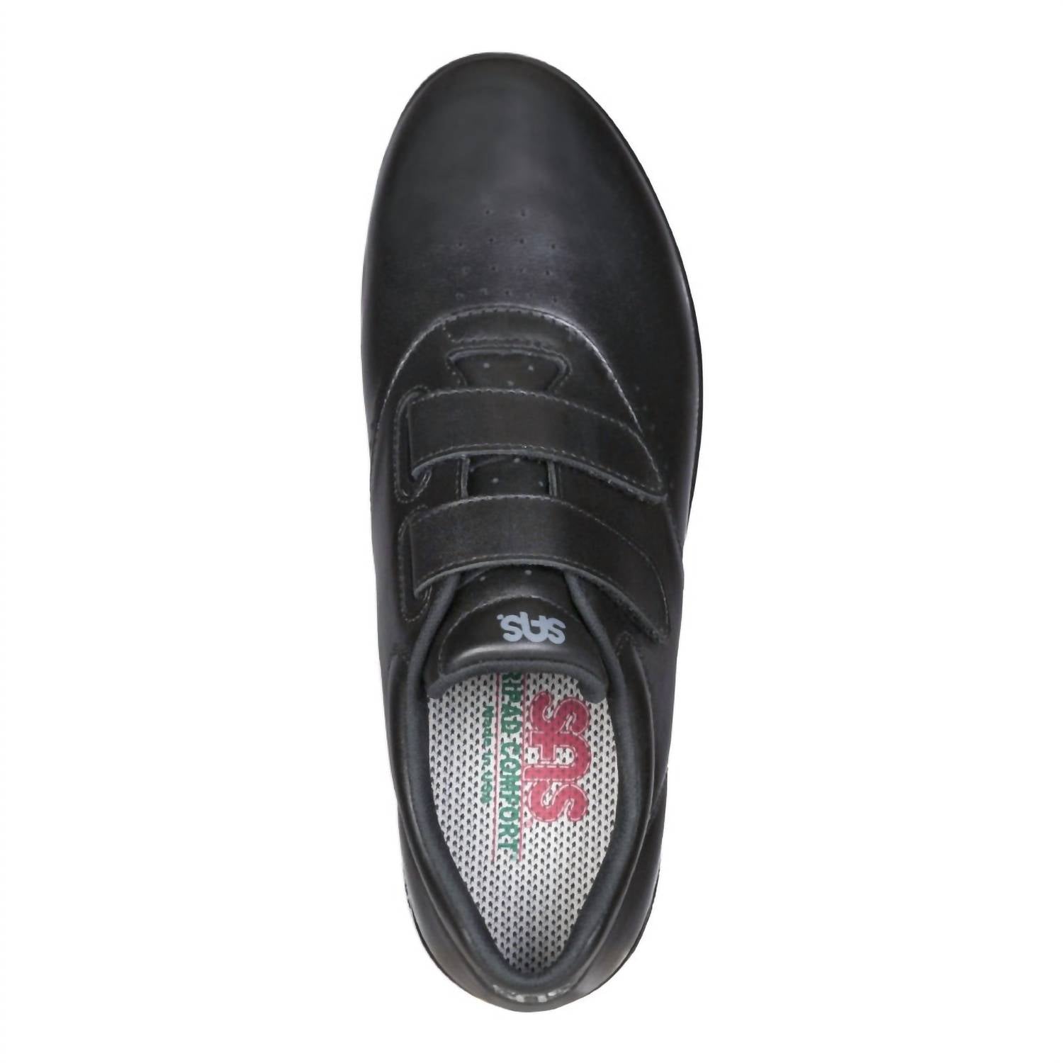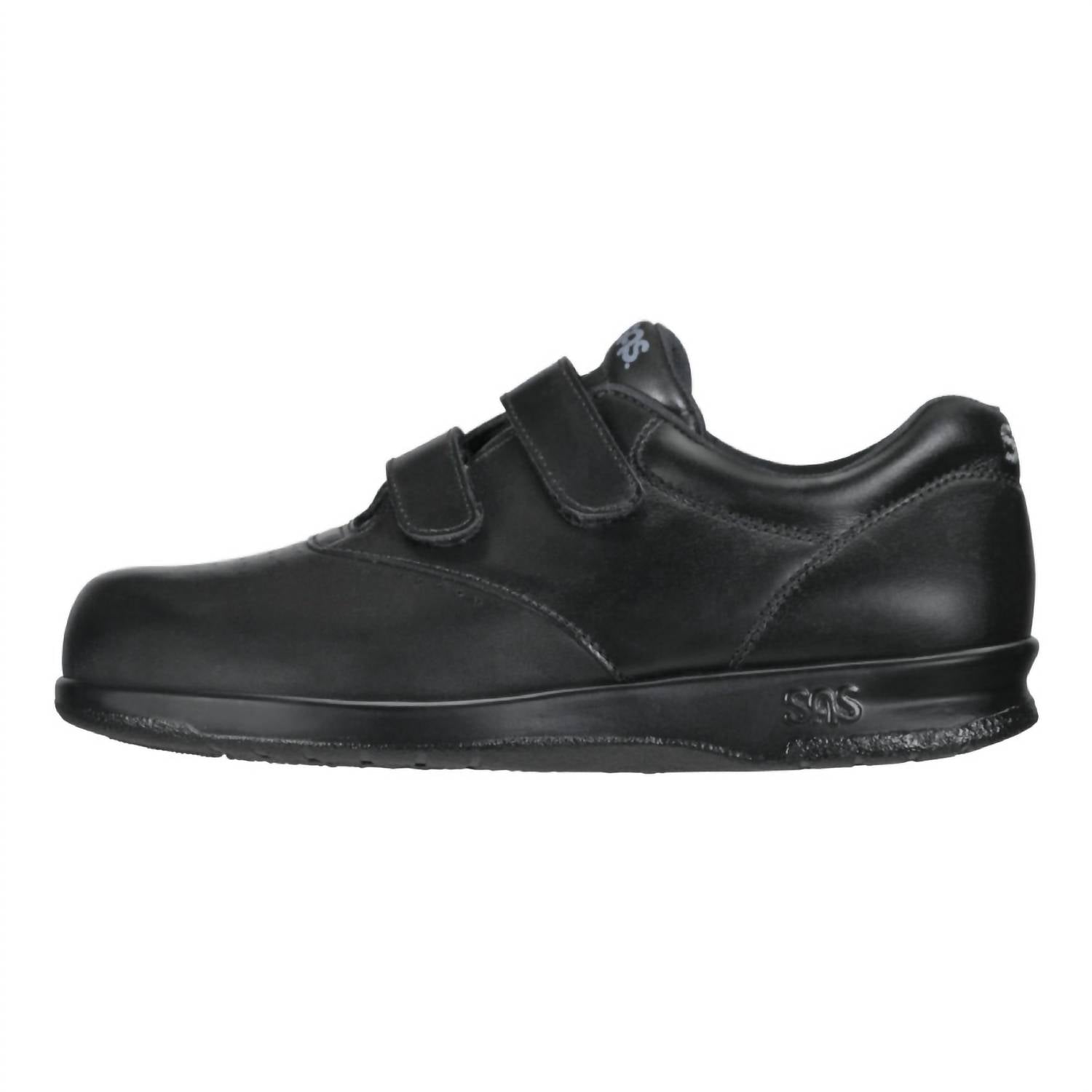 Experience unparalleled comfort with the Women's Me Too Walking Shoes by SAS in sleek black leather. These active sneakers feature adjustable EZ Straps for a customizable fit and a removable CoolStep™ footbed that ensures dryness and comfort throughout the day. The design encompasses SAS Tripad® cushions targeting your foot's pressure points, a shock-absorbing sole, extra toe room, and added depth for enhanced comfort. Perfect for spring travels or a minimalist look for Thanksgiving outings, these shoes boast a flat heel height of 1.25 inches.