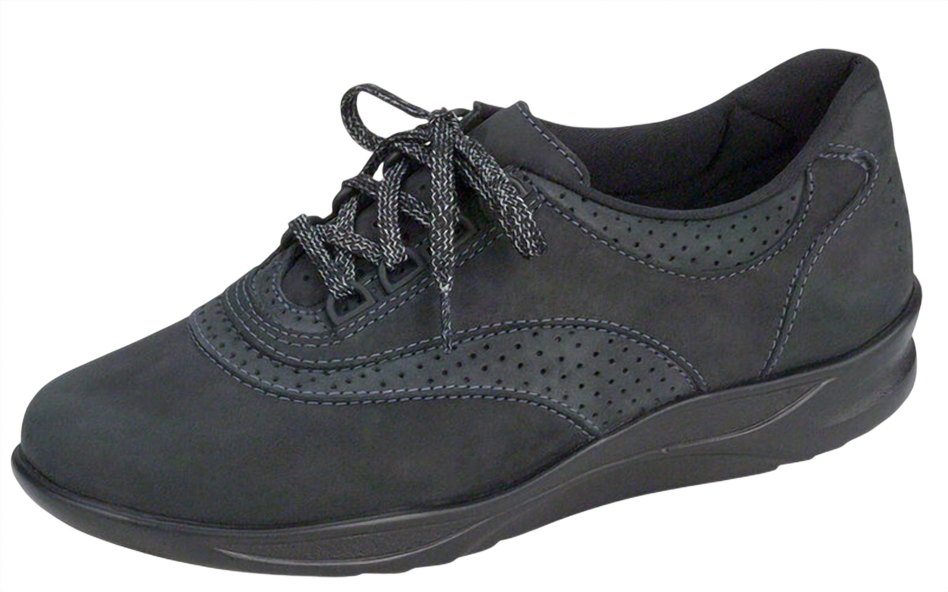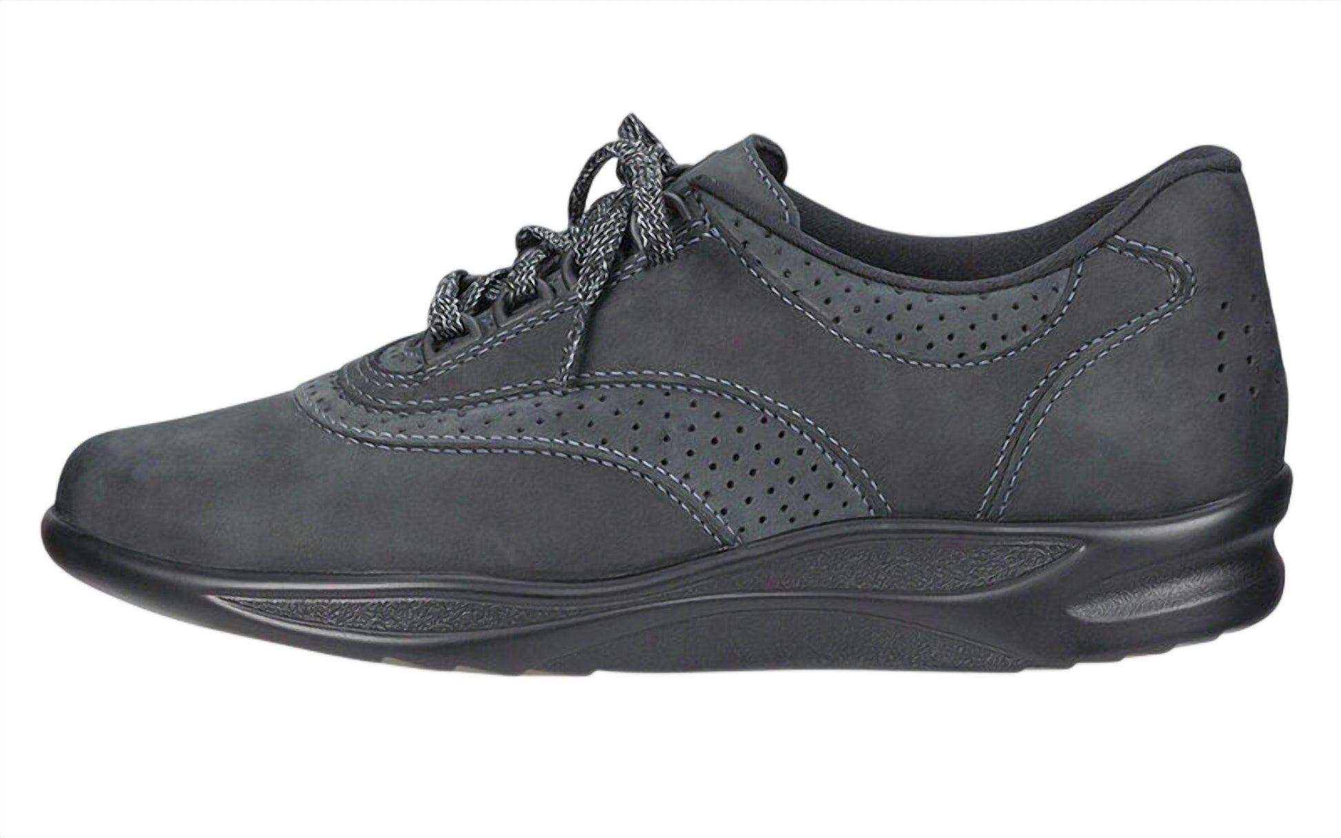 Cute, functional, and comfortable. These sneakers check all the boxes. Step into comfort and style with the Women's Walk Easy Walking Shoe by SAS, perfect for summer travel adventures. Featuring a minimalist design in Nero, this sneaker showcases a low heel of 1.375 inches for subtle elevation and supportive comfort. The round toe shape combined with its lightweight build makes it an ideal choice for everyday wear. Embrace the essence of relaxed yet polished footwear with this versatile pair.
