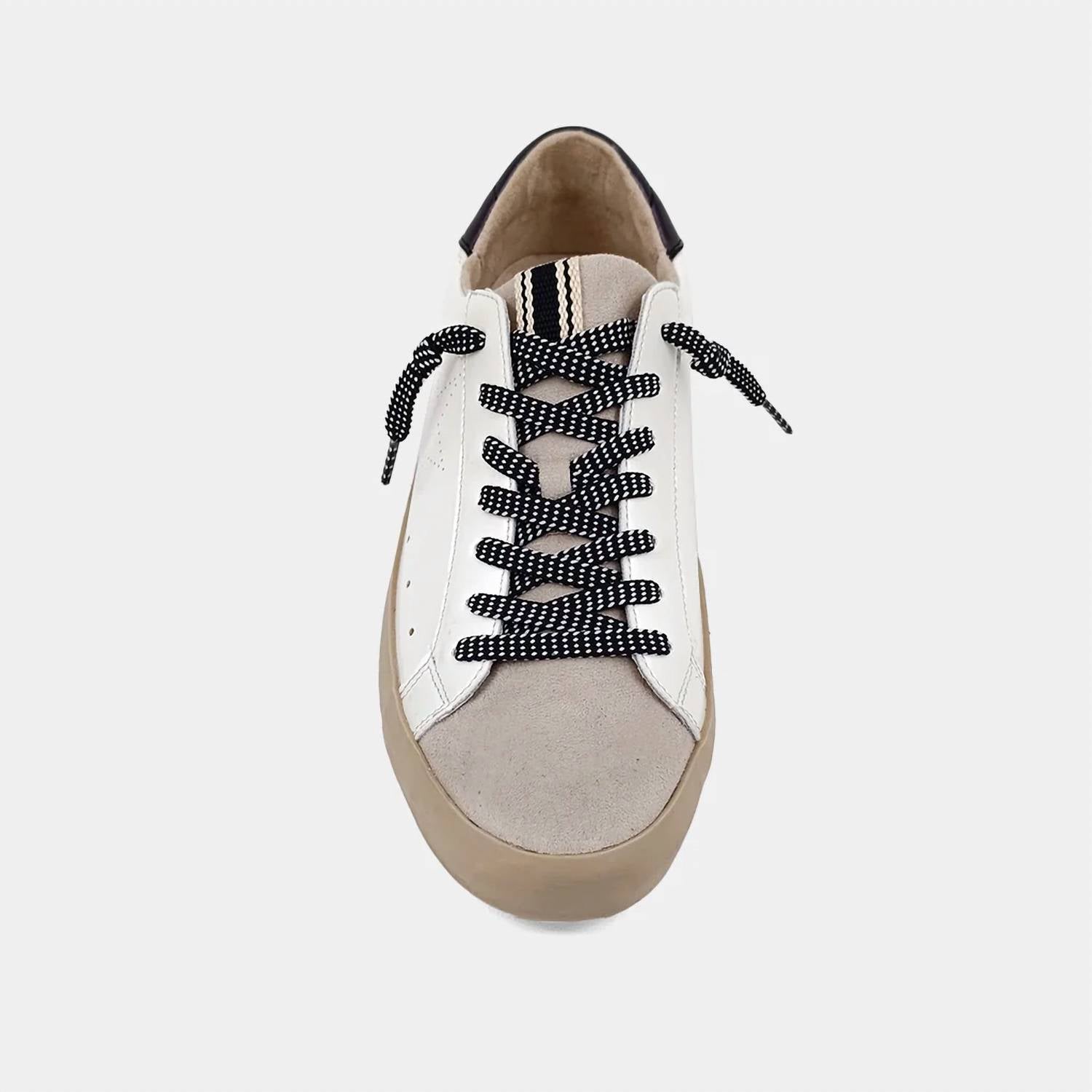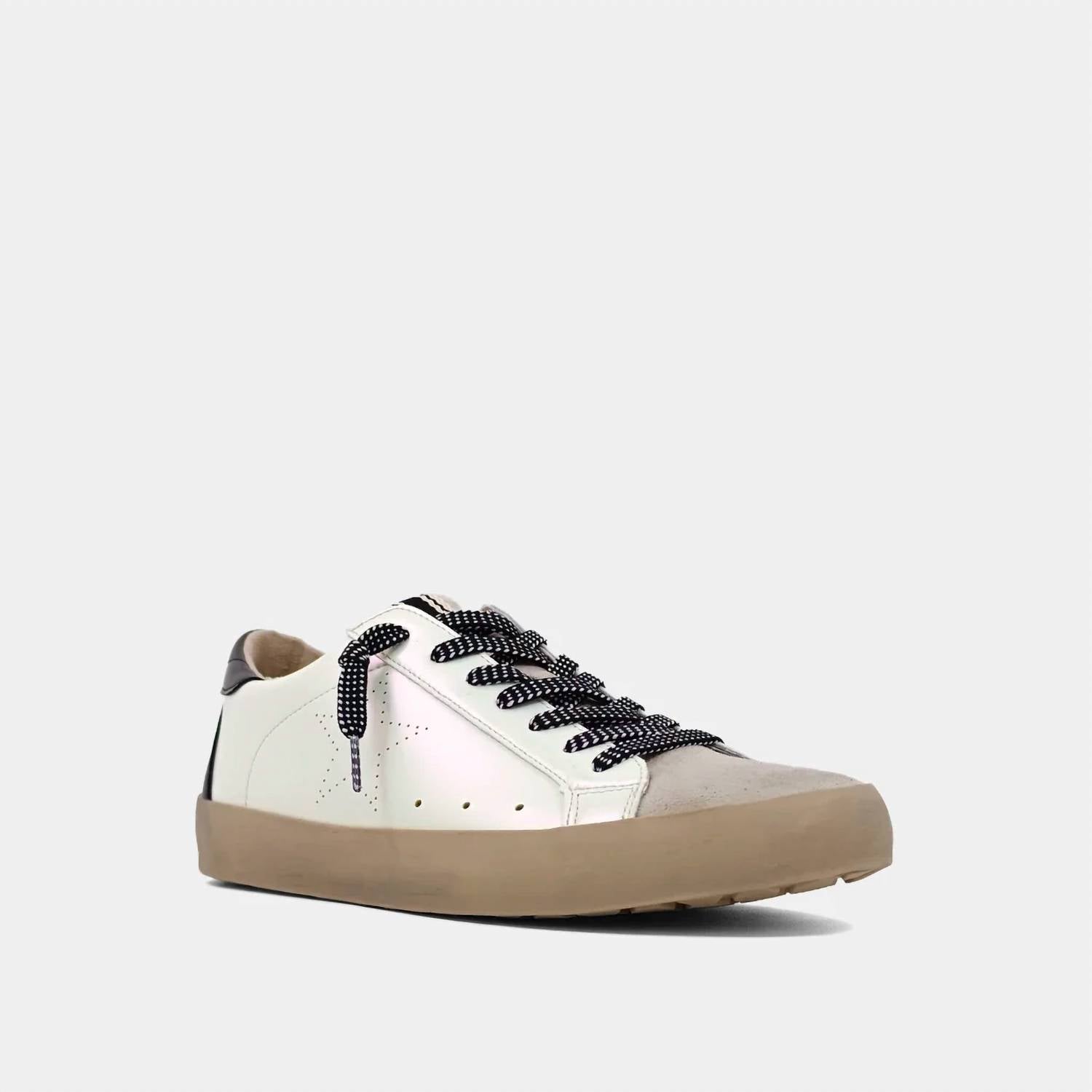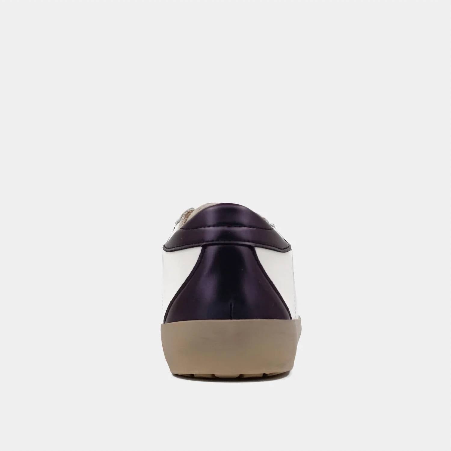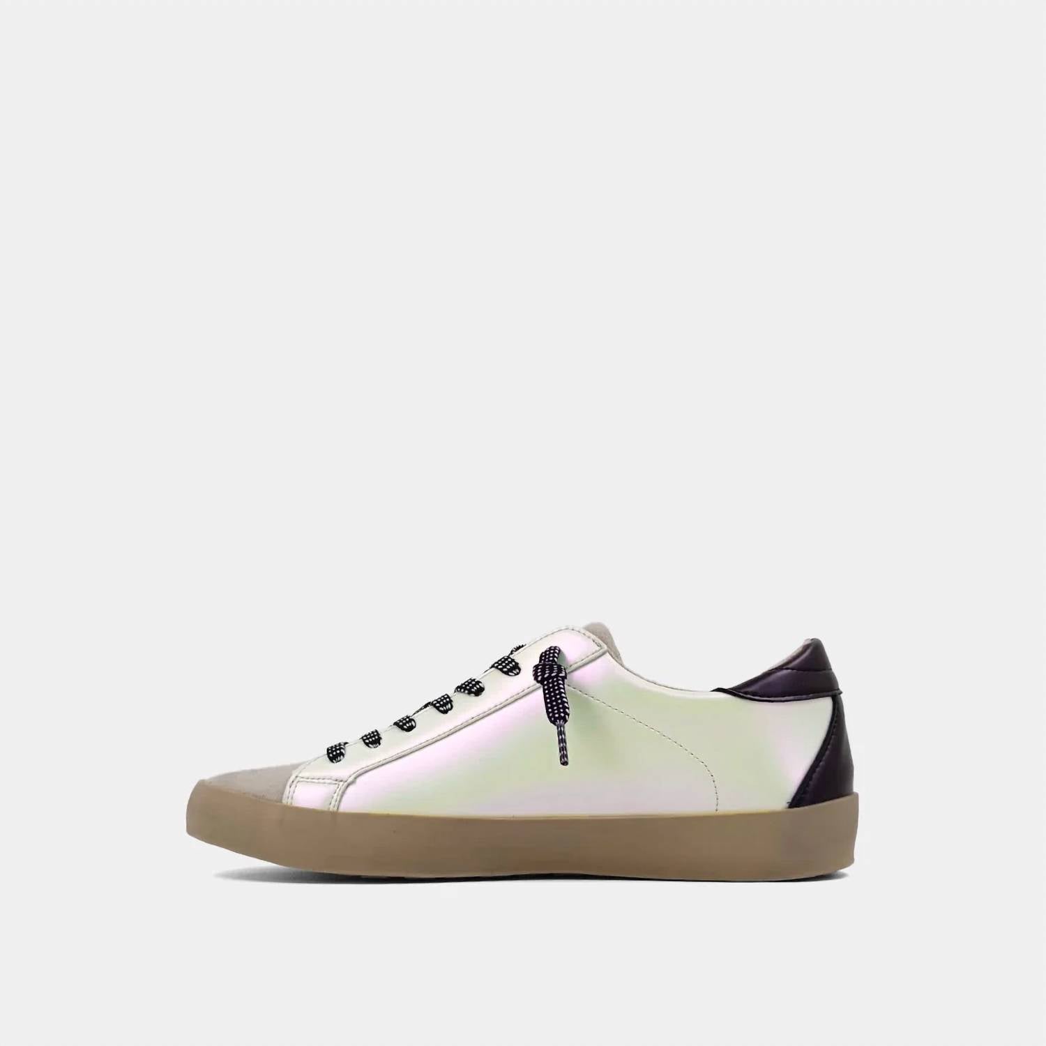 When fashion and function come together seamlessly. Introducing the Women's Mia Sneaker by SHU SHOP, crafted in a chic metallic white faux leather with stylish suede accents. The flat heel and round toe design ensure comfort while adding a touch of streetwear flair suitable for spring travel. These sneakers boast a sturdy sole and textured panels, making them a perfect choice for casual outings. Versatile and durable, these shoes effortlessly elevate any outfit.