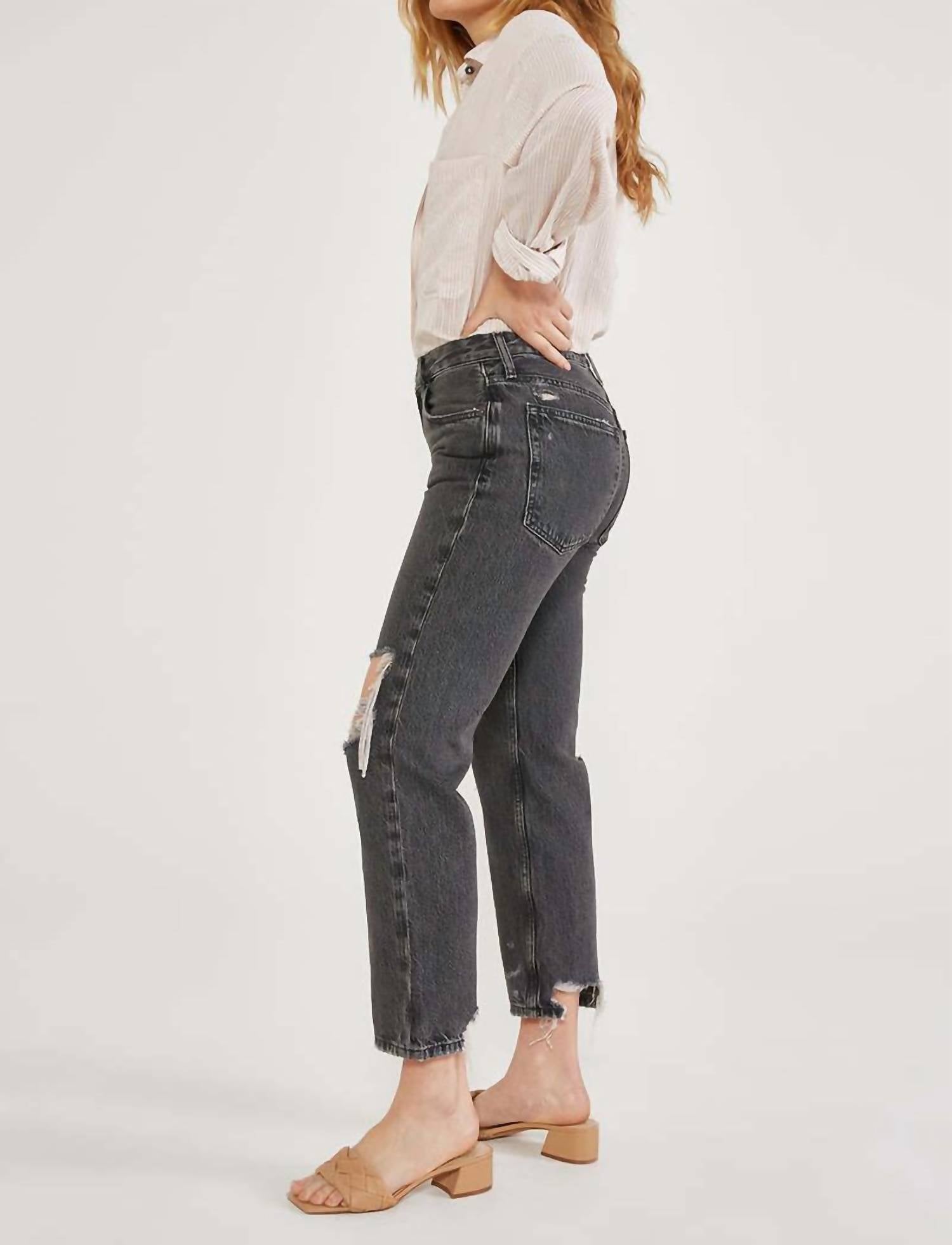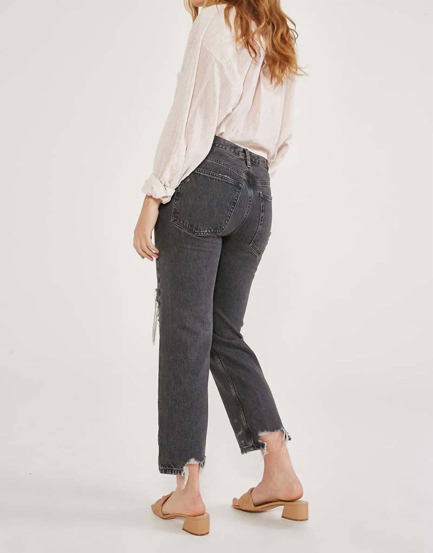 Introducing the Rhea Midrise Straight Crop Jean by ÉTICA, crafted from a vintage-inspired deep grey denim with a hint of destruction for authentic character. This stylish piece offers a clean straight fit with a mid rise of 10.5 inches, a 26.5-inch inseam, and a 15-inch leg opening, ensuring comfort and a flattering silhouette. Composition is 77% Cotton and 23% Refibra Tencel, and it features convenient zip closure and pockets. Care: Machine wash cold with like colors, line dry, do not bleach, and warm iron if needed. Model is wearing a size 27.