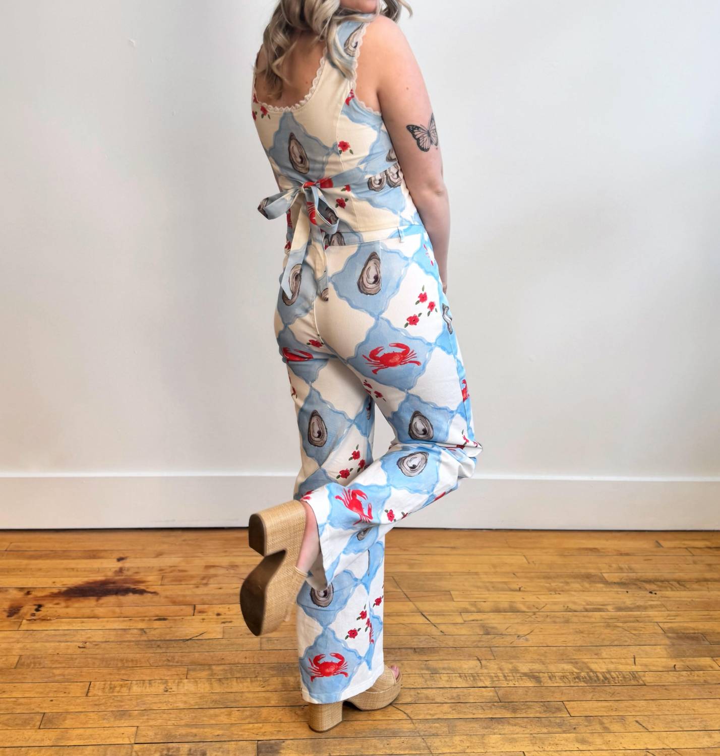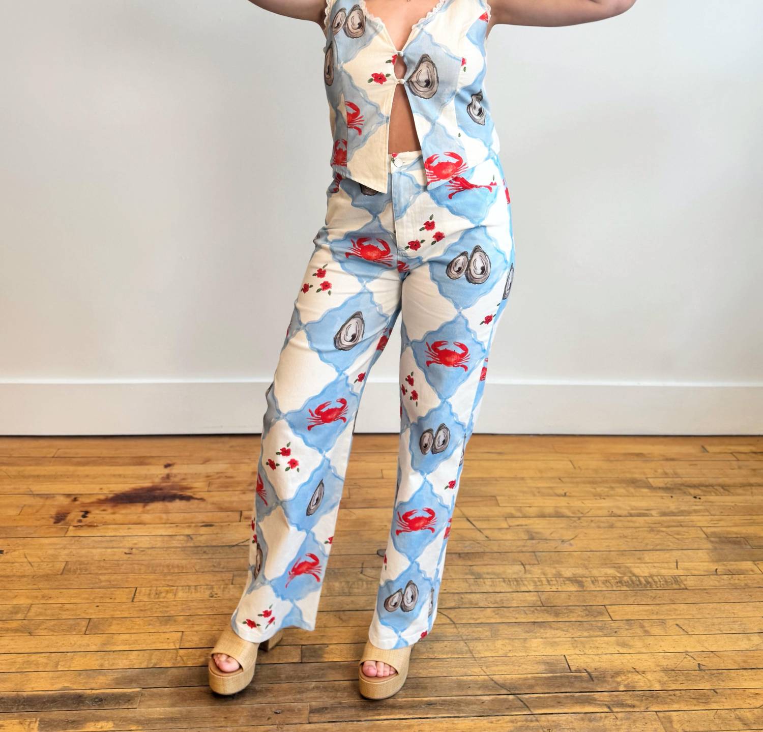 These must-have jeans are fit to perfection. Experience the vibrant energy of seaside inspirations with the Bailey Rose Coastal Charm Jeans in Blue Multi. These straight-leg pants feature a playful, patterned design with florals, oysters, and crabs, perfect for adding a touch of fun to your summer attire. Made from a comfortable cotton blend, they include pockets for convenience and a zip closure for easy wear. Composition: 97% Cotton, 3% Spandex, with 100% Polyester Lining. Made in China, these jeans should be hand washed cold to maintain their charm.