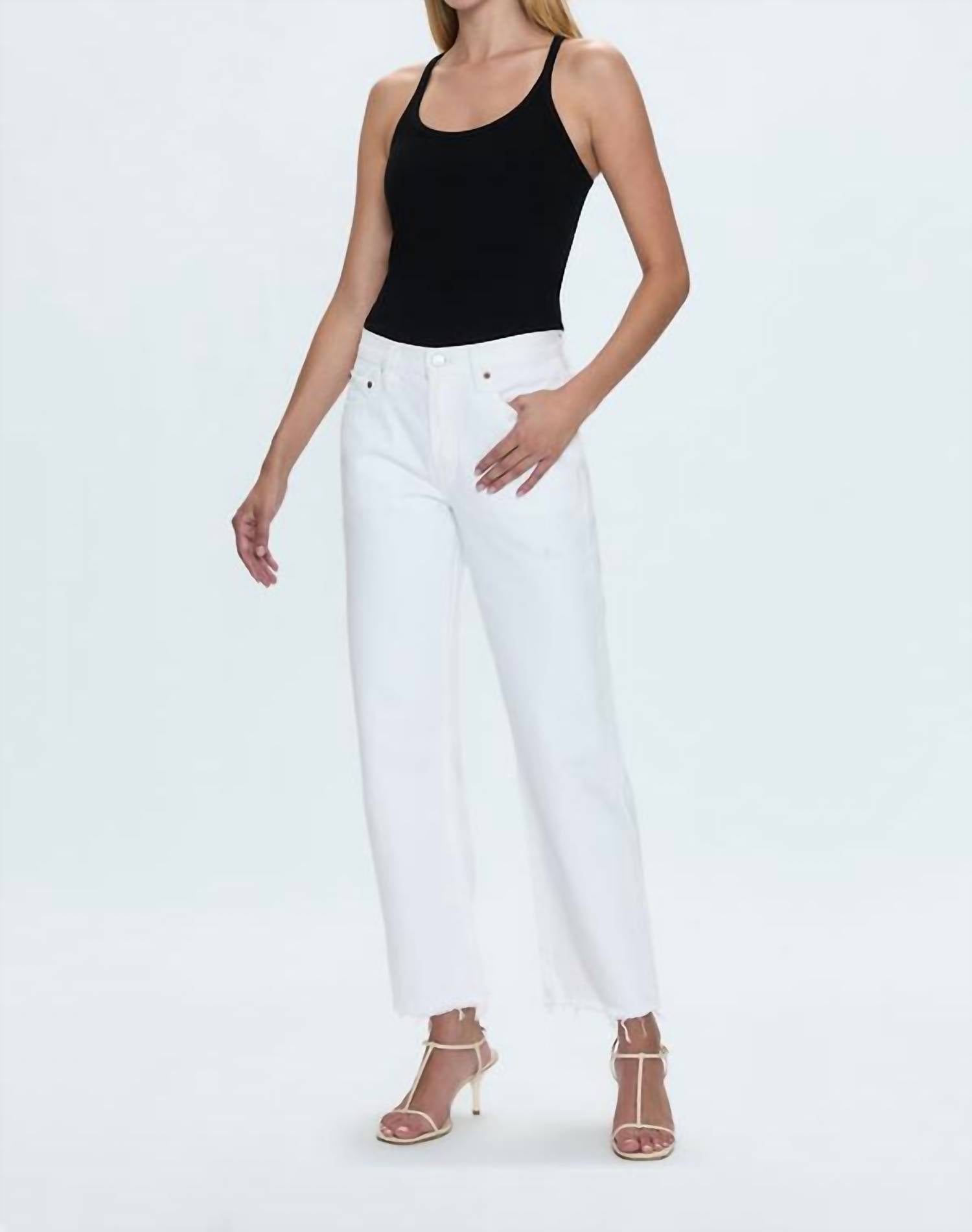 Pair these straight leg jeans with flats, sandals or even heels! You can't go wrong. Elevate your spring wardrobe with PISTOLA's Mid Rise Bowed Straight Jean in timeless white, perfect for any minimalist occasion. Designed with a classic fit, these jeans feature a solid pattern and practical pockets, offering style and functionality for casual dinners or festive gatherings. Closure: Button closure. Care: Machine wash, tumble dry.