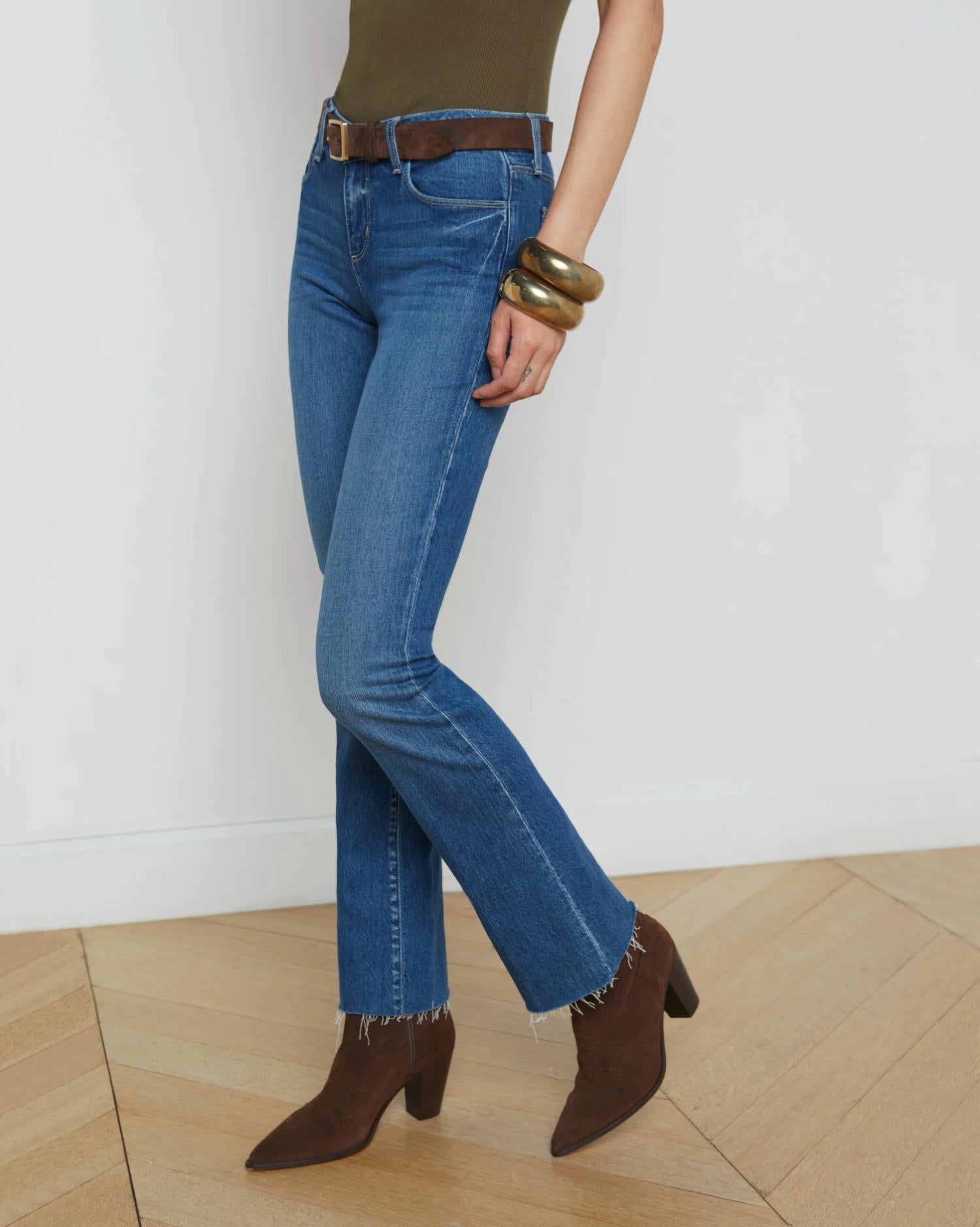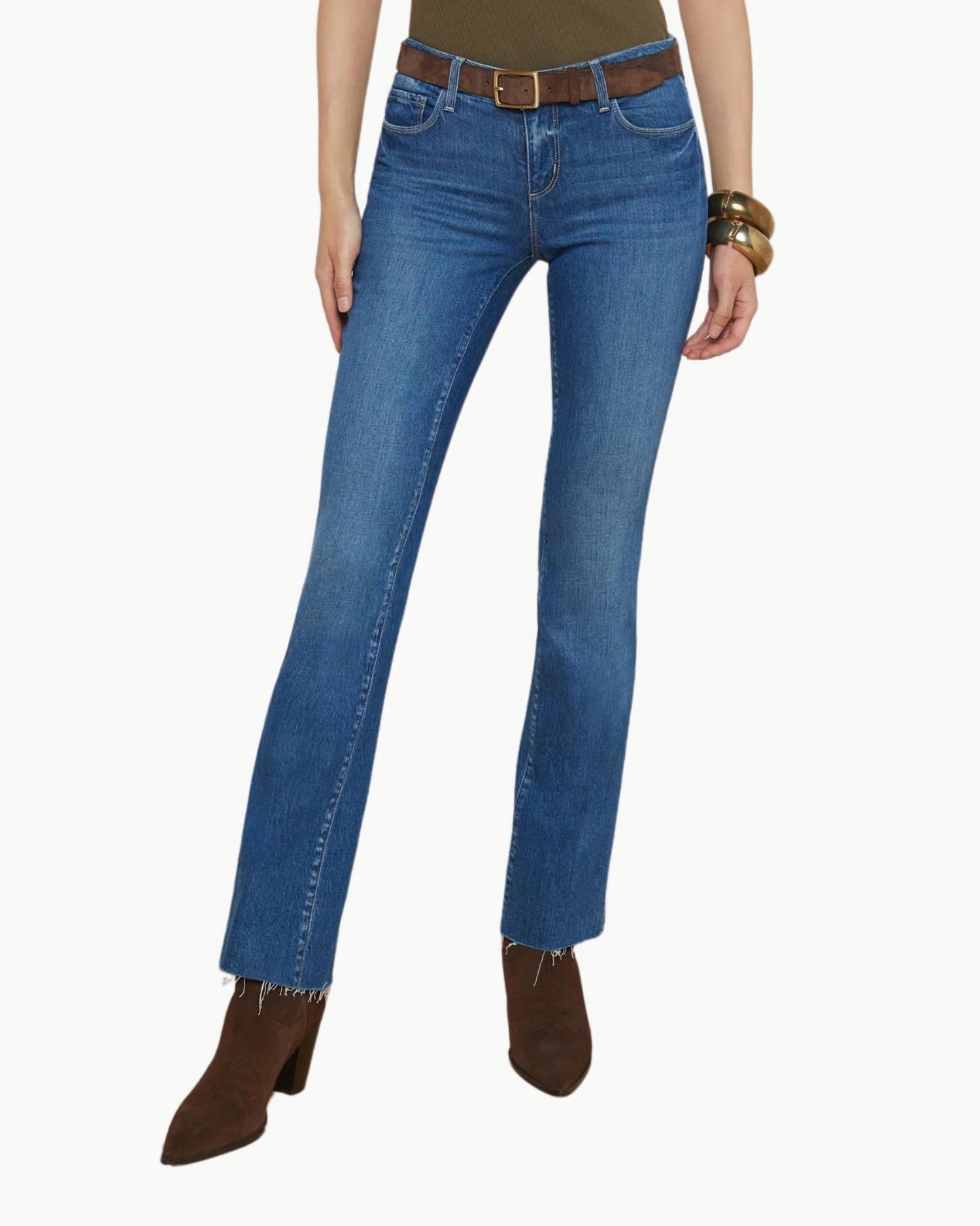 This classic straight leg jean has a perfect fit and goes with just about everything. Introducing the Sneeki Low-rise Straight-leg Jean by L'Agence, designed in a chic Stockton shade for a minimalist edge. Crafted from premium stretch denim, these jeans feature a low-rise waist and straight-leg silhouette, complete with a raw hem and a classic five-pocket design. The zip fly and button closure add to its sleek appearance, accompanied by a comfortable 32-inch inseam. Perfect for a dinner party, this solid pattern piece effortlessly blends style and versatility.