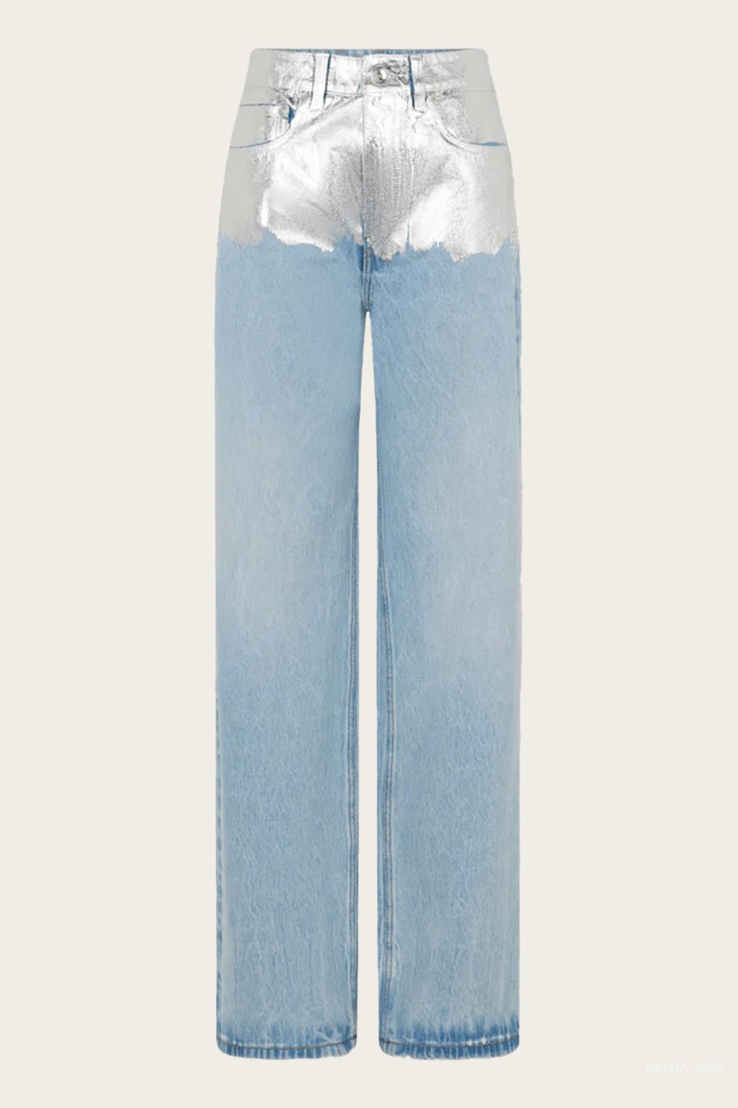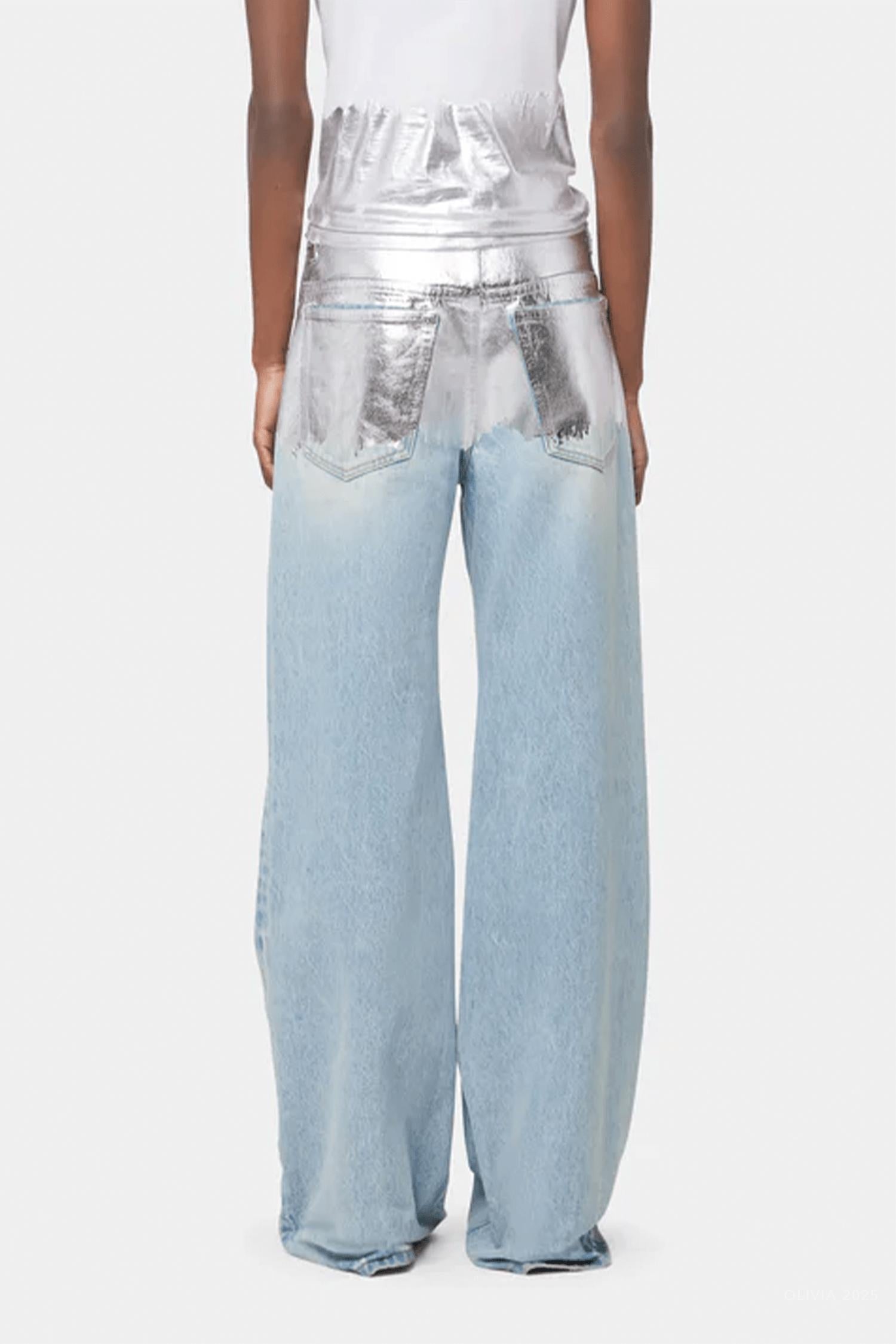 This classic straight leg jean has a perfect fit and goes with just about everything. Introducing the Metallic Baggy Trouser Denim by Rabanne, this light denim blue piece combines premium fabrication with Italian craftsmanship. Designed without a traditional closure, the trousers feature a convenient pull-on style. Ideal for adding a touch of effortless sophistication to any outfit.