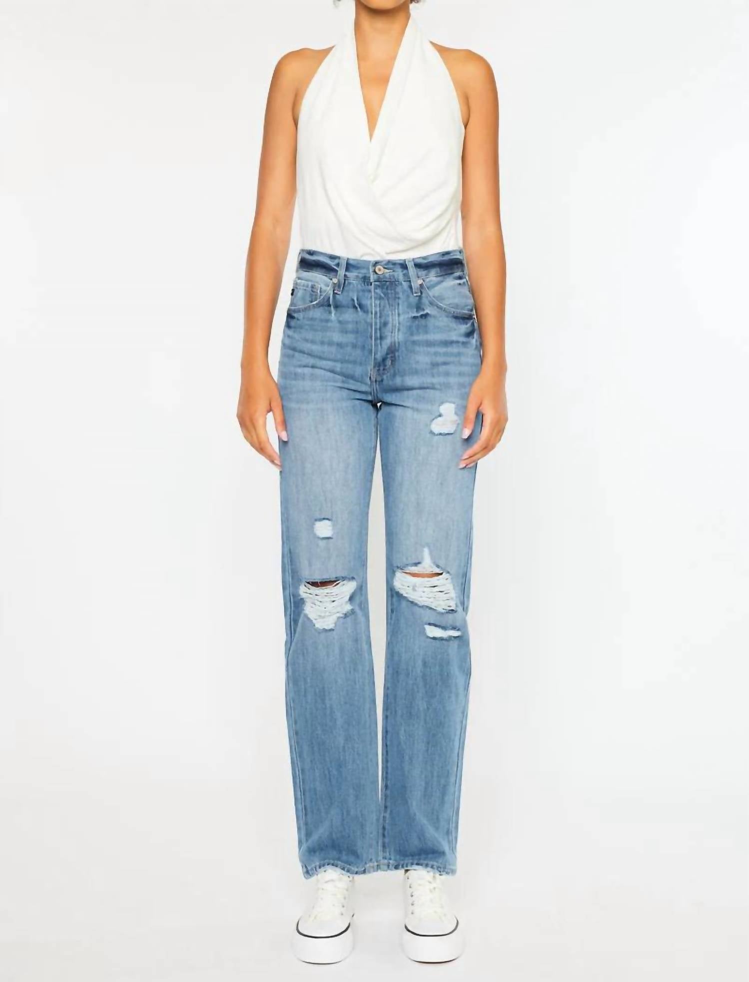 Pair these straight leg jeans with flats, sandals or even heels! You can't go wrong. Step into effortless 90s style with the Hattie High Rise 90's Straight Leg Jeans by KanCan, perfect for summer concerts. These medium-washed blue jeans boast a straight-leg silhouette with a high-rise 12-inch rise and a 31-inch inseam, accentuated by a tattered knee detail and gentle fade. Crafted from 100% cotton, they feature a classic five-pocket design and a hidden five-button front closure for a seamless look. Care instructions include machine washing. Model is wearing size 25.