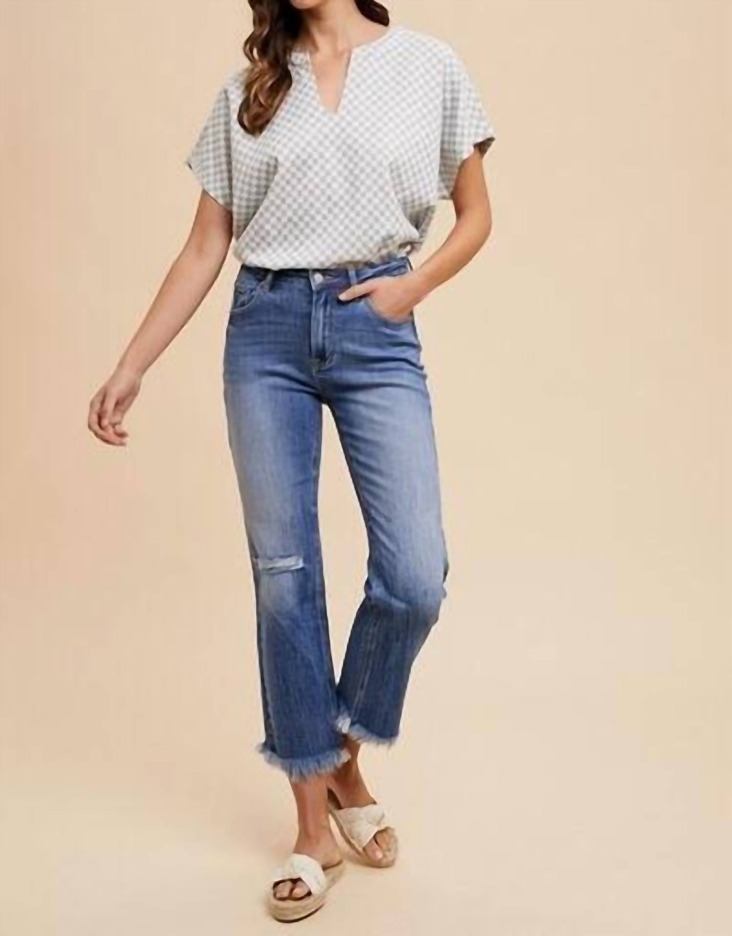 Pair these straight leg jeans with flats, sandals or even heels! You can't go wrong. Introducing the Distressed Straight Leg Jeans by AnnieWear, perfect for those seeking a sleek and modern edge. These jeans feature a cropped length with straight leg cut and distressed raw hem for a fashionable, rugged look. Crafted from a slightly stretchy cotton blend with 95% cotton, 3.5% polyester, and 1.5% spandex, they offer both comfort and style. Button closure. Machine wash cold, tumble dry low. Made in China, these medium wash jeans come with pockets for added practicality.