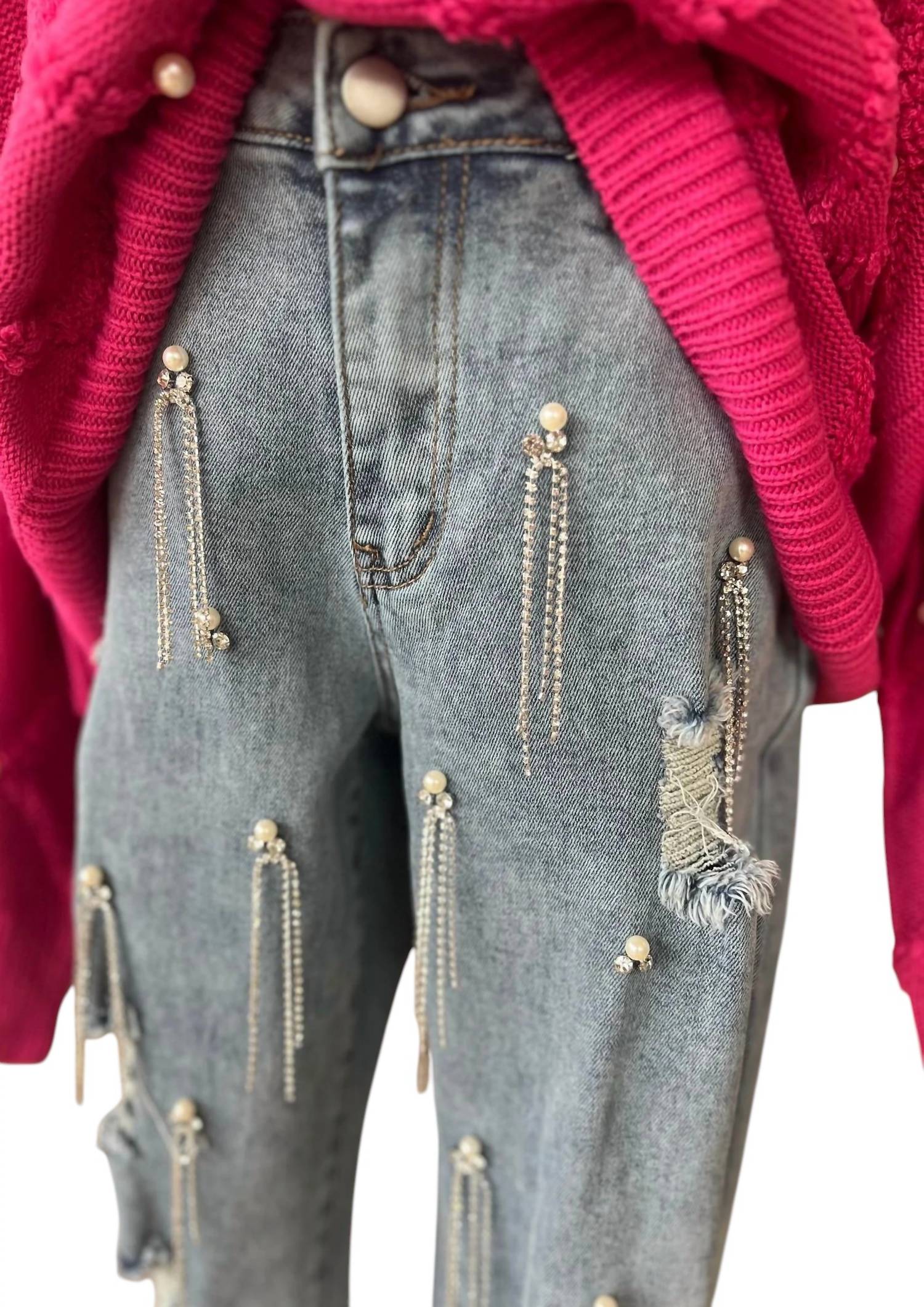 This classic straight leg jean has a perfect fit and goes with just about everything. Elevate your ensemble with the Women's Vip Floor Seats Jeans by Blue B, where high-waisted style meets glamorous detailing. Crafted from light wash denim, these jeans feature intricate jewel and rhinestone fringe embellishments for a striking appearance. Enjoy the relaxed fit of the straight leg design, complemented by a button closure and functional pockets. Perfect for travel and fall occasions, this is an effortless way to add sparkle and 90s fashion flair to your wardrobe.
