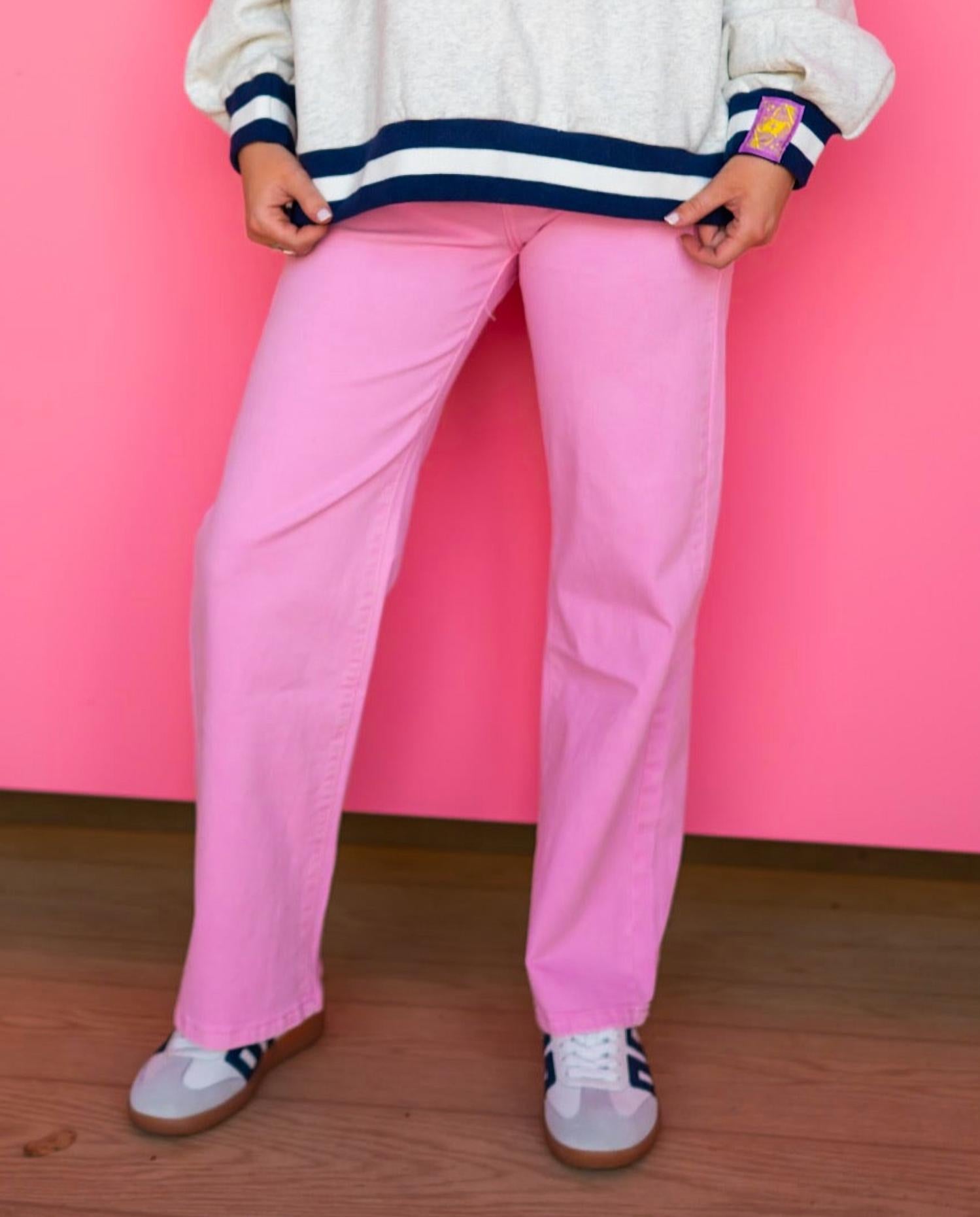 These must-have jeans are fit to perfection. Introducing the Light Pink Denim Pants by Q2, designed for a chic and comfortable experience. These pants are crafted from solid denim, featuring a regular fit with a flattering mid-rise and straight leg style. Closure: Pull-on, complementing its versatile design. Care: Machine wash and tumble dry for easy maintenance. Model Avery is wearing size XS (5'3”, waist 24/25”, 110lbs, bust 32/33”).