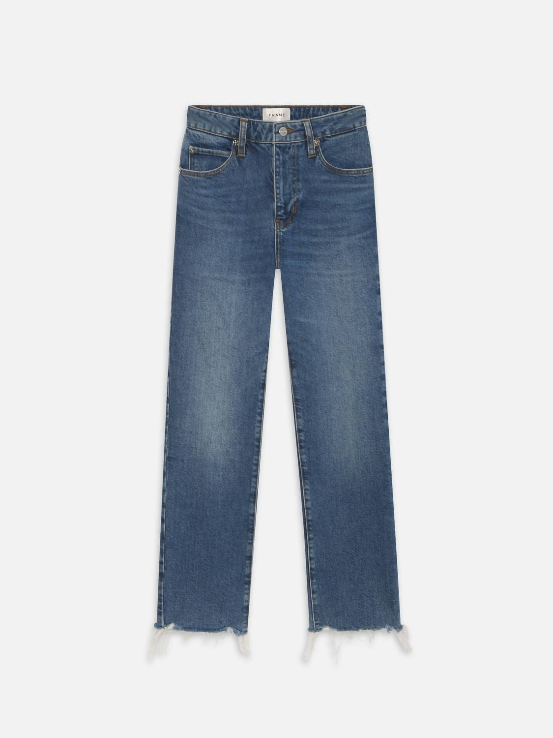 These must-have jeans are fit to perfection. Discover the Women's The Ruler Crop Jeans by FRAME, a fashionable staple in a medium-blue wash perfect for your warm-weather wardrobe. Designed with a high-rise, slim-straight leg and a cropped, frayed hem, these jeans offer a classic fit with the comfort of stretch denim. Featuring a solid pattern and a zip closure, they effortlessly complement any streetwear or vacation occasion. Available in sizes 24 to 30, these jeans are crafted without pockets for a sleek, streamlined look.