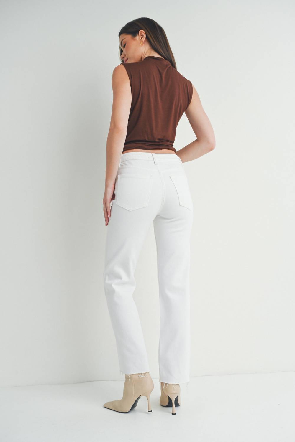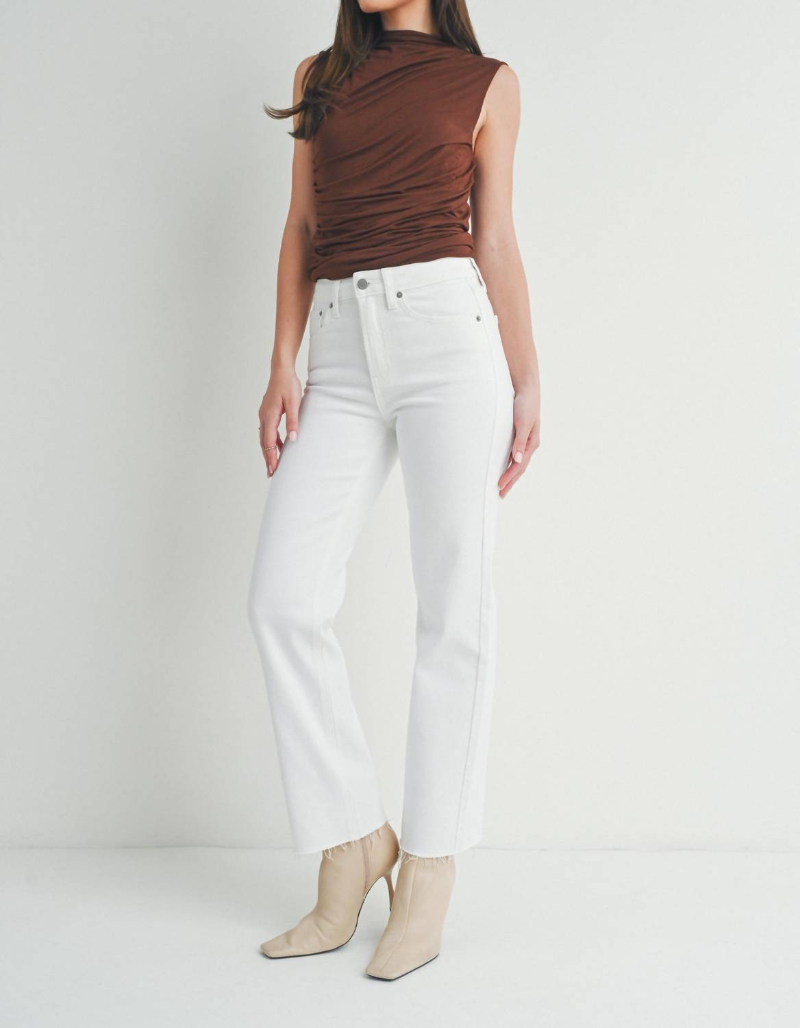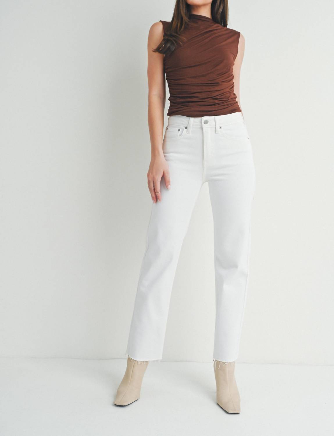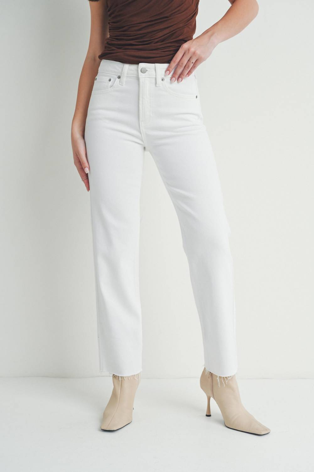 Pair these straight leg jeans with flats, sandals or even heels! You can't go wrong. Elevate your summer style with the JUST USA Summer Relaxed Fit Raw Hem Straight Jeans in classic white. These jeans, crafted from a comfortable Cotton, Elastrell, And Spandex, feature a high-rise fit with a rise of 10.5" and an inseam of 27", perfectly complementing their relaxed-fit silhouette. Designed with straight legs, they include classic five-pocket styling and a button closure for everyday ease. Embrace minimalist elegance with these versatile jeans, machine washable for effortless care.