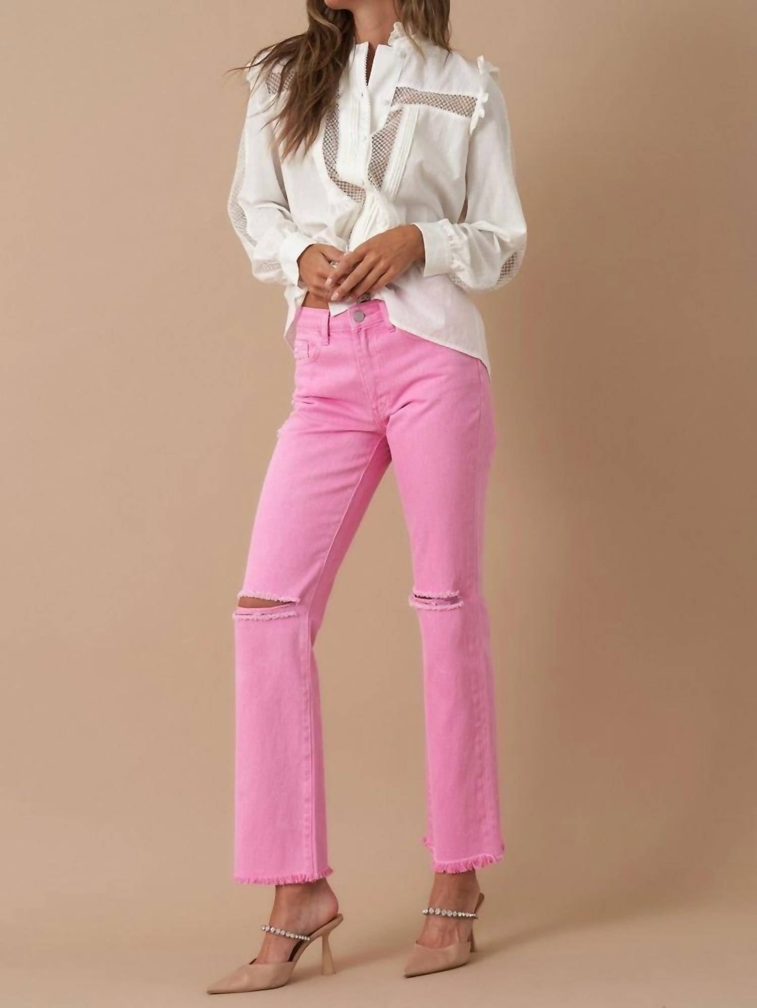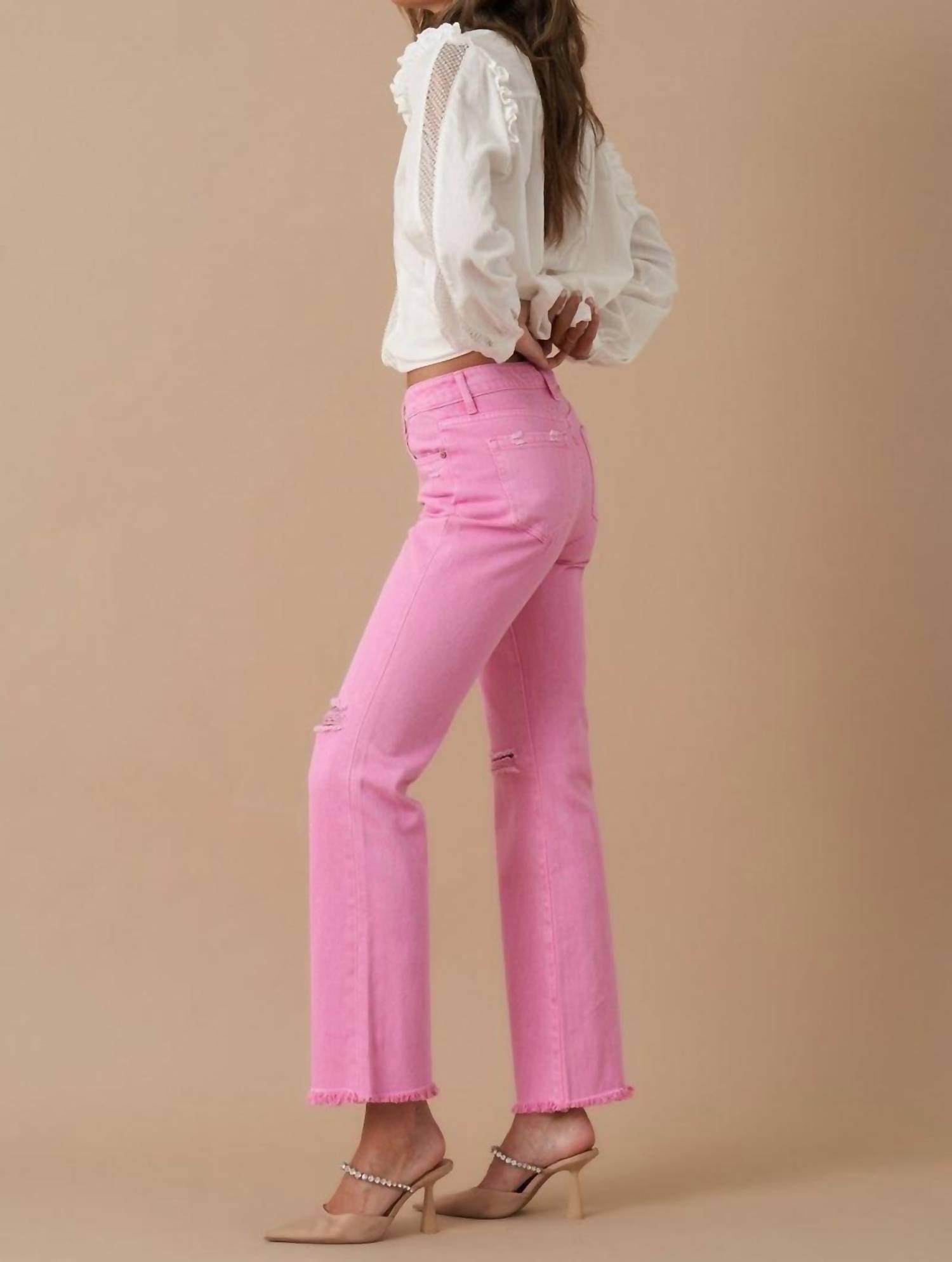 These must-have jeans are fit to perfection. Introducing the High Rise Slim Straight Jeans by Insane Gene, a perfect way to invigorate your wardrobe with a splash of pink. These women's jeans are made from 100% cotton, offering a comfortable slim fit and a light-washed color for that relaxed, 90s fashion vibe. With a high-rise waist measuring 10 inches, button closure, and a straight leg style, they also feature distressed knees and five pockets for a trendy yet functional design. Care for them by machine washing, making these jeans an ideal choice for travel or a casual Valentine's Day outing. Model is wearing size 3/25 with measurements of height: 5'8", waist: 29 1/2", hip: 38 1/2", front rise: 10, leg opening: 18, and inseam: 29.