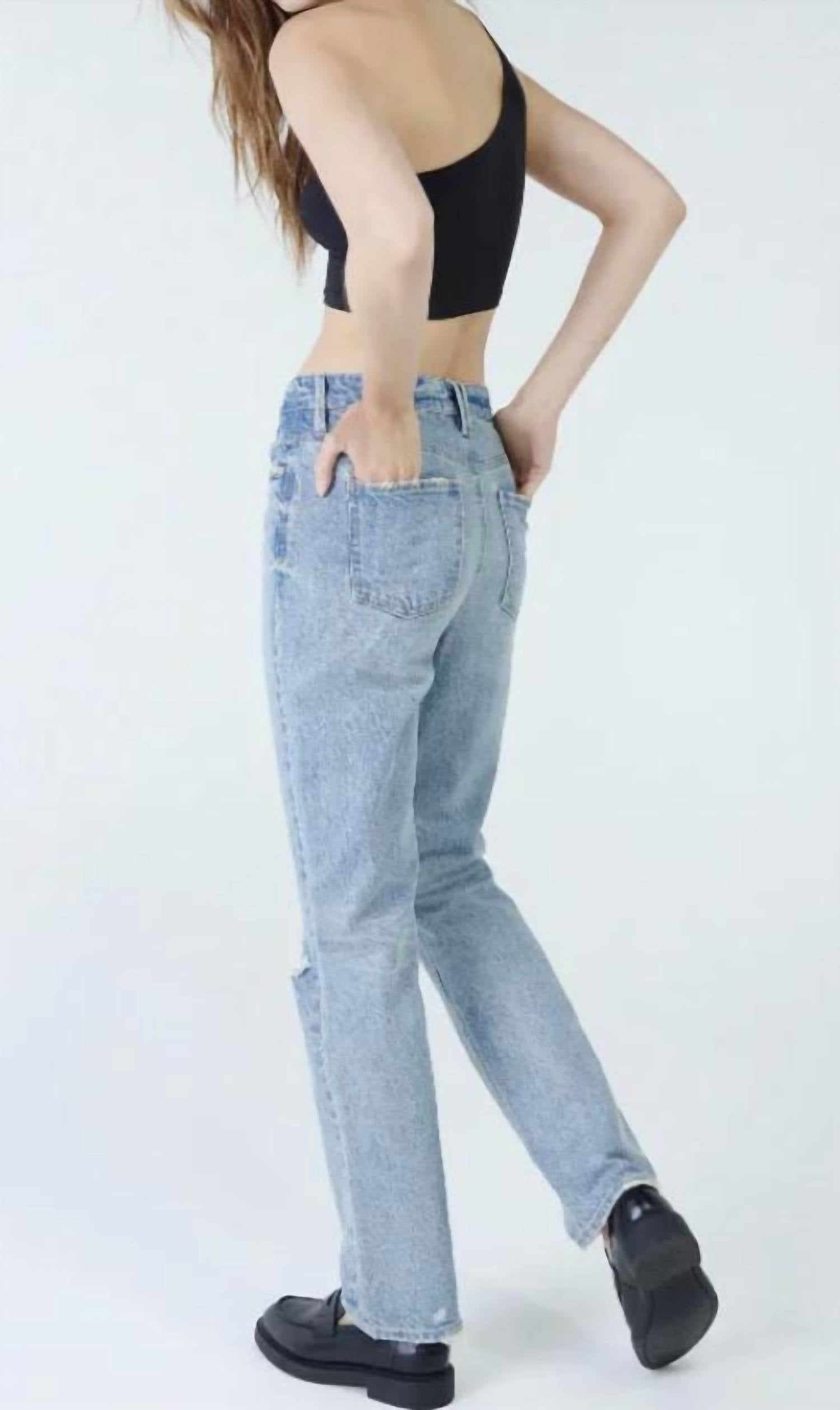 The must-have jean with an 11" rise, this style is made in comfort stretch denim that is fitted through the hips and falls into the ideal straight leg. Light wash denim featuring a blown-out knee detail for an everyday, chill look. 5-pocket styling with a button and zip fly closure.