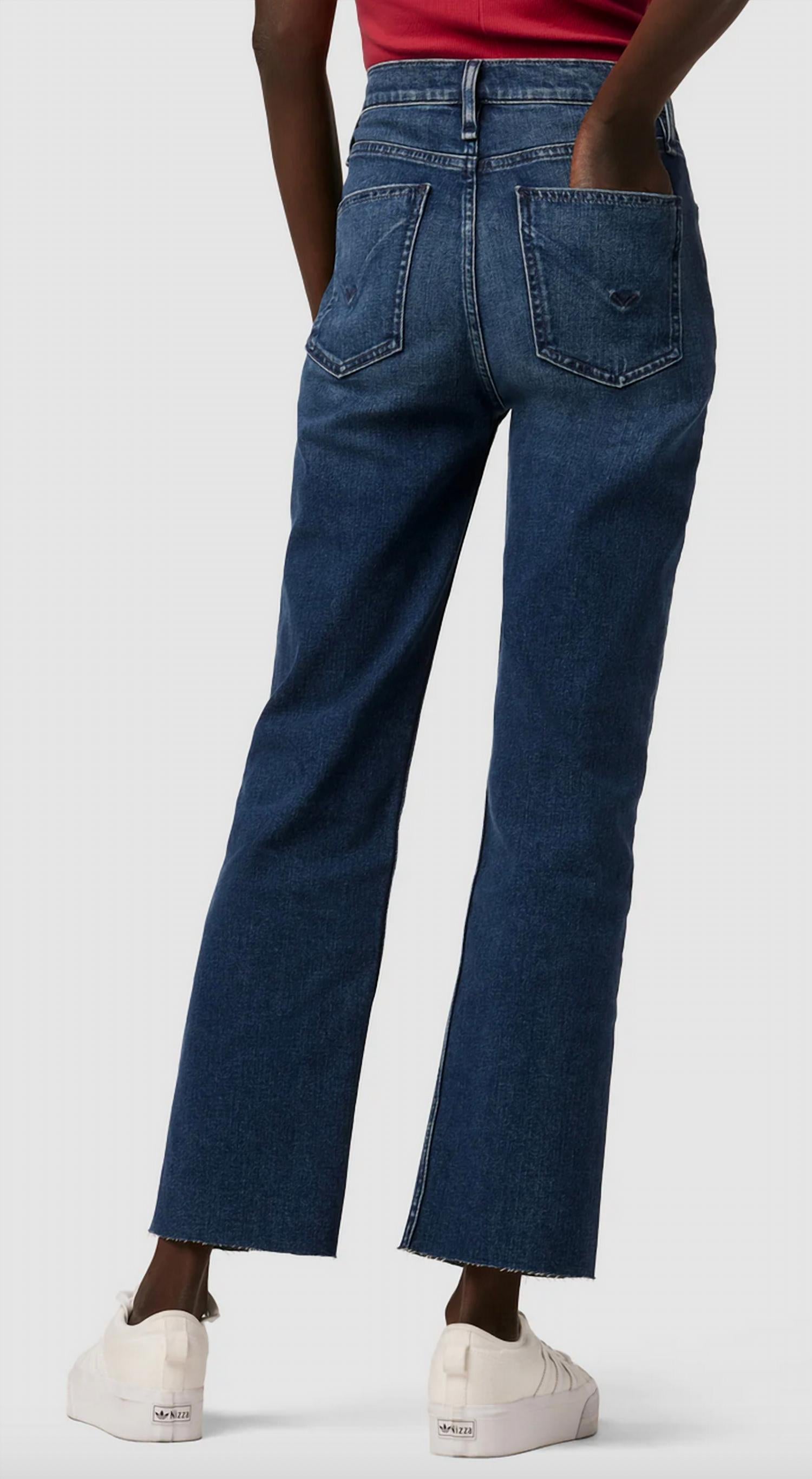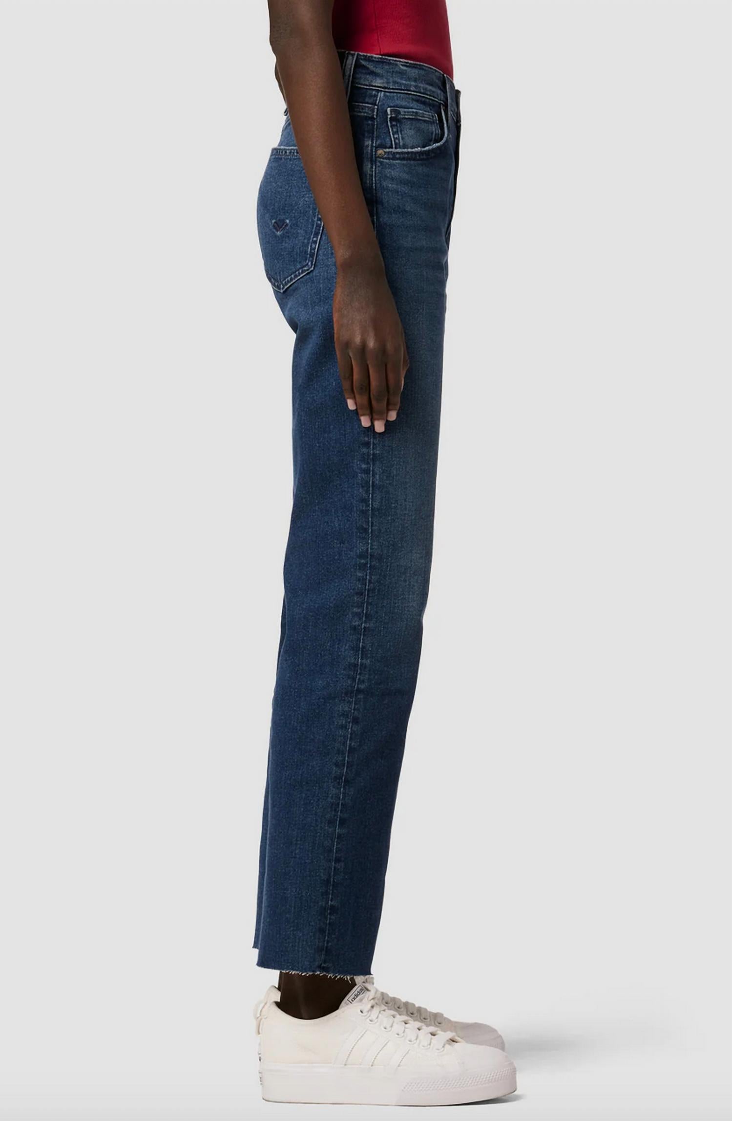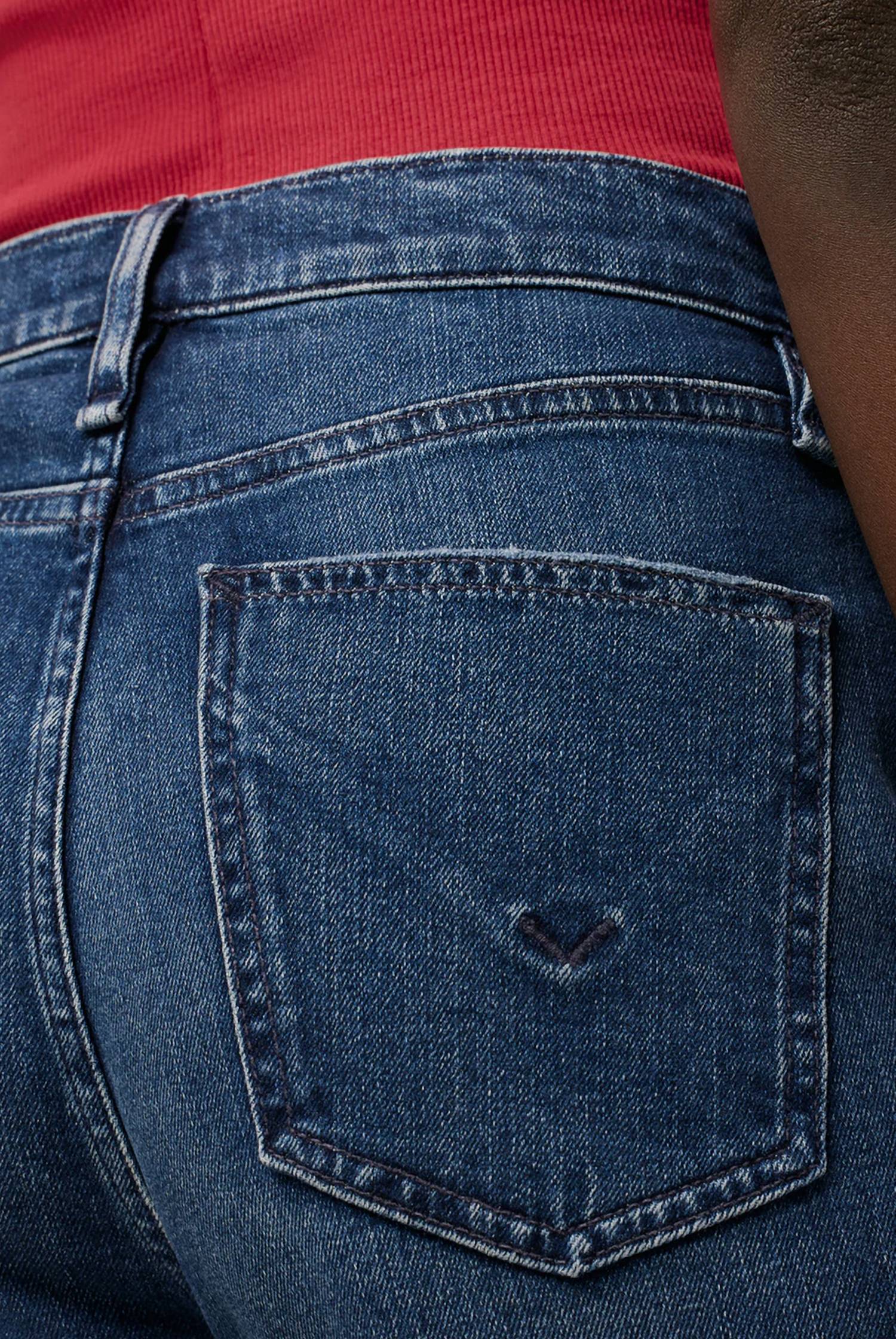 This Remi High-Rise Straight Ankle Jean is cut with a flattering high rise and relaxed leg. The medium blue Deep Dive wash has grinding along the edges, raw hems and is made from premium comfort stretch denim. Front Rise: 11.25", Leg Opening: 16.5", Inseam: 28". Model Height 5'9". Model wearing size 25. Measurements based on size 27. Content: 79% Cotton, 20% Polyester, 1% Elastane. Machine wash cold with like colors