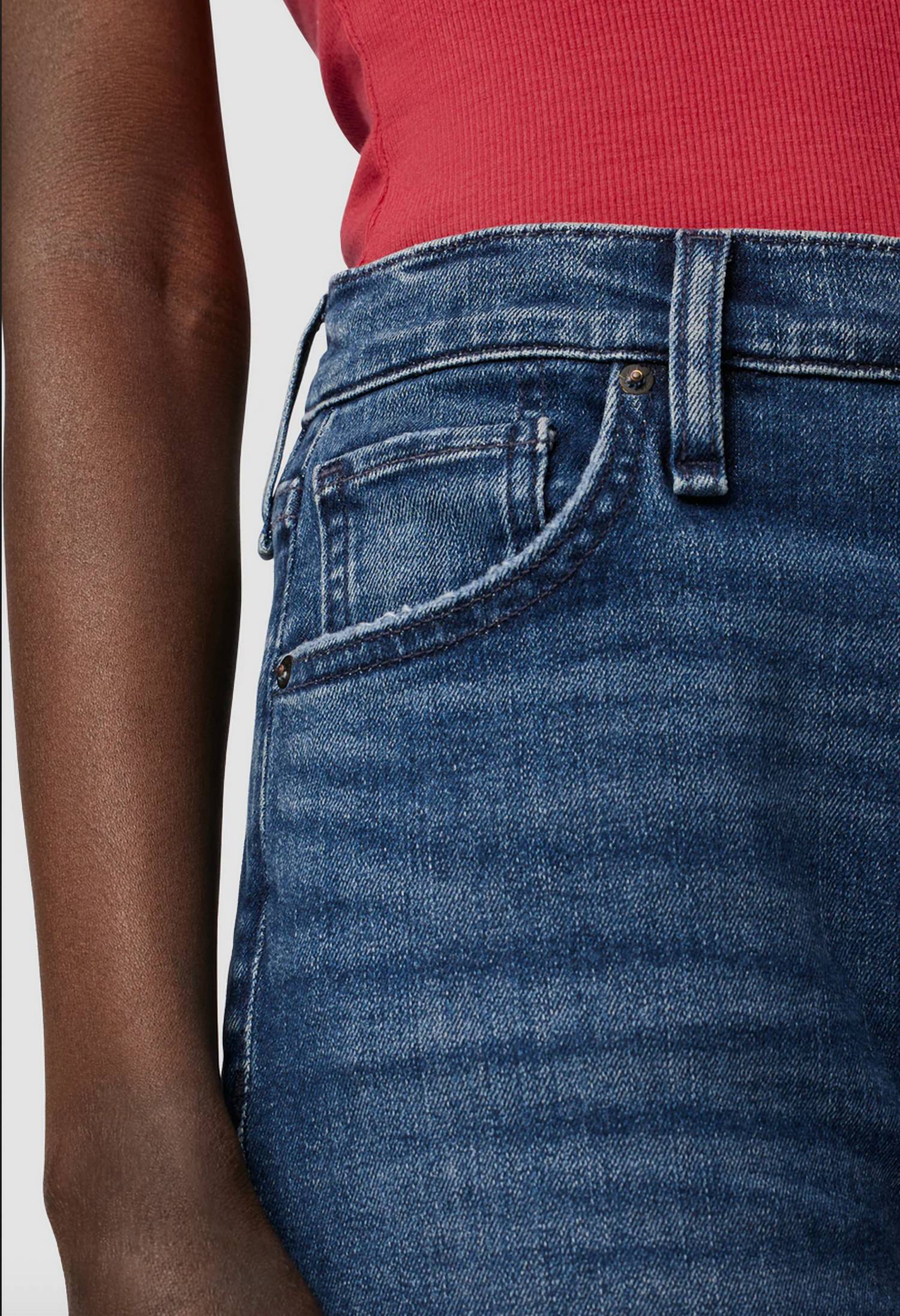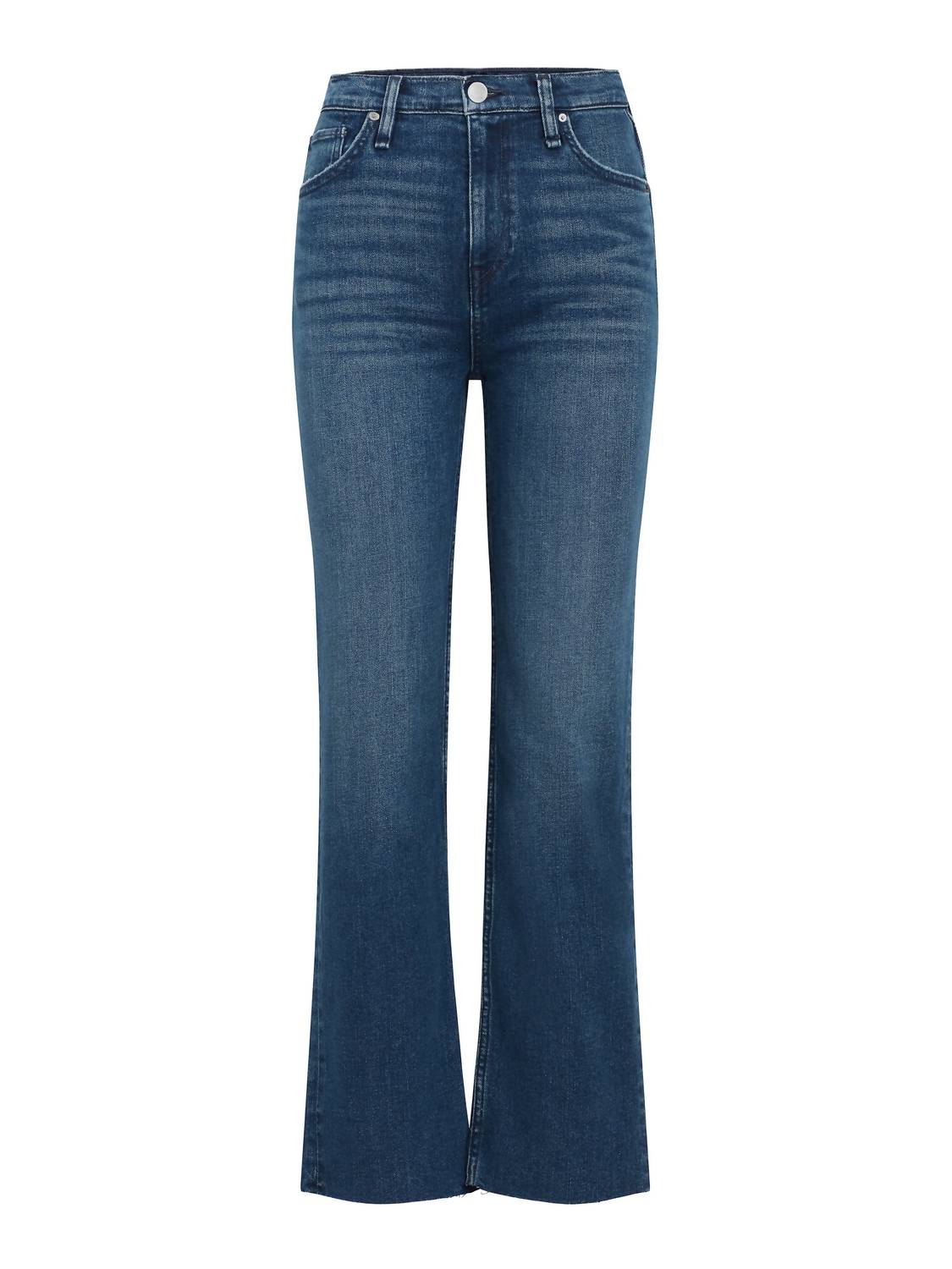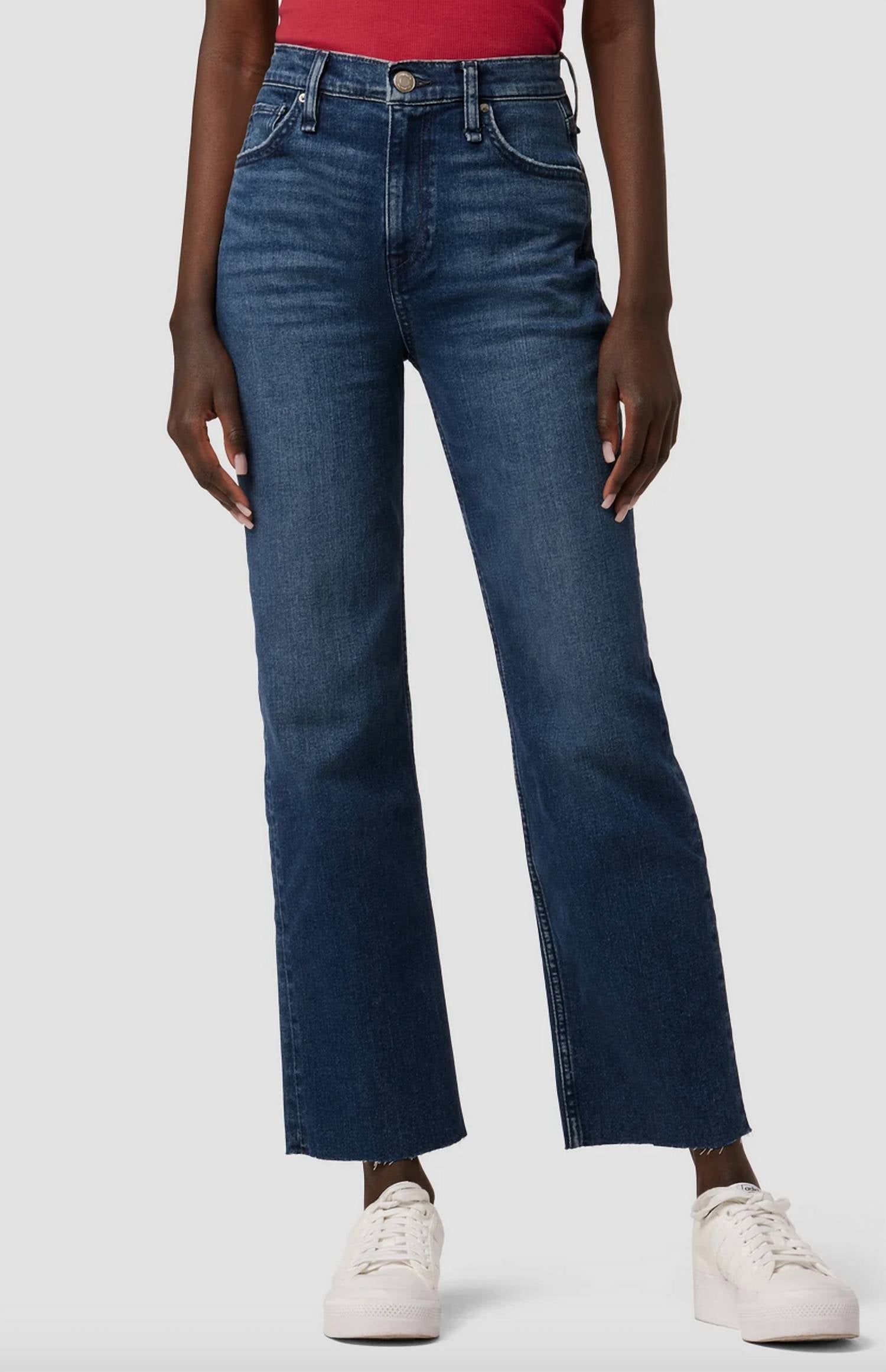 This Remi High-Rise Straight Ankle Jean is cut with a flattering high rise and relaxed leg. The medium blue Deep Dive wash has grinding along the edges, raw hems and is made from premium comfort stretch denim. Front Rise: 11.25", Leg Opening: 16.5", Inseam: 28". Model Height 5'9". Model wearing size 25. Measurements based on size 27. Content: 79% Cotton, 20% Polyester, 1% Elastane. Machine wash cold with like colors