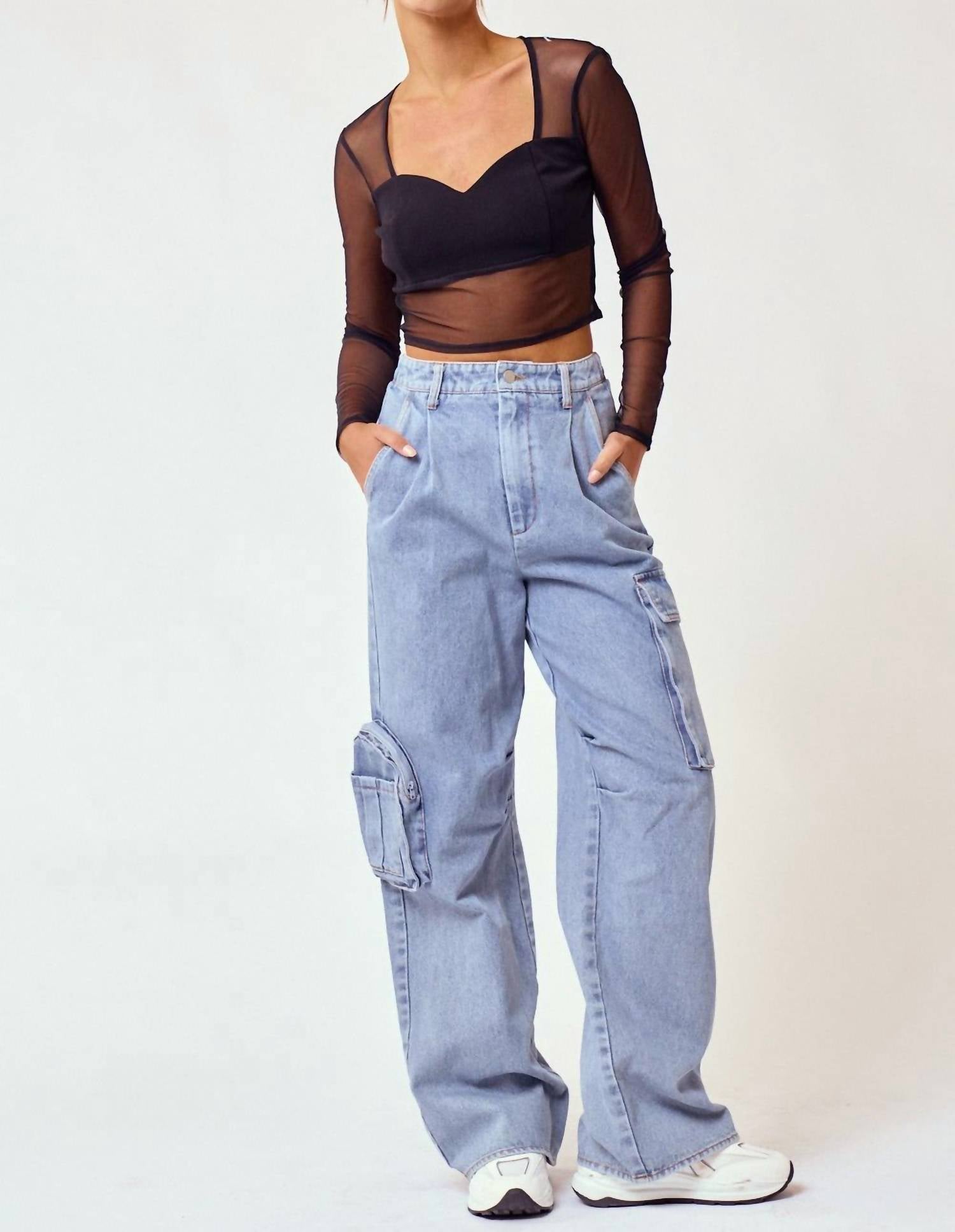 Pair these straight leg jeans with flats, sandals or even heels! You can't go wrong. Experience the perfect blend of style and comfort with the Women's Denim Cargo Long Pants by Blue Blush. Featuring a light-washed, textured denim fabric, these straight-leg pants are a must-have for your spring vacation wardrobe. Designed with practical pockets and an elastic back band for a casual fit, they seamlessly merge functionality and fashion. Closure: Zip closure, with an easy-care fabric for everyday wear.