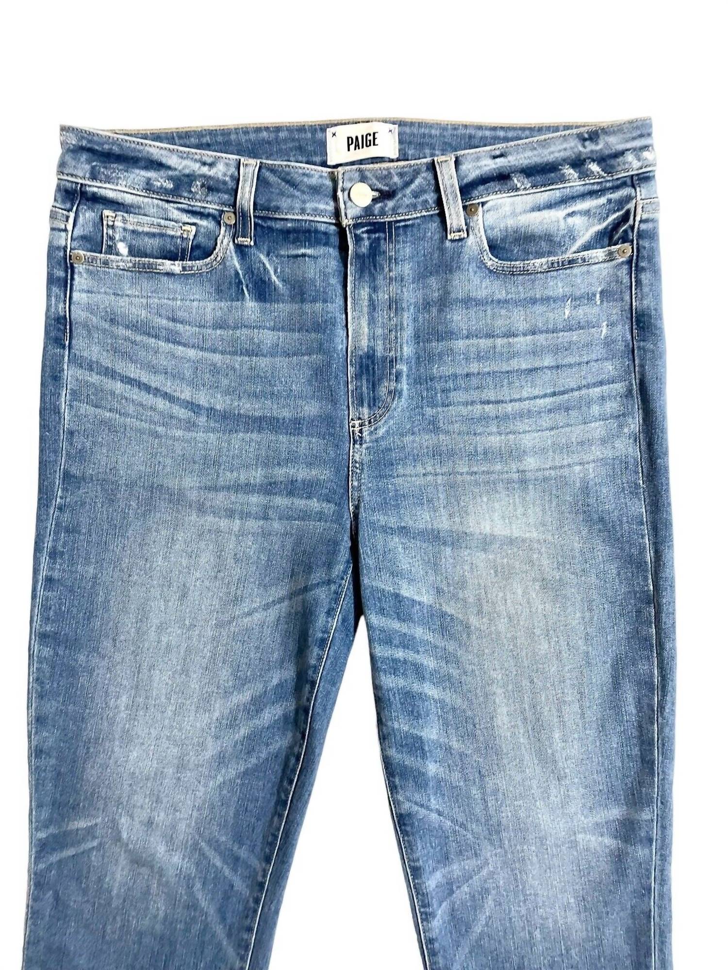 Discover the Women's Hoxton Straight Crop Jeans by Paige, an epitome of laid-back style with an authentic, lived-in look. Crafted from a blend of 92% cotton, 6% polyester, and 2% spandex, these blue denim jeans promise comfort and stretch. Featuring a high rise with front rise of 11" and back rise of 15.5", they ensure a flattering fit with a leg opening of 11" and an inseam of 24". The button closure and five-pocket style add functionality, while care is simple with machine wash cold and tumble dry. Perfectly true to size with a waist measurement of 17".