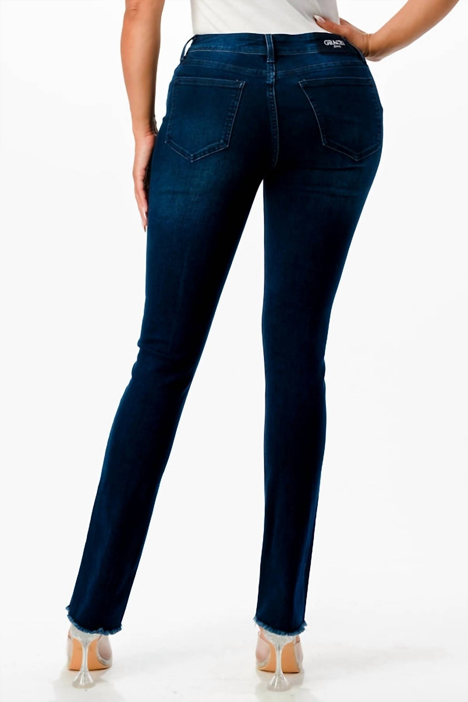 This classic straight leg jean has a perfect fit and goes with just about everything. The Mid-rise Center Seam Denim Jean by GRACE IN LA is a must-have for the season with its flattering slim fit and dark wash. These jeans offer a comfortable mid-rise with both front and back rise measurements of 9.25" and 14.25" respectively, and a 30" inseam. Crafted from an Easy Fit Denim, the fabric composition includes 85% Cotton, 13% Polyester, and 2% Elastane, providing the perfect amount of stretch and hold. Closure: Button closure. Care: Hand wash cold, line dry; do not bleach or iron.