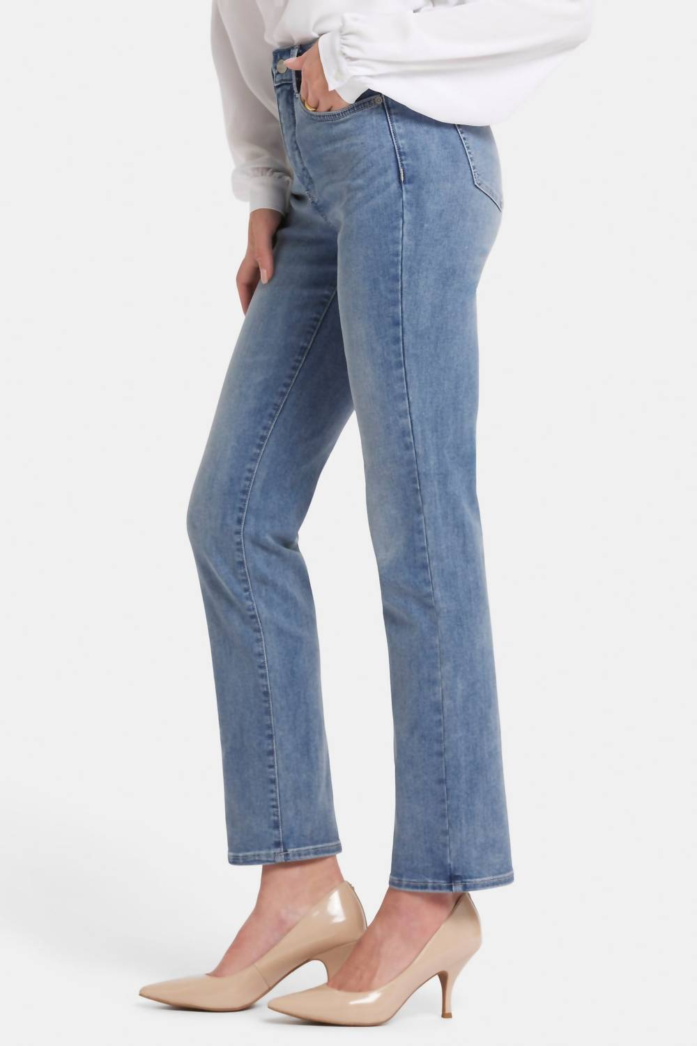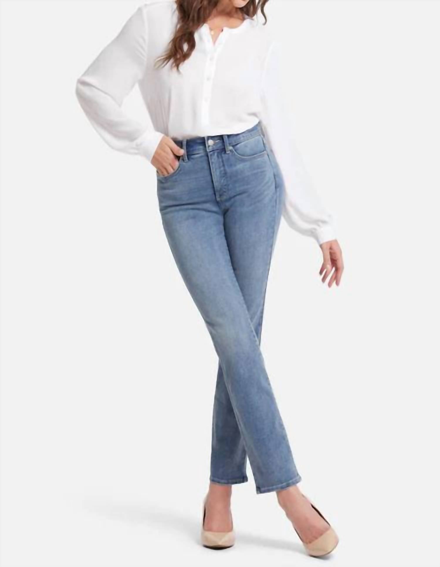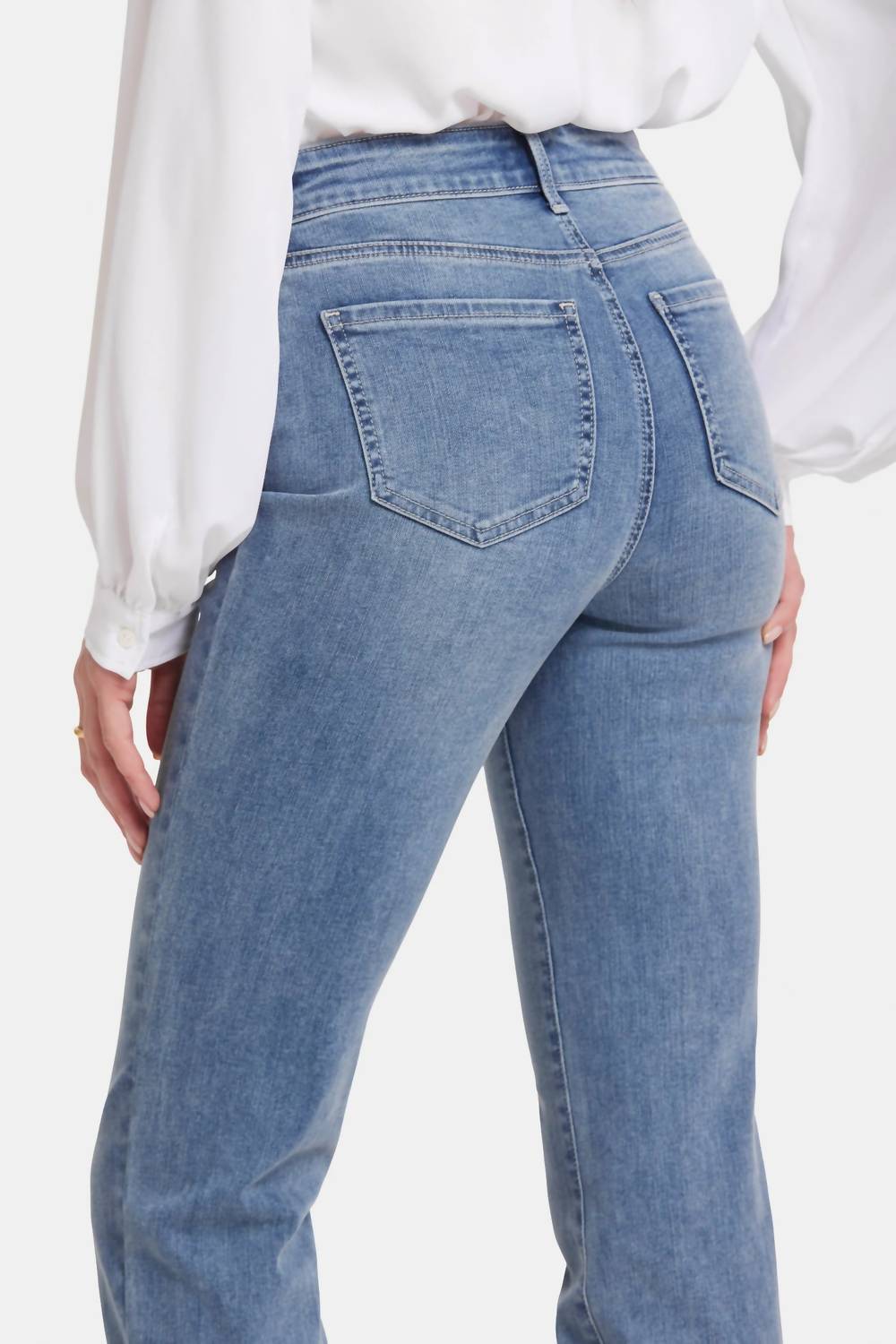 This classic straight leg jean has a perfect fit and goes with just about everything. NYDJ presents the Marilyn Straight Leg Jeans in the Hayden Valley wash, a timeless addition to any wardrobe. These women's jeans feature a figure-elongating design and straight-leg silhouette, complete with a 10.25" high rise and a 29" inseam for a perfect fit. Crafted from a cotton blend of 93% cotton, 5% polyester, and 2% elastane, these jeans offer both comfort and style with classic five-pocket styling and a secure button closure. Designed with earth-friendly methods, they are easy to care for with machine wash instructions and line dry.