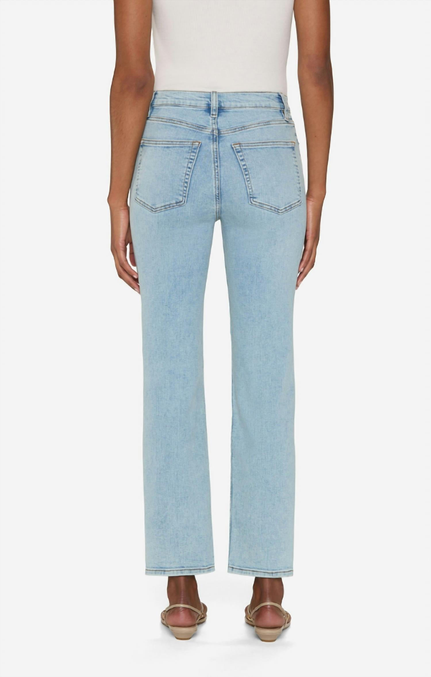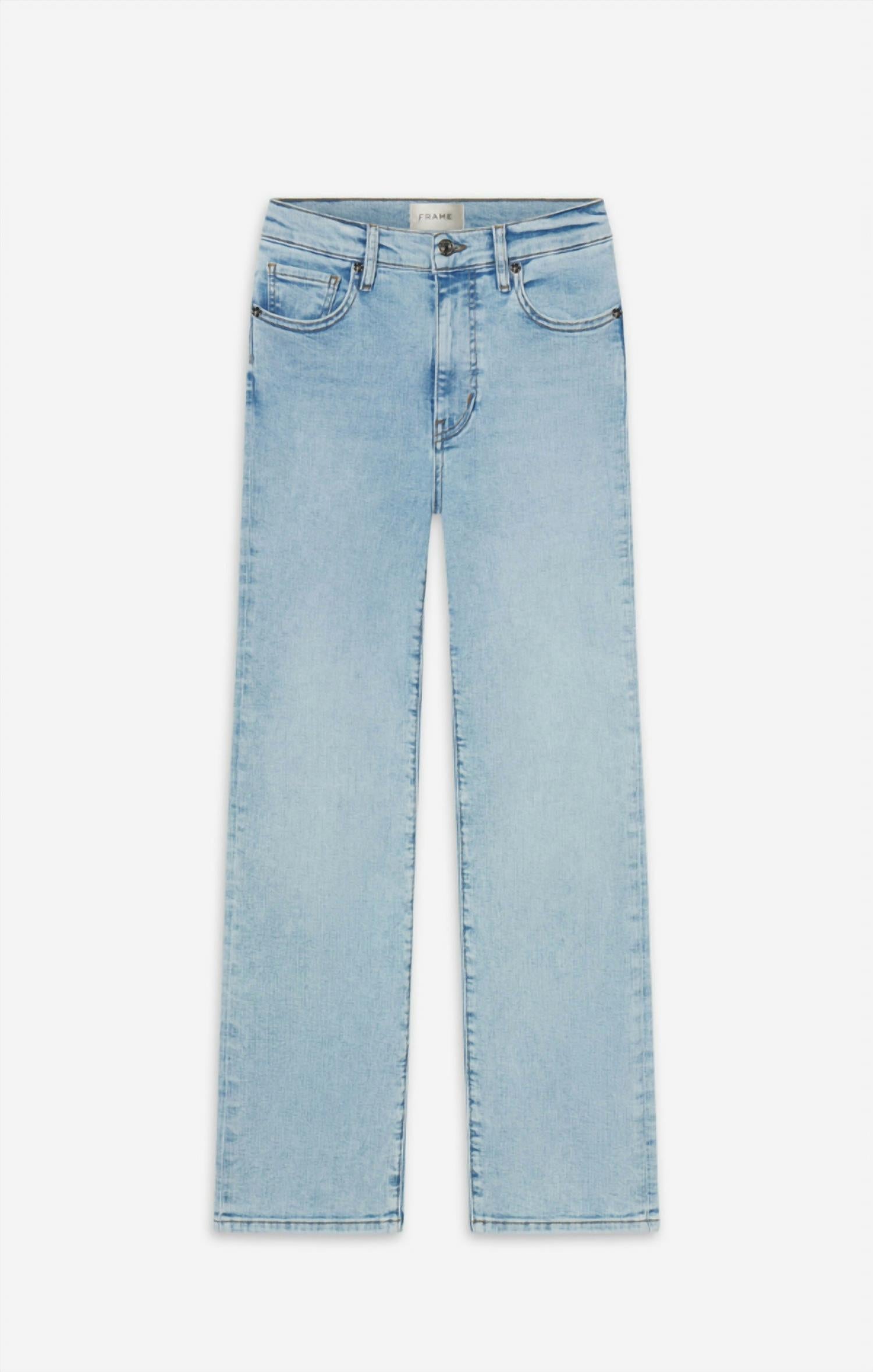Pair these straight leg jeans with flats, sandals or even heels! You can't go wrong. Discover the Le Sleek High Rise Straight Leg Jean by FRAME, an iconic addition to any wardrobe. Crafted from a blend of cotton, recycled polyester, lyocell, and elastane, these jeans offer unparalleled comfort with their stretch denim and high-rise waist. Featuring a relaxed straight leg with a 28" inseam that hits perfectly at the ankle, and a 11" front rise, they make a versatile choice for styling up or down. Closure: Zip fly. Care: Machine wash, tumble dry. Designed for a regular fit, these jeans include practical pockets, making them perfect for a range of occasions.
