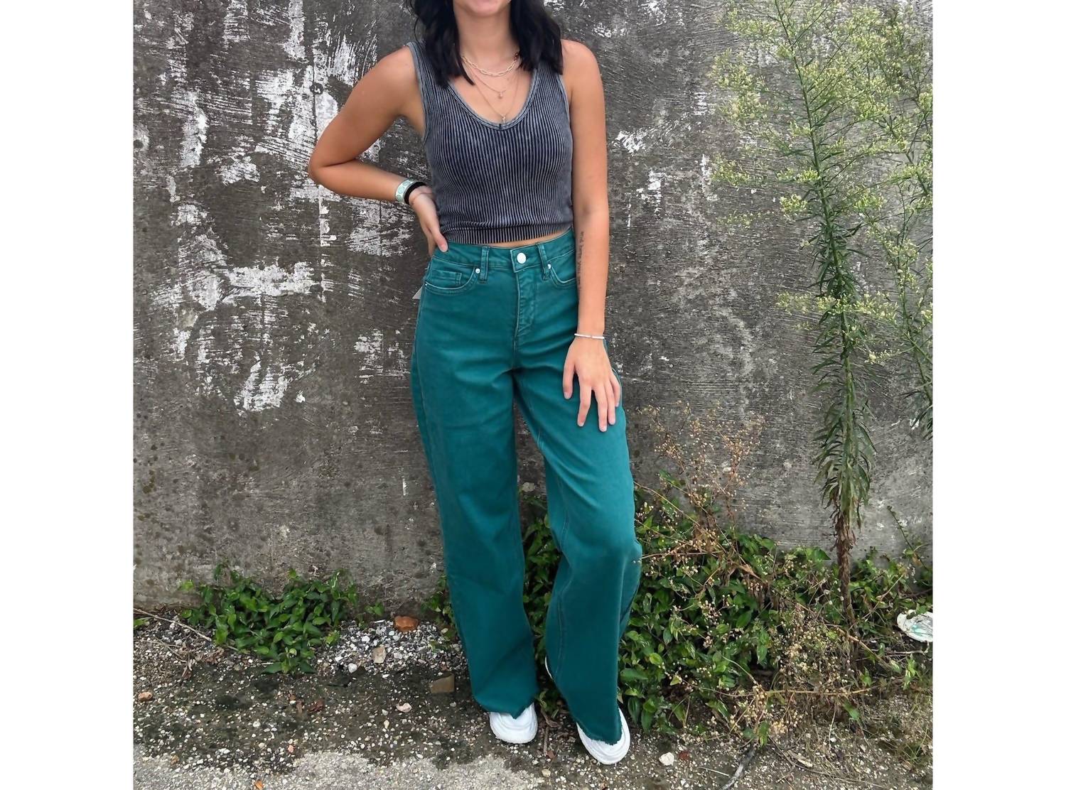 These must-have jeans are fit to perfection. Introducing the Chloe Cropped Wide Leg Jeans by YMI, a fashion-forward choice in standout Blue Teal. These high-rise, wide-leg denim jeans offer an 11-inch rise and 32-inch inseam for a flattering fit, enhanced by a tummy control design. Crafted from a cotton blend with 78% cotton, 20% polyester, and 2% spandex, they promise both comfort and style. Closure: Button closure. Care instructions: Machine wash and tumble dry. Perfect for any occasion from a casual brunch to a chic dinner party.