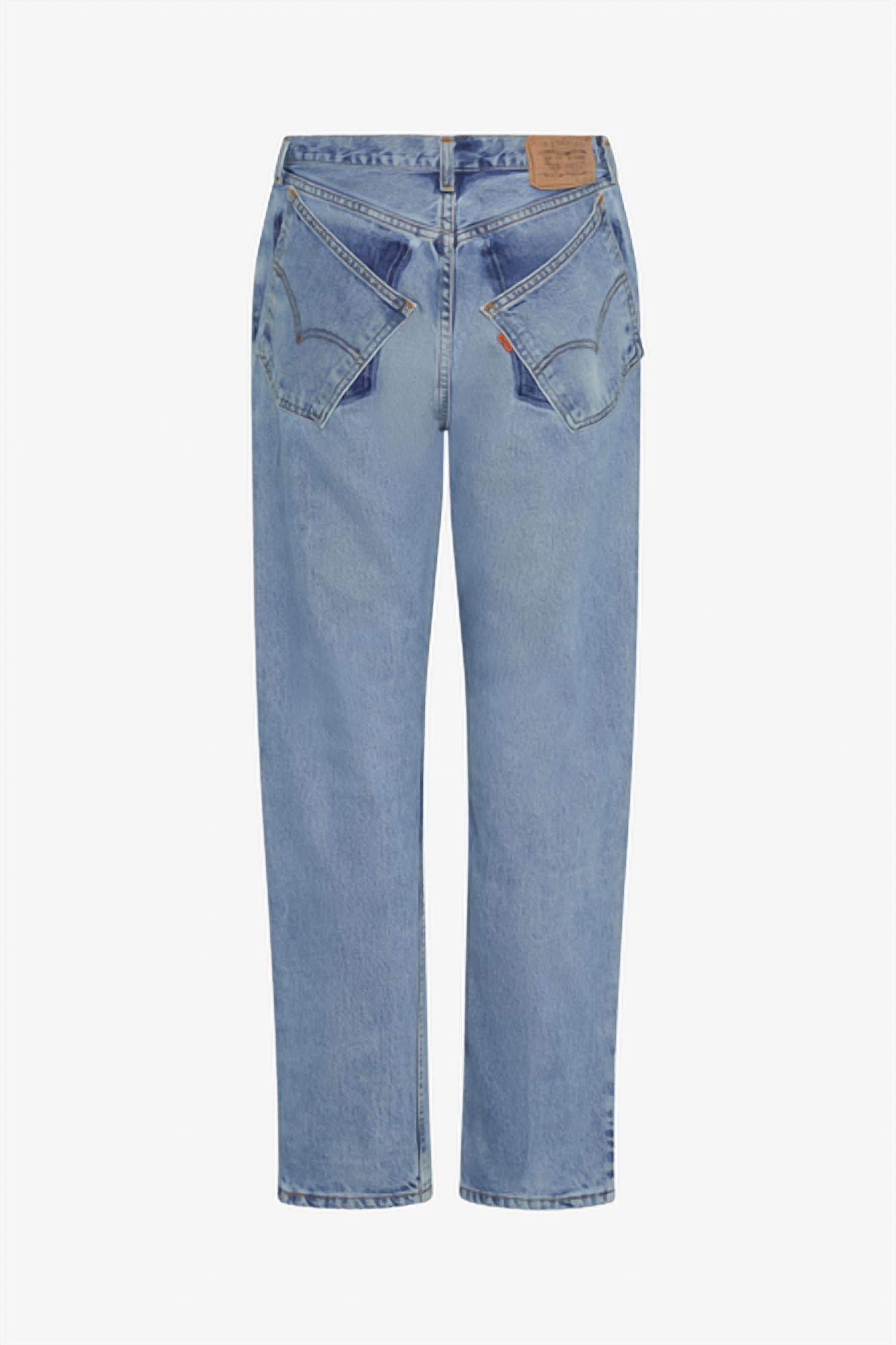 These must-have jeans are fit to perfection. Presenting the Allysa Tilted Split Jeans by Aligrace, a chic addition to your wardrobe in a light blue hue. Crafted from 100% cotton and made in the USA, these jeans offer a rigid denim texture with lightly distressed trim, perfect for a streetwear look. The design features a mid-rise and straight-leg silhouette with a unique tilted pocket add-on. Closure: Zip fly and button closure. Care: Machine wash. Each pair is uniquely crafted with reclaimed vintage fabrics, ensuring individuality in details and color.