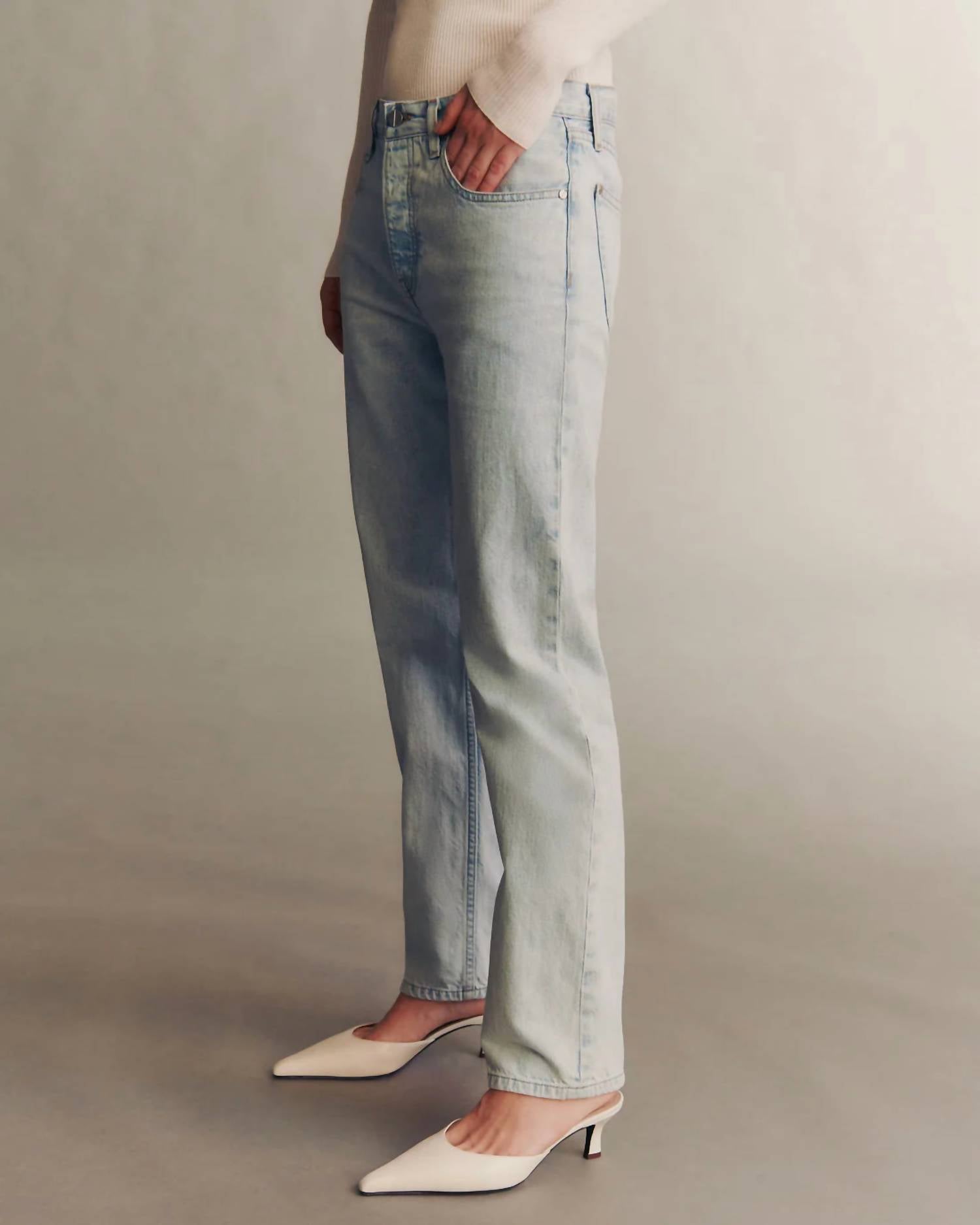 This classic straight leg jean has a perfect fit and goes with just about everything. Discover the Soda Pop Straight Leg Jean by TWP, a vintage-inspired essential in a stylish light wash denim. Crafted entirely from cotton, these jeans offer a relaxed fit with a mid-rise waist, making them perfect for both casual and dressed-up occasions. The design features a straight leg style and a classic five-pocket silhouette adorned with signature nail head rivet hardware. Closure is secured with a button fly and shank button, adding to its minimalist charm. Care is easy with machine wash and tumble dry instructions, ideal for modern living.