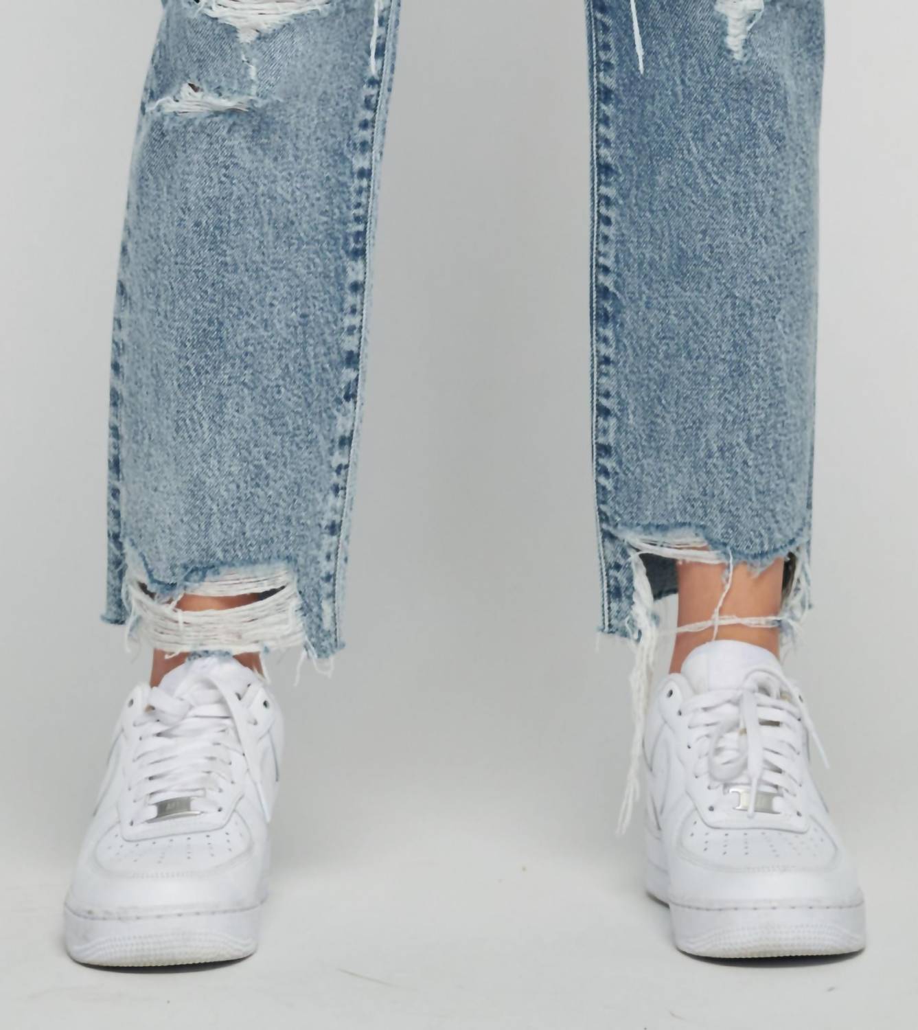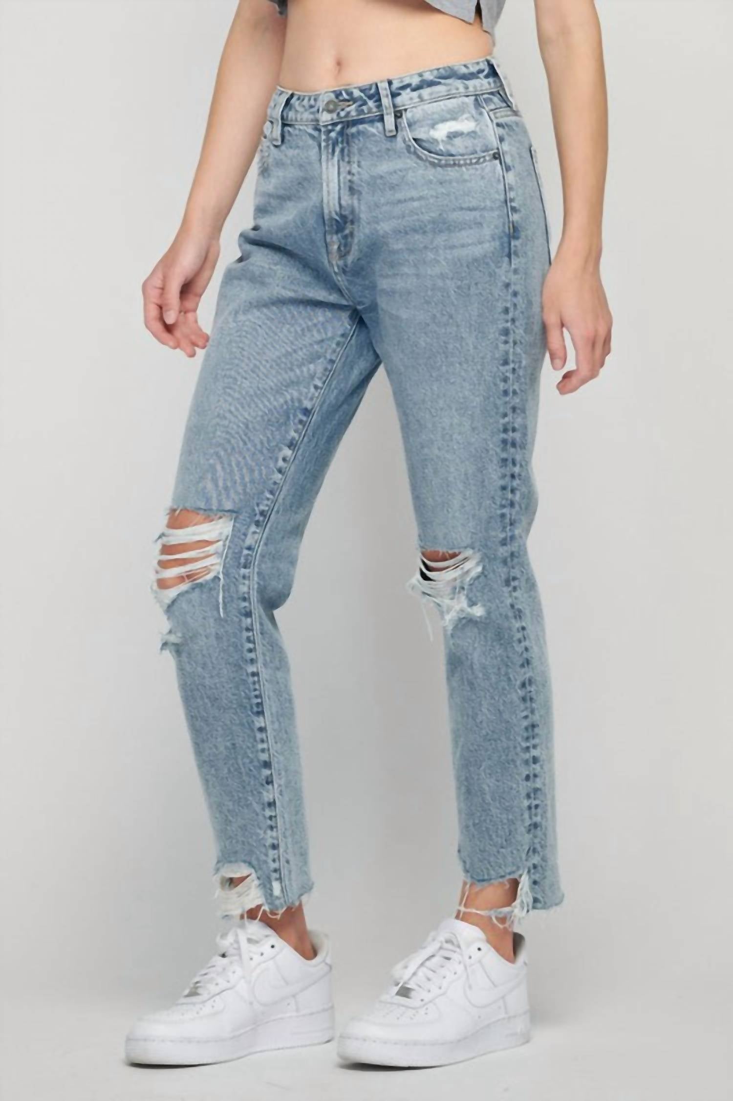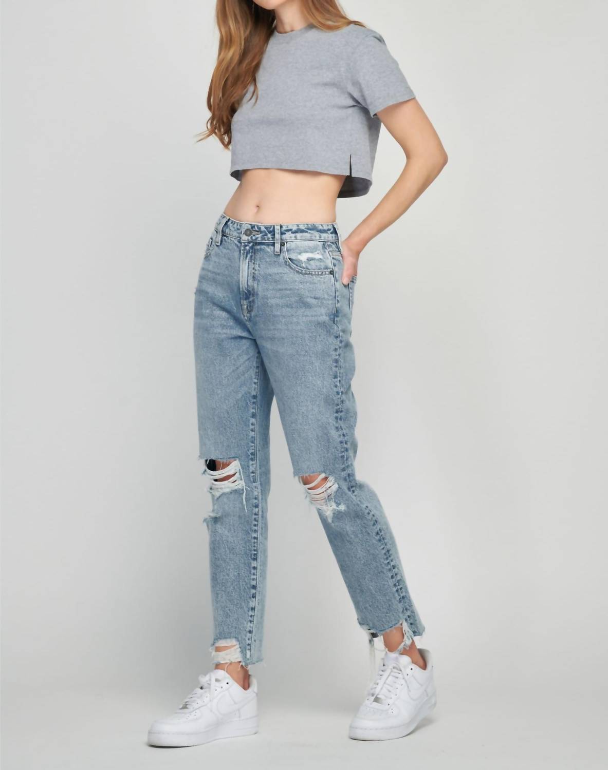 These must-have jeans are fit to perfection. Step back into the nineties with Hidden's Tracey High Rise Cropped Straight Fit Jean, an acid wash masterpiece perfect for any summer occasion. Crafted from 100% cotton, these jeans boast a relaxed fit with a high rise and distressed knees, finished with a chewed hem for added edge. With a 27" inseam and an 11" front rise, they complement sandals, sneakers, and booties alike. Closure: Button closure. Care: Machine wash and tumble dry. Available in sizes 24 to 34, the model is wearing a size 26.