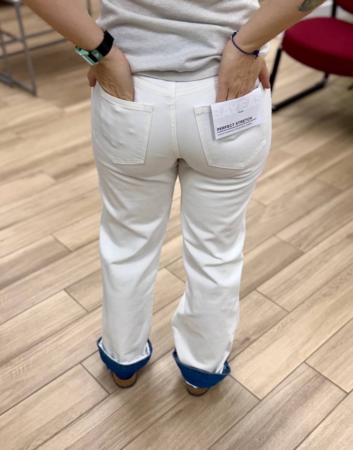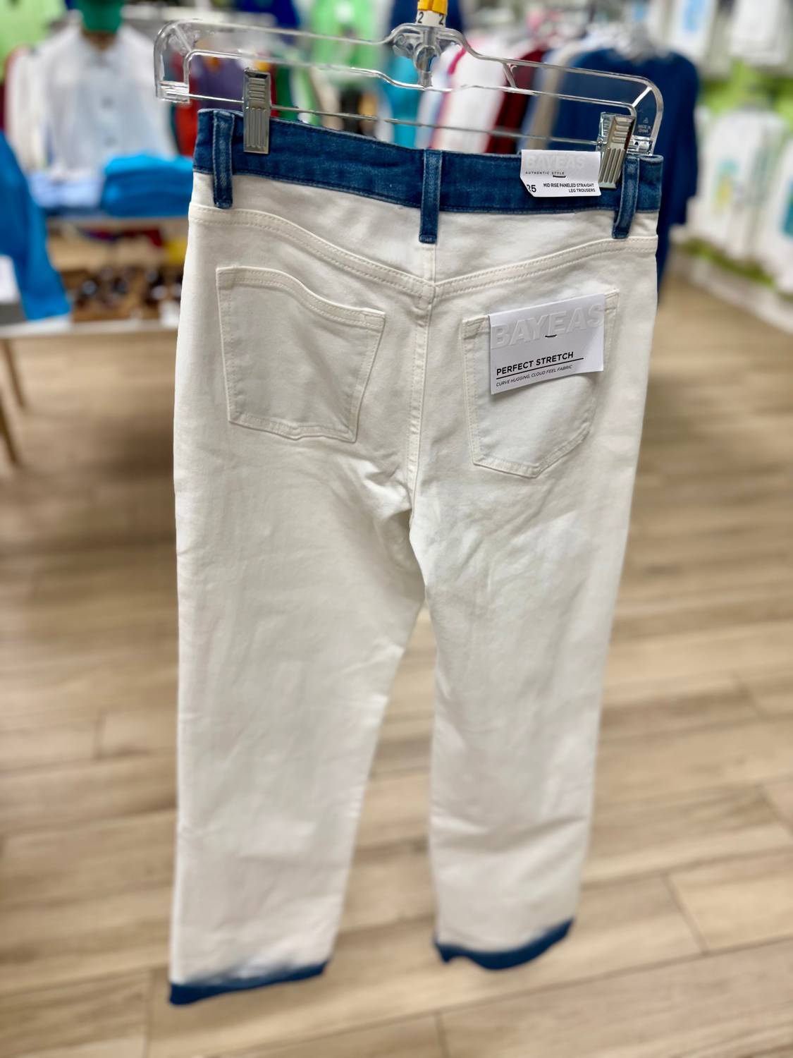 These must-have jeans are fit to perfection. Featuring a white design with a unique blue waistband and hem, the Bayeas White Trim Jeans offer a stylish straight-leg fit perfect for minimalist fashion lovers. Crafted from a 93.5% Cotton, 5% Polyester, and 1.5% Spandex blend, these jeans are full length, ideal for those who may prefer to size up for comfort. These mid-rise, light-wash jeans include functional pockets and have a secure button and zipper closure. Model the look this spring or during travel occasions for effortless style; while they are not pre-shrunk, they're easy to alter to your desired length.