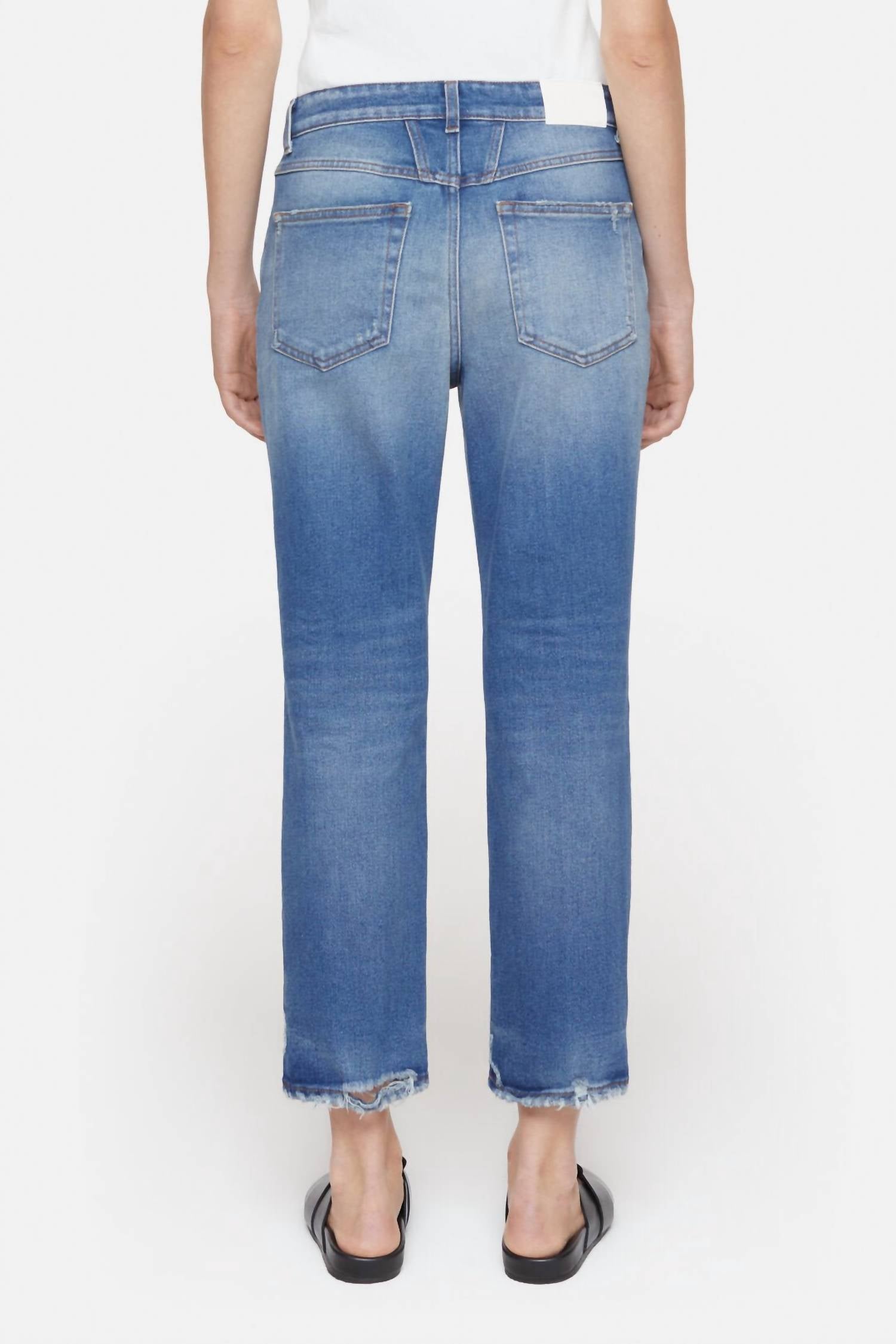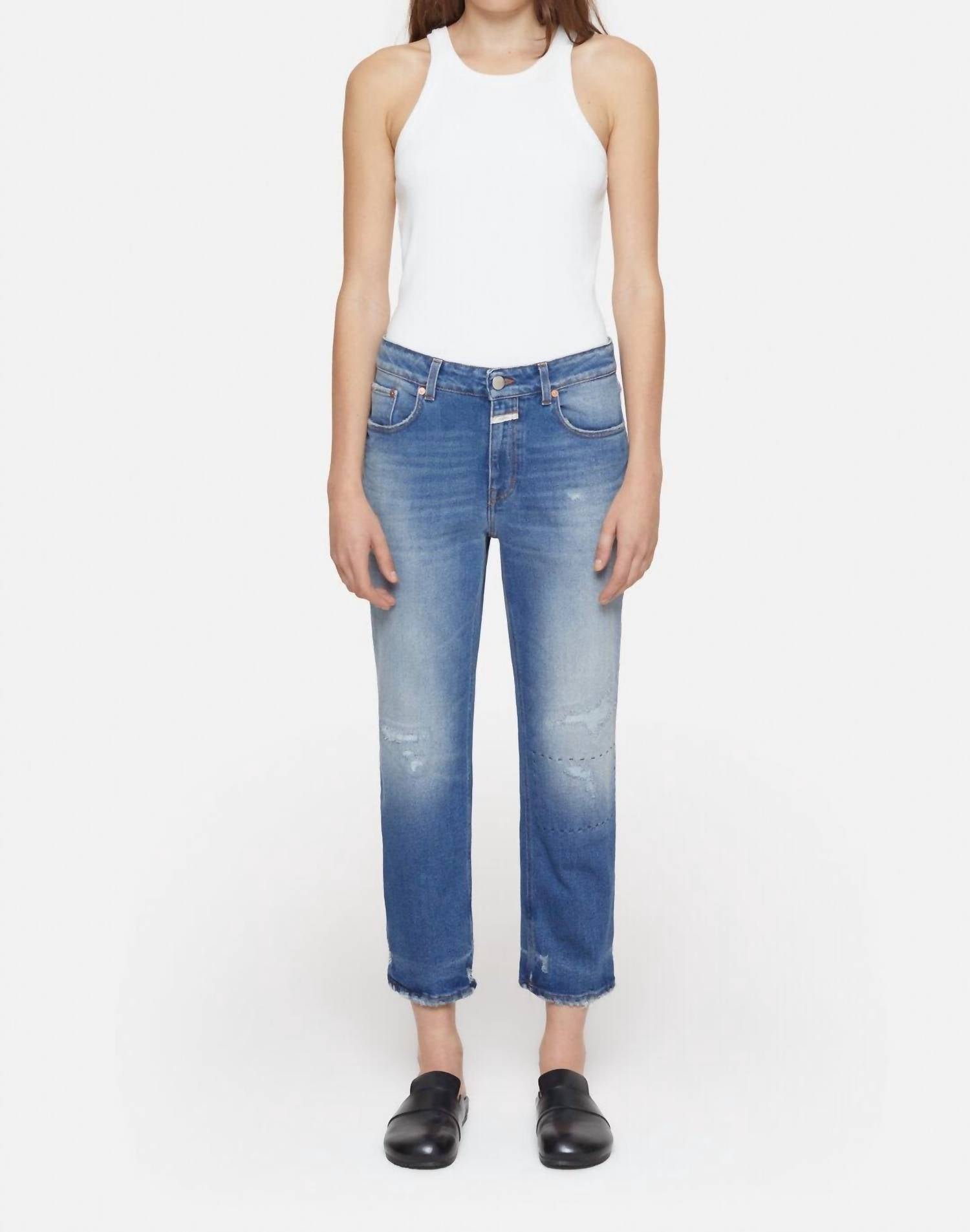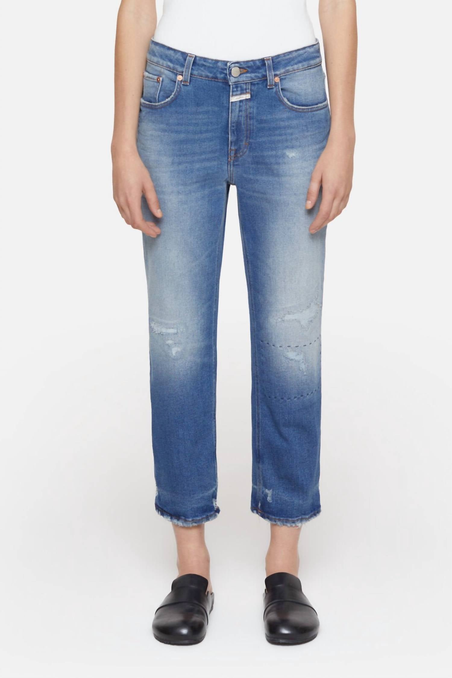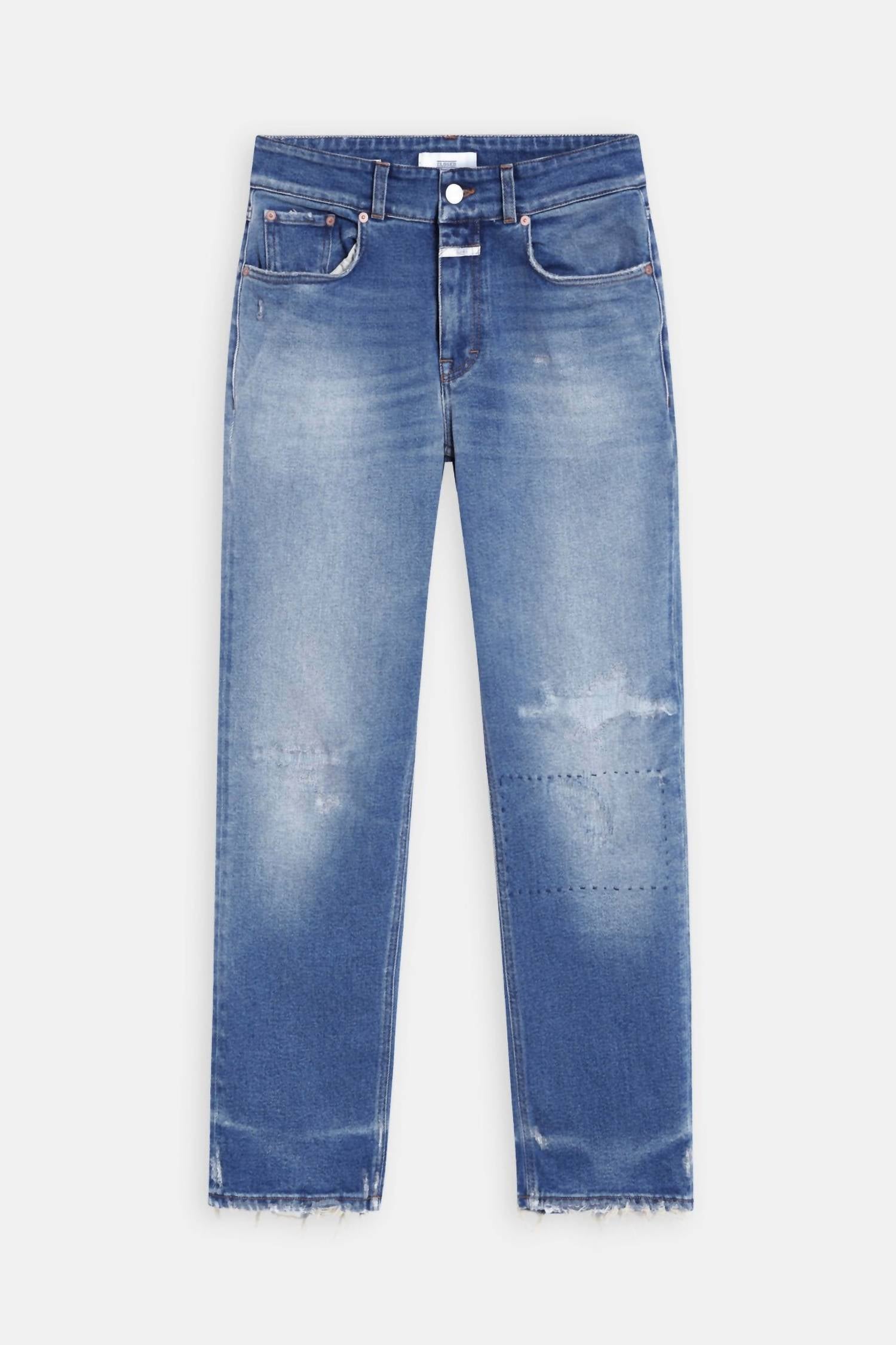 Pair these straight leg jeans with flats, sandals or even heels! You can't go wrong. Embrace timeless style with the CLOSED Milo Straight Leg Jeans in Dark Blue Distress, a must-have for every wardrobe with their relaxed fit and medium wash denim. Crafted in Italy from strong denim with a slight stretch, these jeans feature a slim fit, mid-rise waist, and straight leg design that ensures comfort and mobility. Closure is a classic button style, with pockets for added convenience. Care: Machine wash and tumble dry for easy maintenance. Model (5'10'') wears size 27/32 with an inner leg length of 30" and a leg opening of 7.9", offering a perfect fit for your travels and everyday adventures.