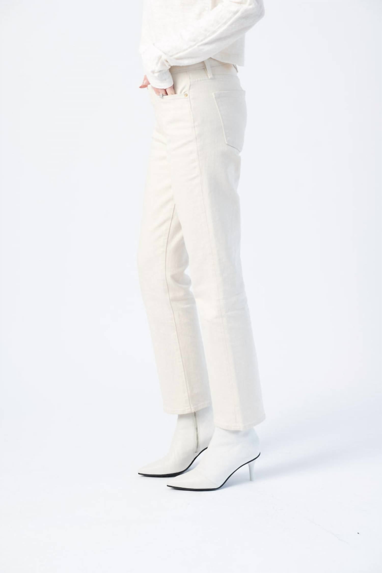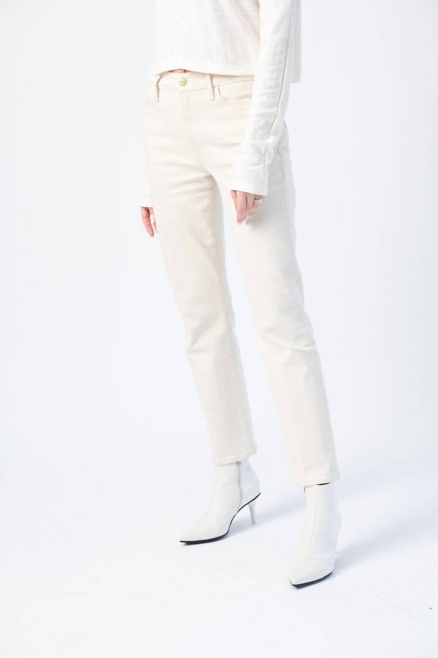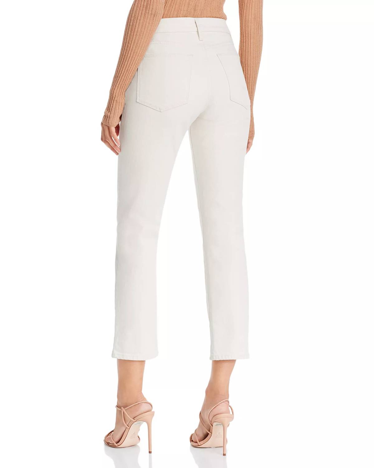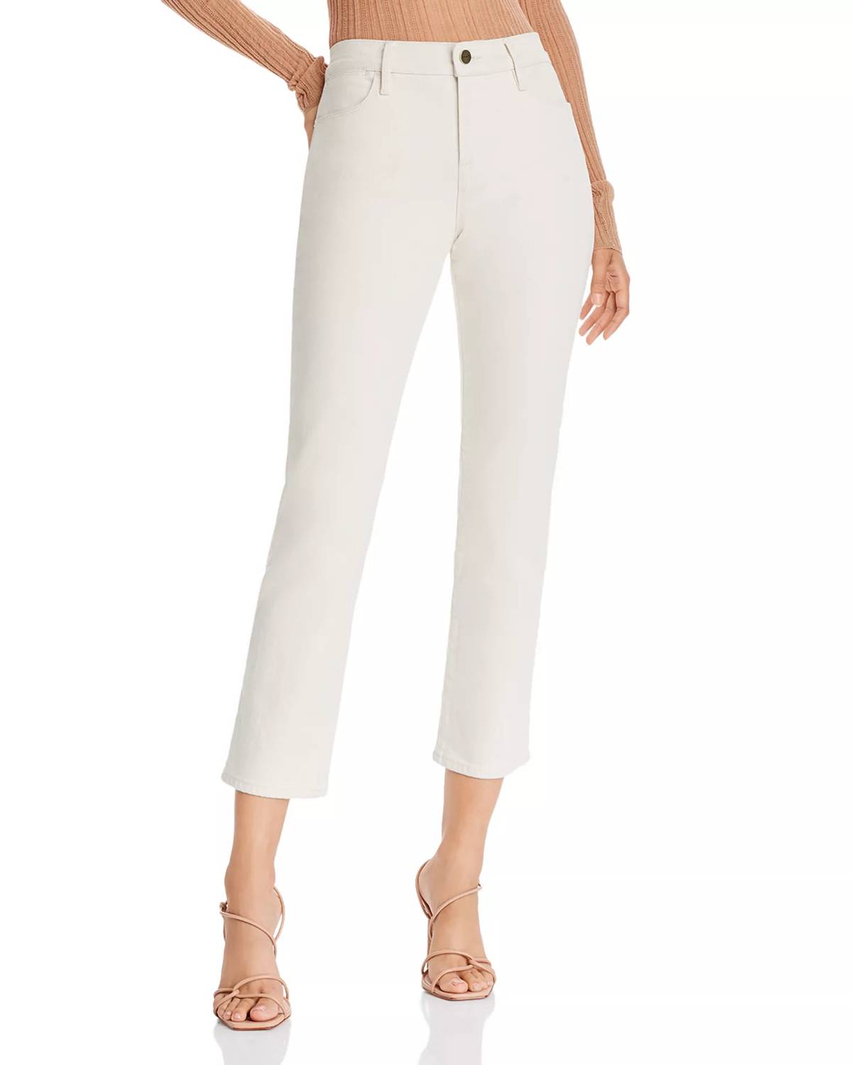 Pair these straight leg jeans with flats, sandals or even heels! You can't go wrong. Discover the Le High Straight Jeans by FRAME, offering a minimalist take on a holiday wardrobe essential. These women's jeans feature a high-rise waist, straight-leg silhouette, and a regular fit, crafted from a winter white cotton blend for premium stretch and recovery. Composition: 92% Cotton, 6% Polyester, 2% Elastane. Made in the USA with a durable button closure and accented by dual front and back pockets with gold metal hardware. Care: Machine wash cold, tumble dry. Trendy and versatile.