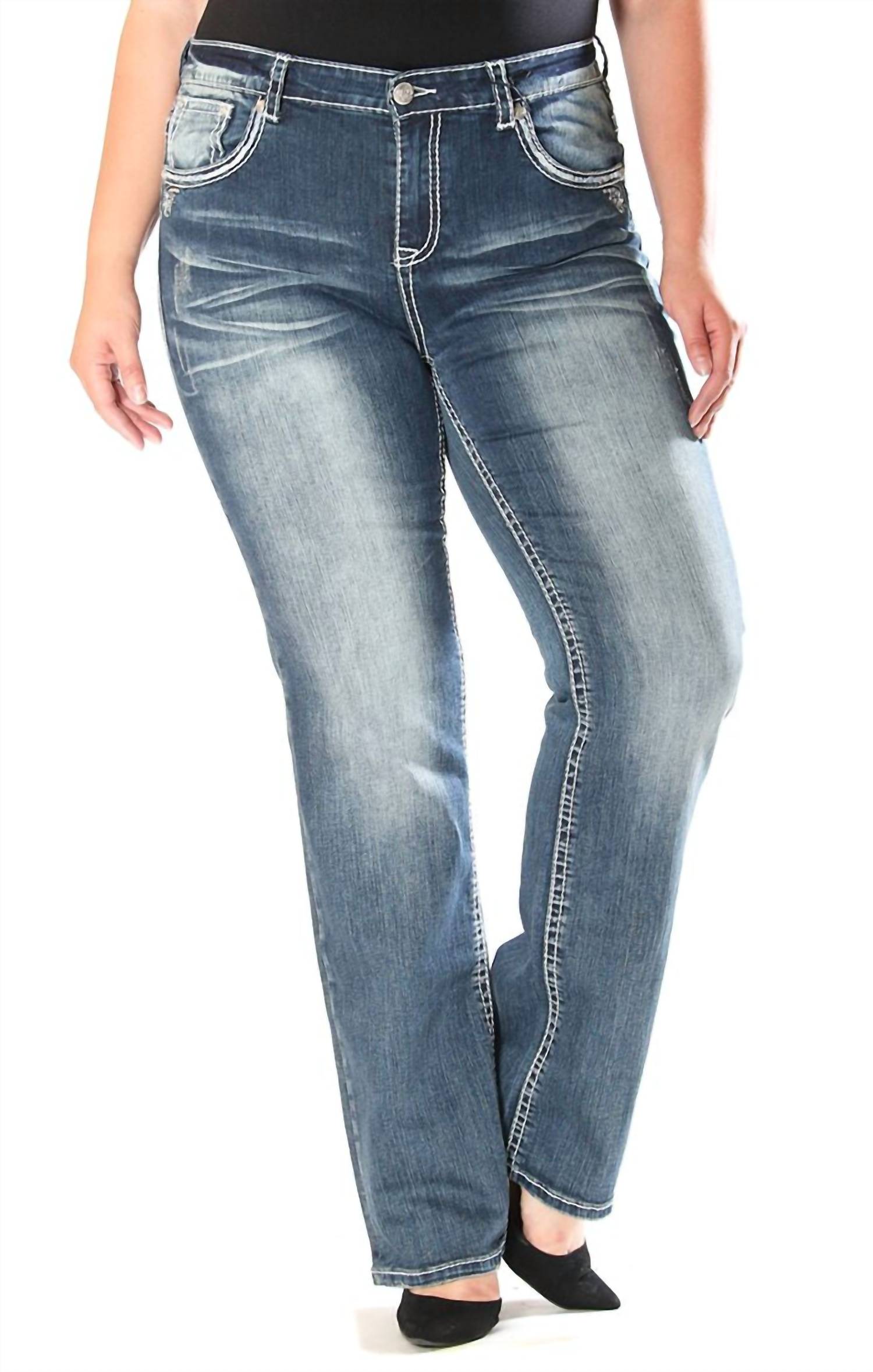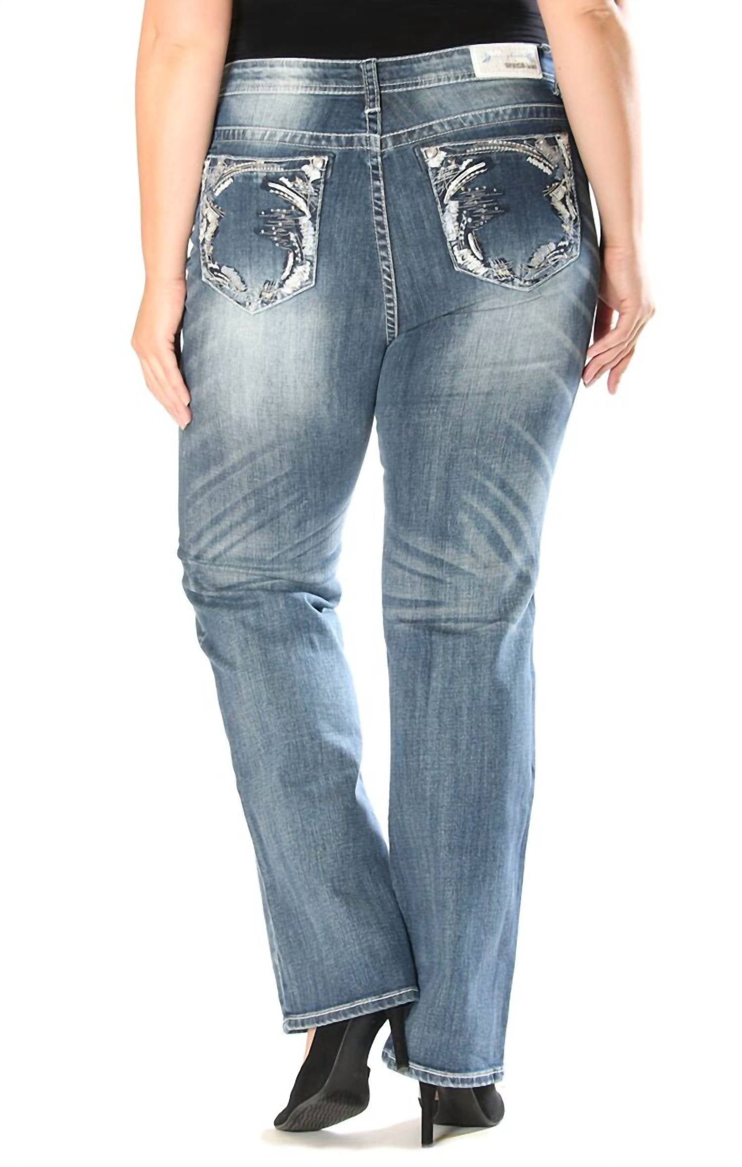 These must-have jeans are fit to perfection. Elevate your wardrobe with the Women's Straight Leg Jeans by GRACE IN LA, featuring a relaxed fit and high rise for comfort and style. These medium-wash denim jeans are crafted with solid patterning and accented by jeweled embroidered pockets. Designed with a button closure, they offer a sleek yet versatile addition to your workwear or vacation ensembles. Easy care with machine wash and compatible for tumble dry, these jeans make a practical choice for spring adventures.