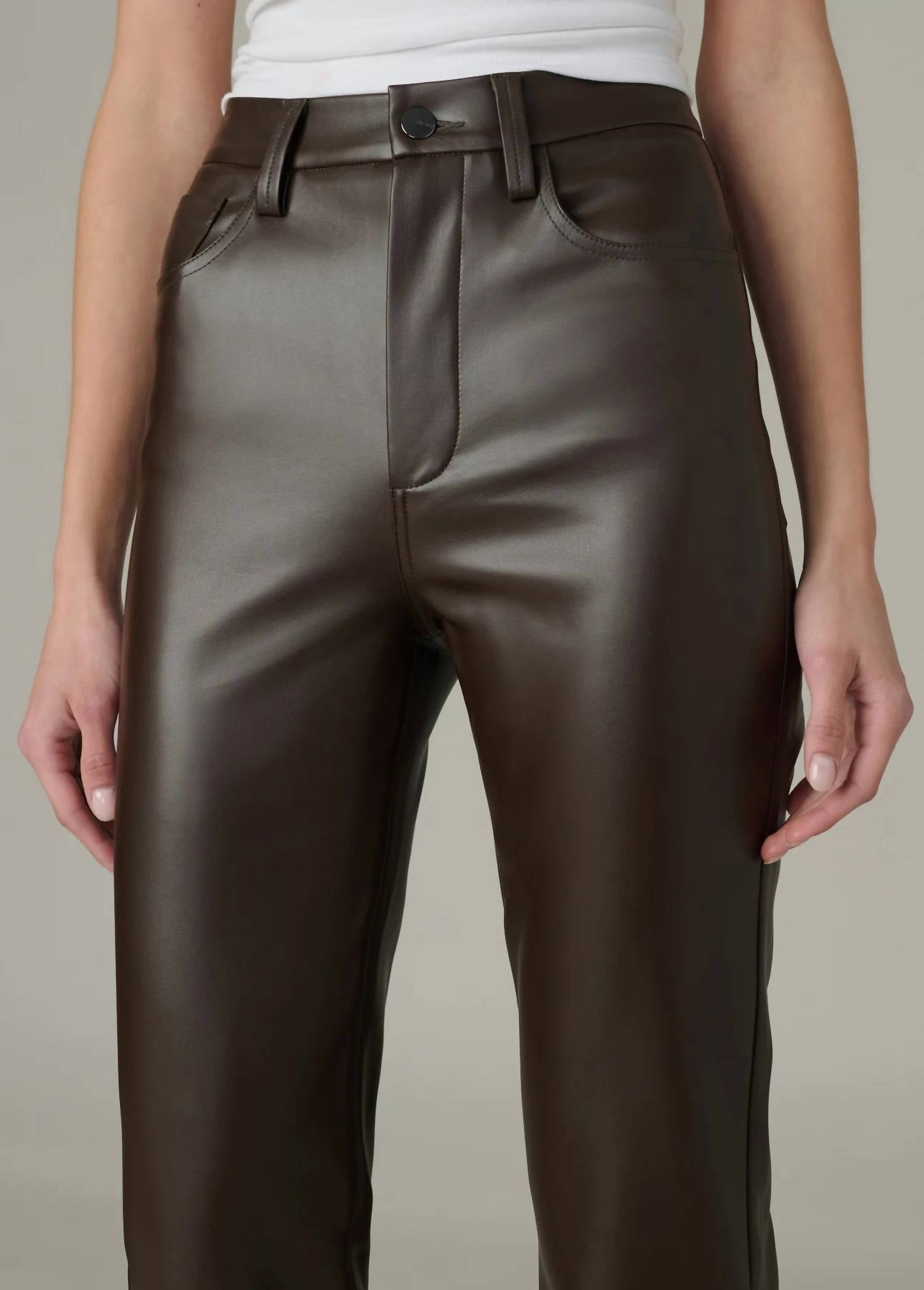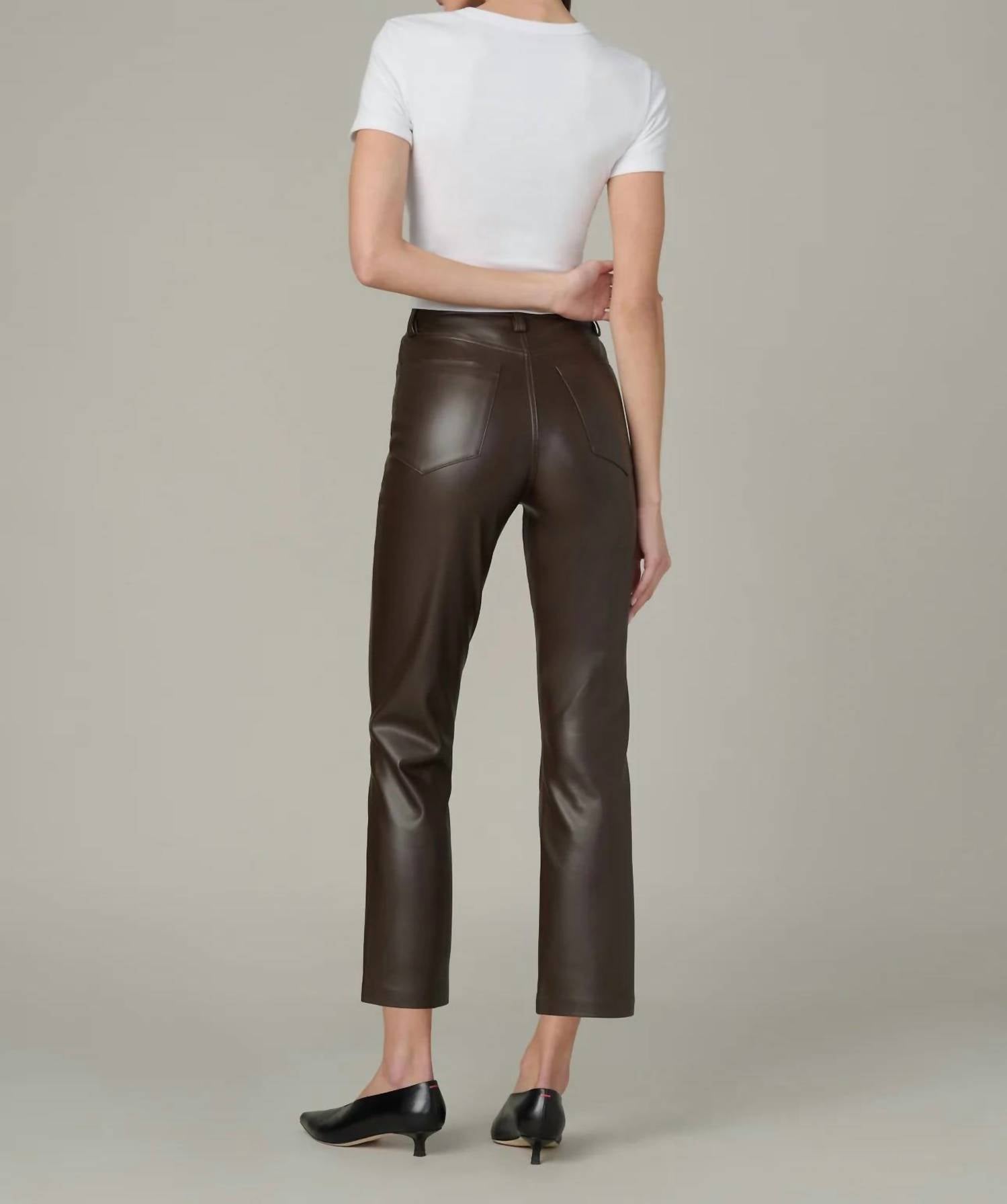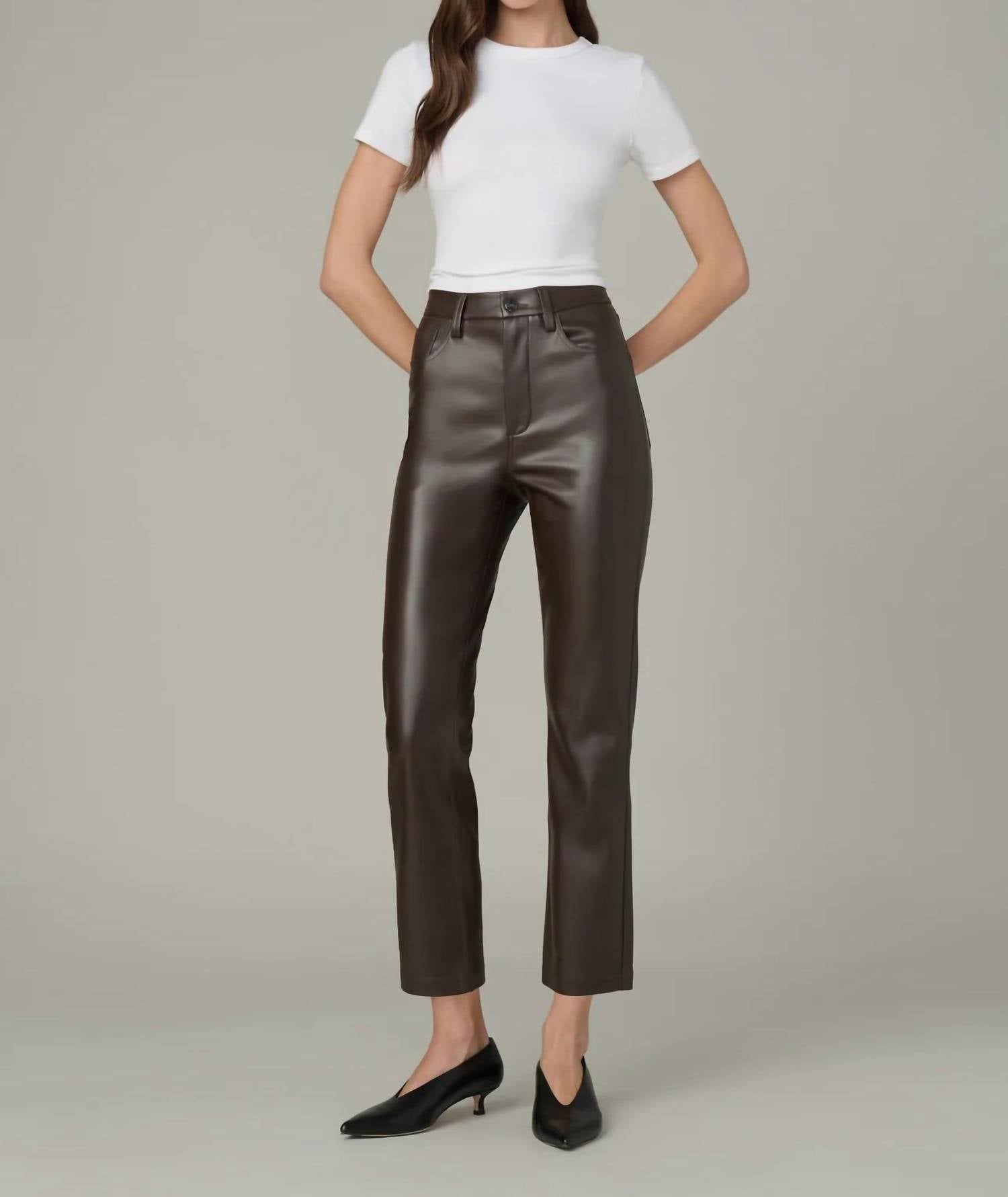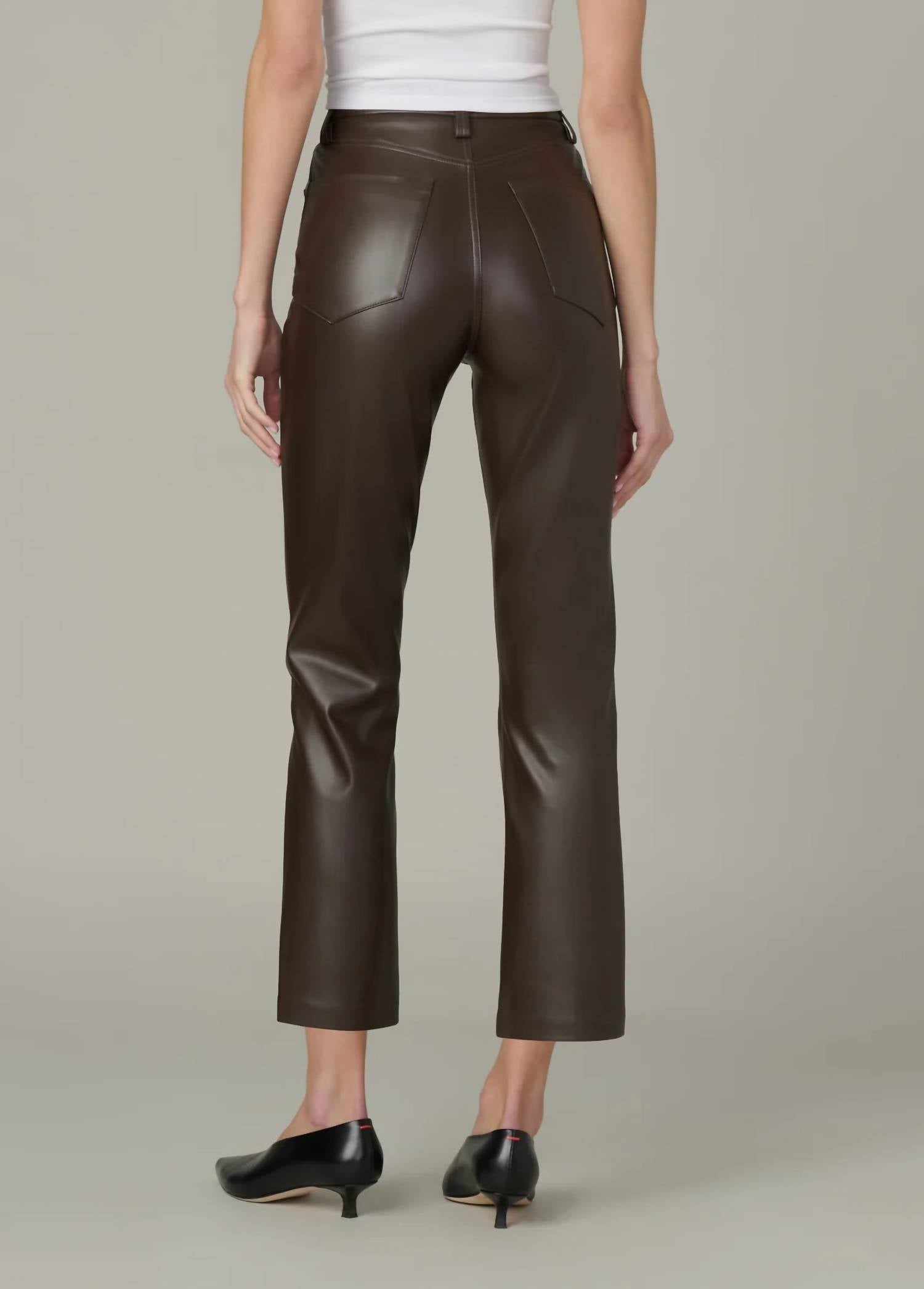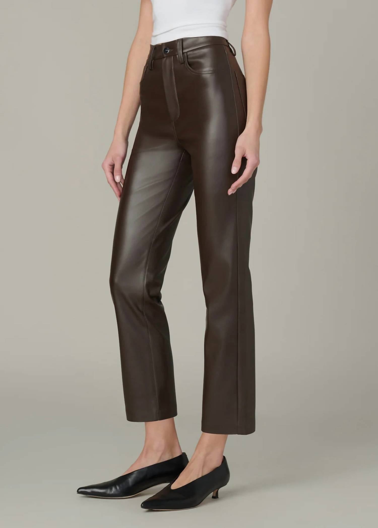 These must-have jeans are fit to perfection. Introducing Joe's Jeans The Lyra High Rise Straight Leg Jean in a sophisticated dark chocolate shade perfect for a preppy spring look. Designed with a slim fit through the waist and hip, these jeans feature a high rise of 11.5 inches and a tapered straight leg that hits right at the ankle with a 27.5-inch inseam. Made from 100% polyurethane, the vegan leather offers a soft, drapey, and stretchy feel with a sleek matte finish. Closure: Zip fly with classic 5-pocket styling. Model is wearing size 26.