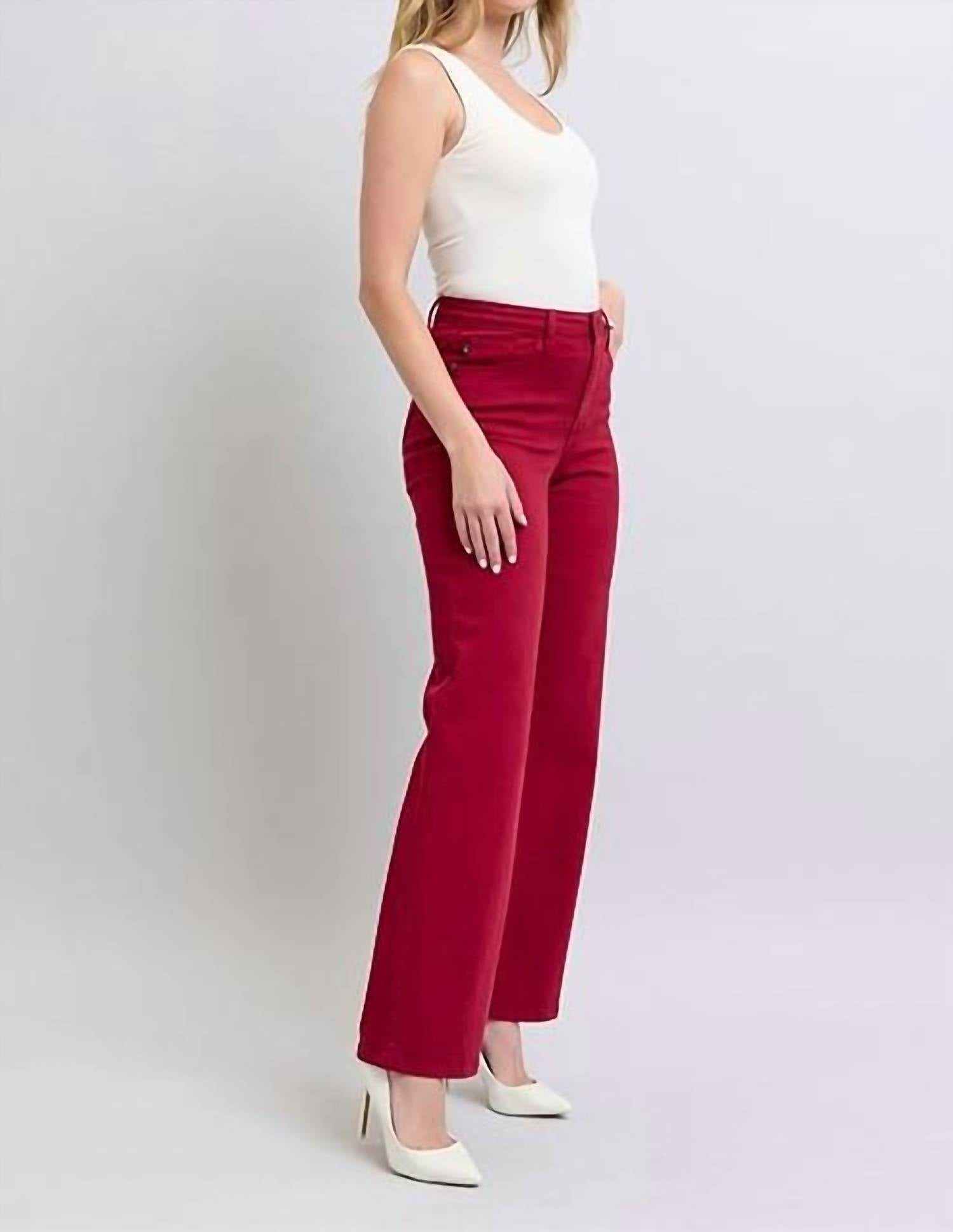 Pair these straight leg jeans with flats, sandals or even heels! You can't go wrong. Introducing the Heart Shaped Back 90's Straight Jeans by Judy Blue, designed for women who adore a retro aesthetic. Crafted from a sturdy blend of 93% Cotton, 6% Polyester, and 1% Spandex, these denim jeans offer a high-rise fit and straight leg style in a striking scarlet hue. The jeans feature solid dark wash and charming heart-shaped back pockets, perfect for a playful yet sophisticated look. Closure is by zip, and they're easy to care for with a machine wash.