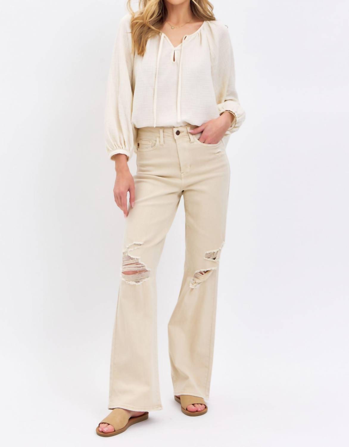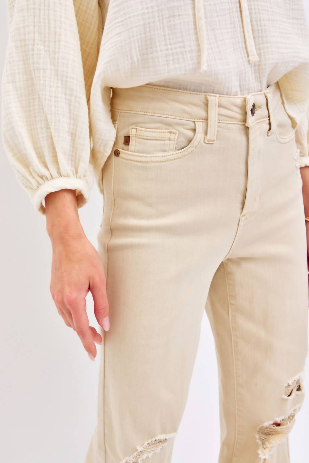 Pair these straight leg jeans with flats, sandals or even heels! You can't go wrong. Elevate your streetwear wardrobe with the Judy Blue High Waist Destroyed 90’s Straight Jeans in a chic beige hue, perfect for summer concerts. These high-rise jeans feature a solid pattern with a regular fit and straight leg, complete with a comfortable 32" inseam. Crafted from a blend of 93% Cotton, 6% Polyester, and 1% Spandex, it includes practical pockets for added convenience. Closure: Button closure. Care: Machine wash and tumble dry. Available in both regular and plus sizes.