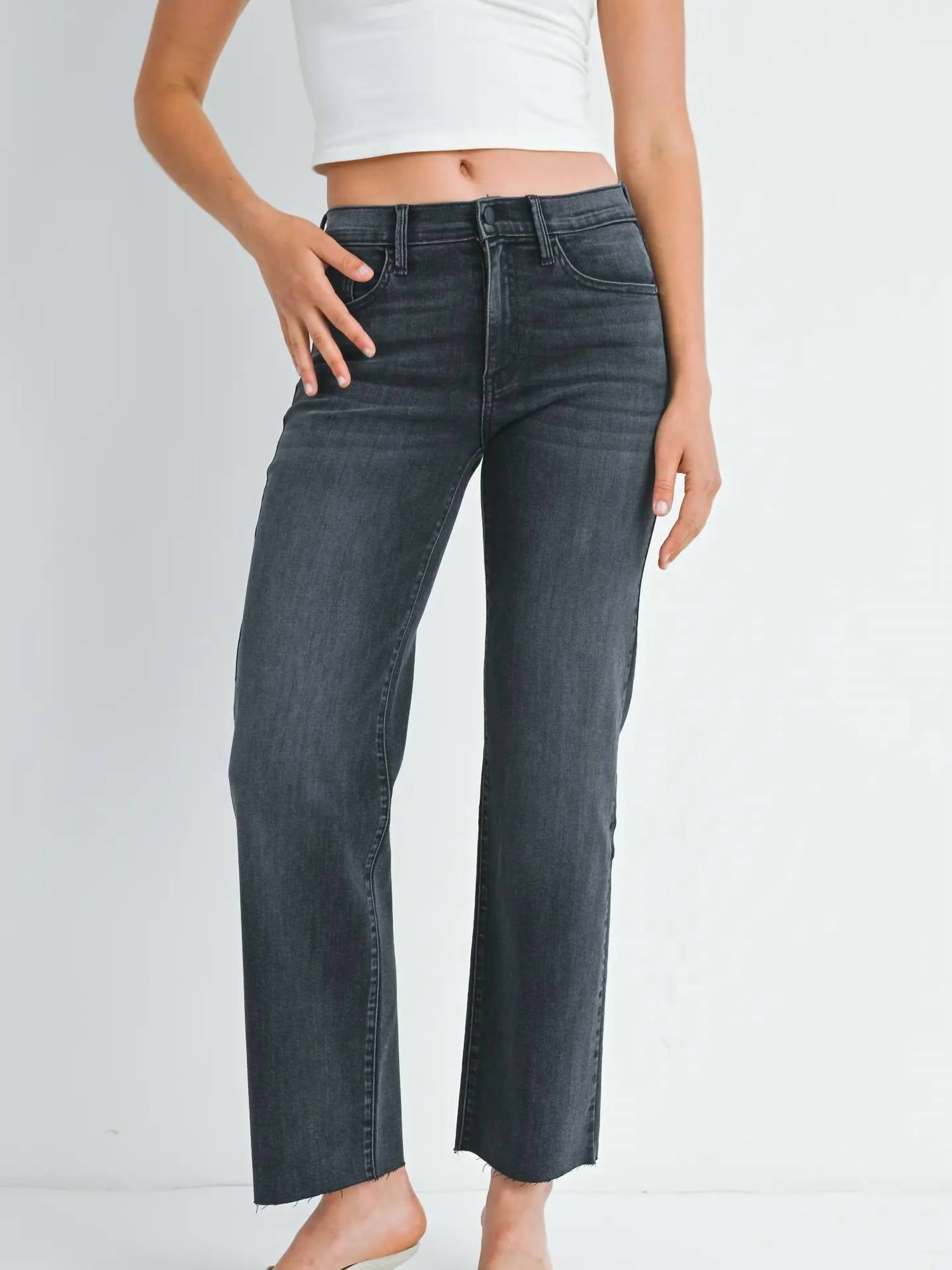 Pair these straight leg jeans with flats, sandals or even heels! You can't go wrong. Introducing the Macy Straight Leg Denim by JUST BLACK DENIM, a perfect blend of style and comfort in sleek grey. Designed with a relaxed fit, these pants feature a mid-rise waist and a straight leg style with a button closure for easy wear. Fabricated from a cotton blend of 70% Cotton, 21% Polyester, 8% Rayon, and 1% Spandex, they offer flexibility and durability. Care for these edgy scissor-cut hem jeans by machine washing and tumble drying, making them a practical choice for any vacation or casual outing.