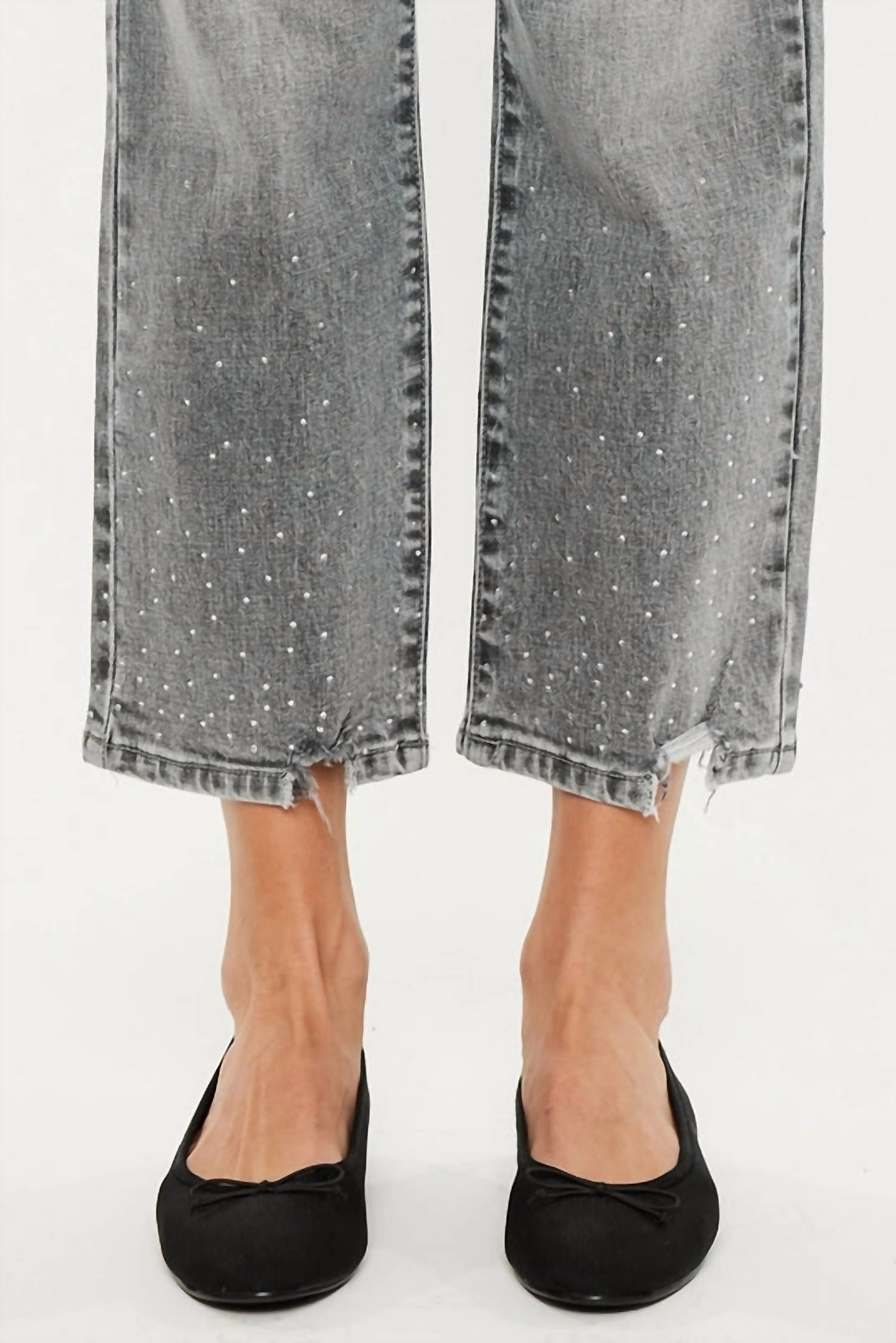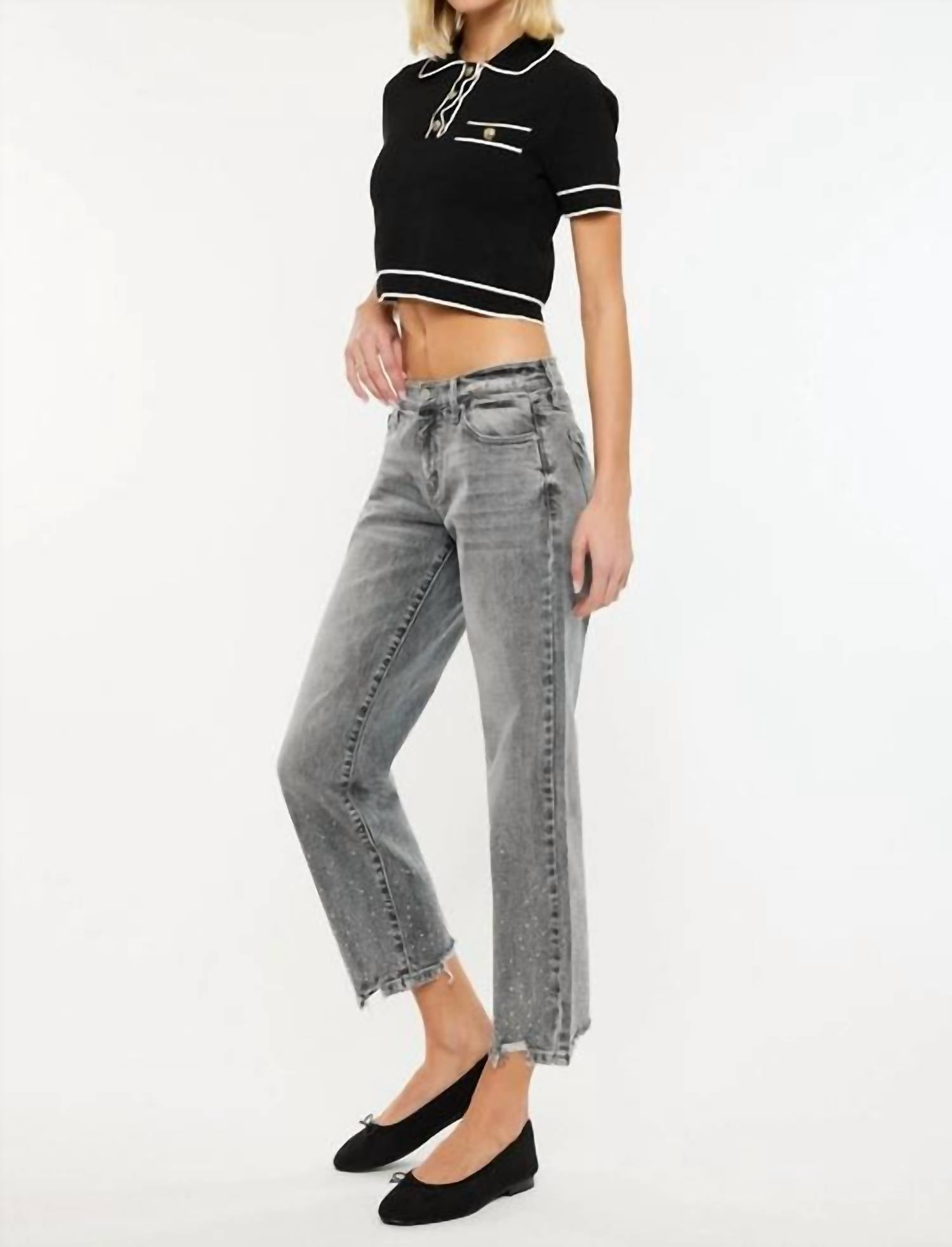 This classic straight leg jean has a perfect fit and goes with just about everything. Introducing the Mid Rise Cropped Straight Leg Jeans by KanCan, a staple for any streetwear enthusiast. Crafted in a solid gray with bling accents and a slightly distressed hem, these jeans offer a modern edge with a flattering mid rise and relaxed fit. The cropped design features a 28-inch inseam, complete with functional pockets and a button closure. Ideal for spring vacations, these trendy jeans effortlessly blend comfort with style.