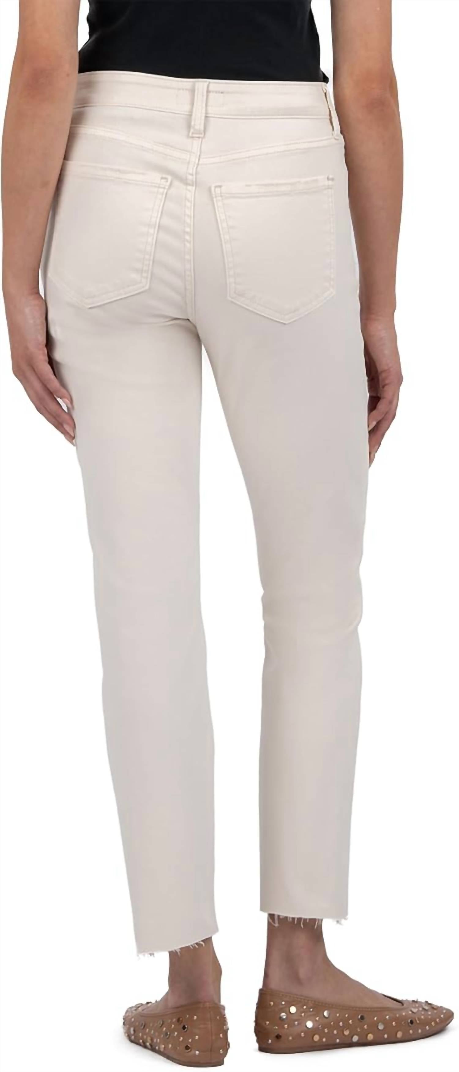 These must-have jeans are fit to perfection. Introducing the Reese High Rise Straight Leg Raw Hem Jean by KUT FROM THE KLOTH, a minimalist piece crafted for versatile style in ecru. These jeans feature a relaxed fit with a straight leg silhouette and a high rise for a flattering cut, measuring a 10" front rise and a 13" back rise. The composition includes a breathable 97% cotton and 3% spandex blend, with a 27" inseam and a 13 1/2" leg opening. Closure: Button, Pockets: Fab Ab front pockets. Care: Machine wash, tumble dry. Model sizes vary, with Janell (5'5") wearing size 6 and Dana (5'4") wearing size 12. These jeans are known to stretch slightly, allowing for a perfect fit over time.