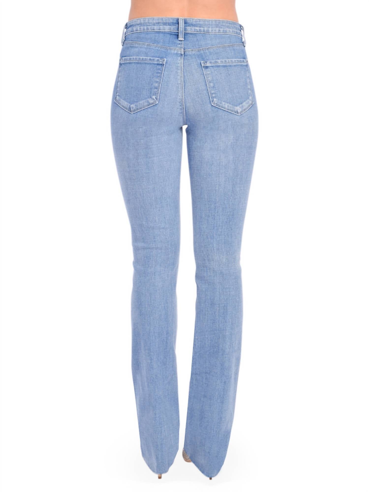 This classic straight leg jean has a perfect fit and goes with just about everything. High rise. Button-fly closure. Belt loops. A raw hem and clean five-pocket construction. Style No. 2649BLDR-LOYO. 79% Cotton 20% Repreve Polyester 1% Spandex. Made in Los Angeles. Machine wash. Model Details: Height 5’10.5" | Bust 33" | Waist 24" | Hips 34" | Wearing Size 25. Rise: 9.5", Inseam: 34", Leg Opening: 17".