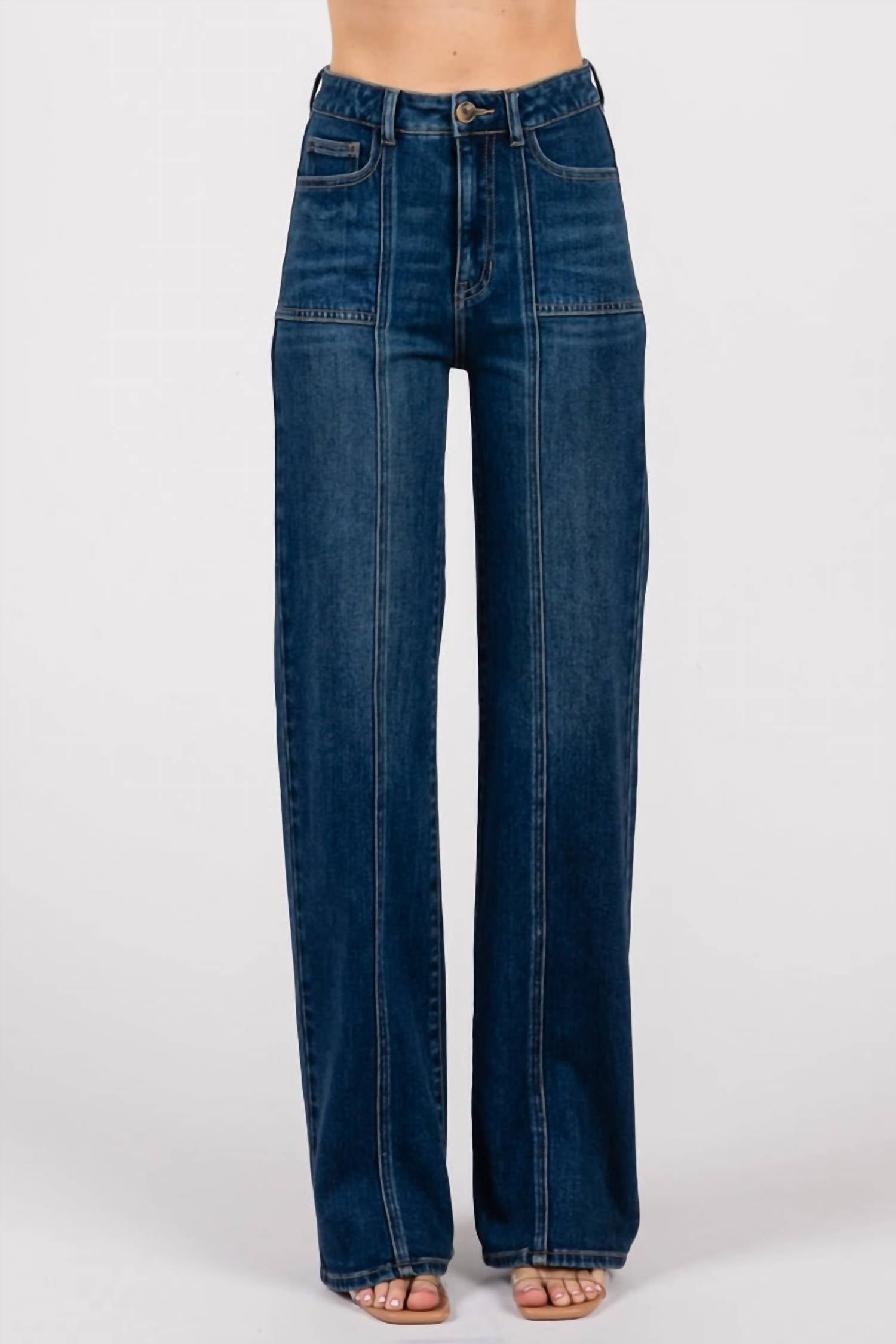These must-have jeans are fit to perfection. Discover the timeless appeal of the Briggs Street Front Seam Dark Straight Leg Denim Jeans by Letter to Juliet, expertly designed for women who appreciate structure with ease. These dark-wash jeans in a flattering high-rise offer a regular fit and boast long front seams and subtle darting for a tailored silhouette. Composition: 92.6% Cotton, 5.5% Polyester, 2% Spandex. Closure: Button closure. For best results, follow care instructions provided. Model is 5'8" and wearing size 26. Rise: 11", Inseam: 32", Leg opening: 20.5".
