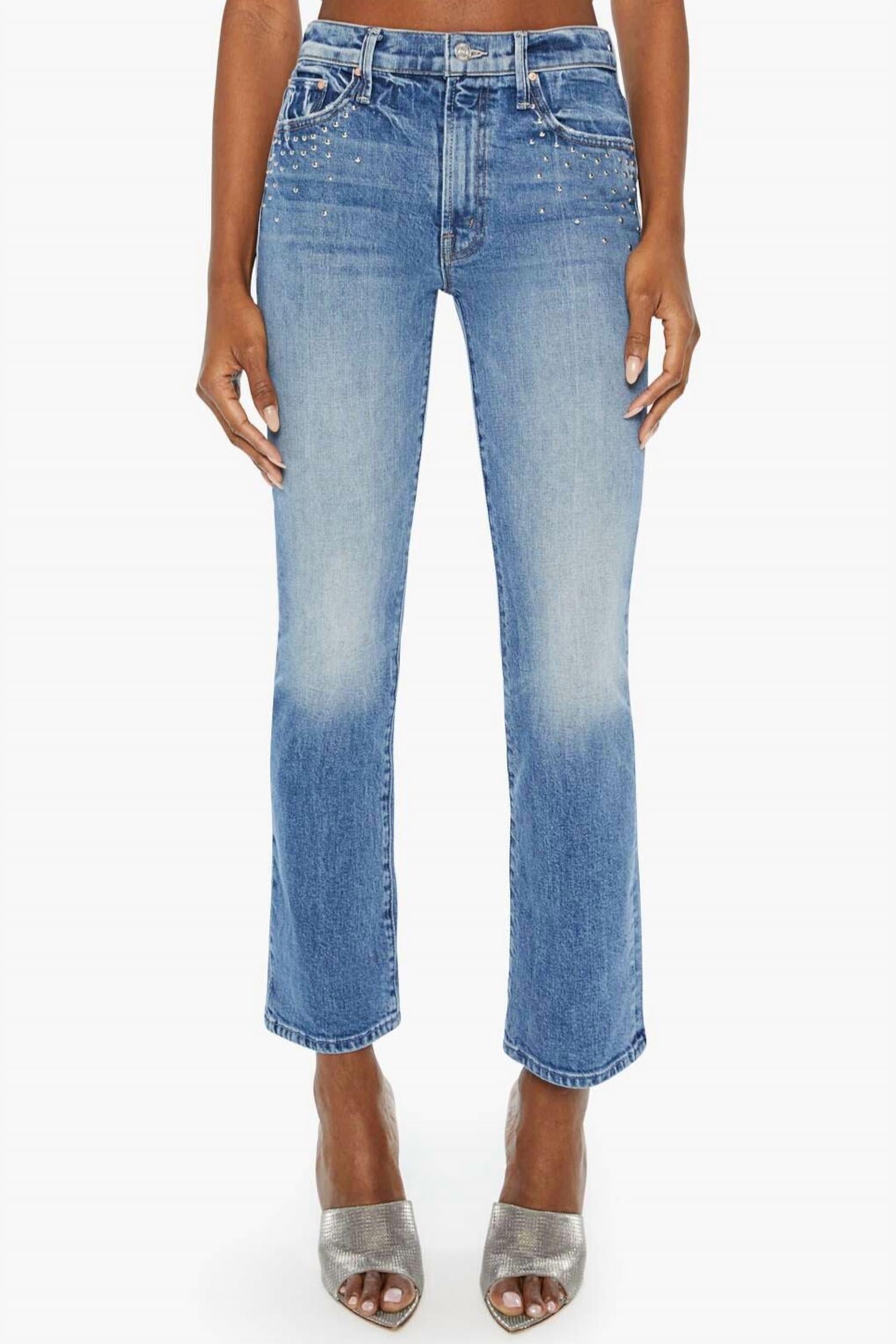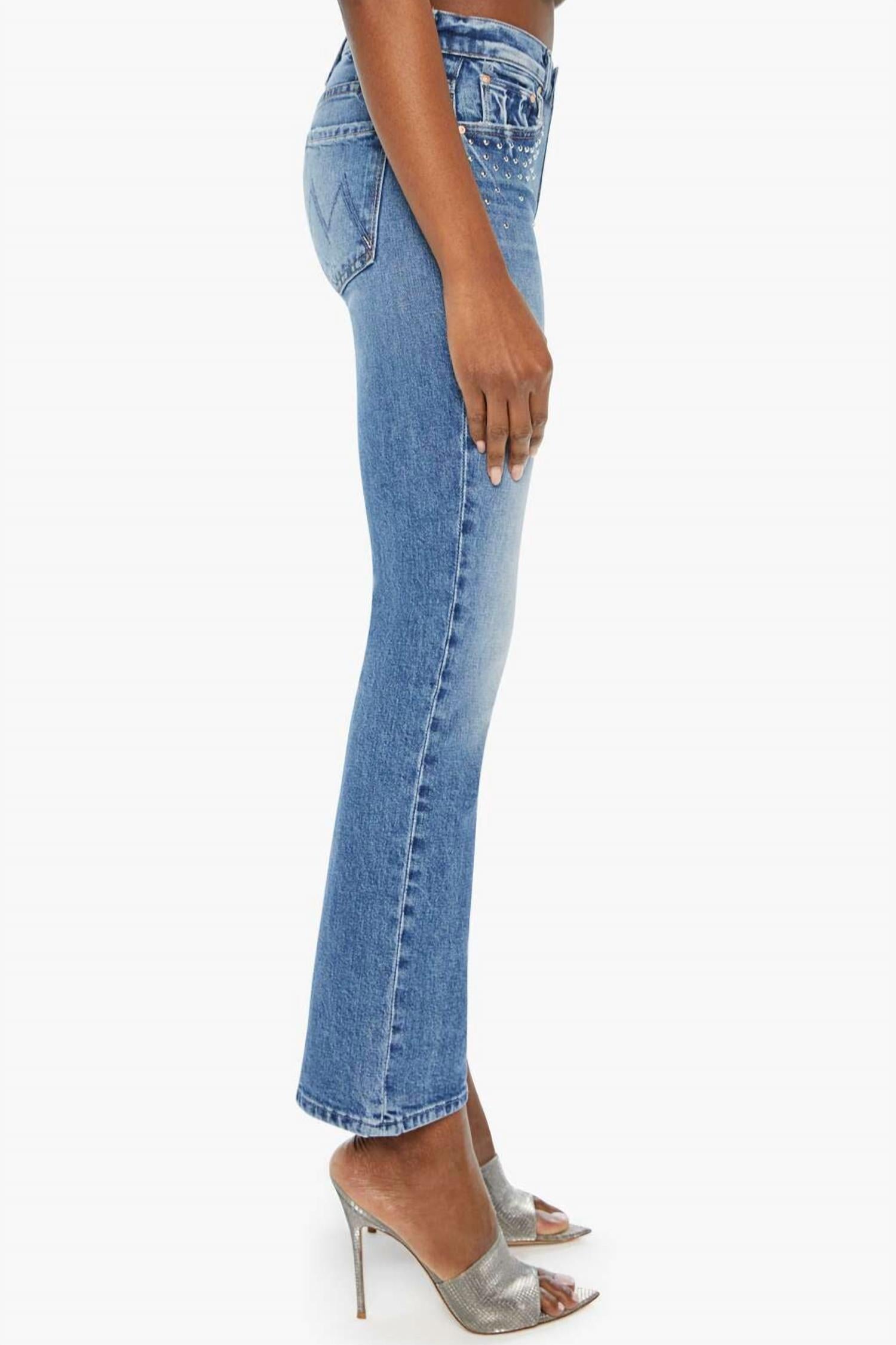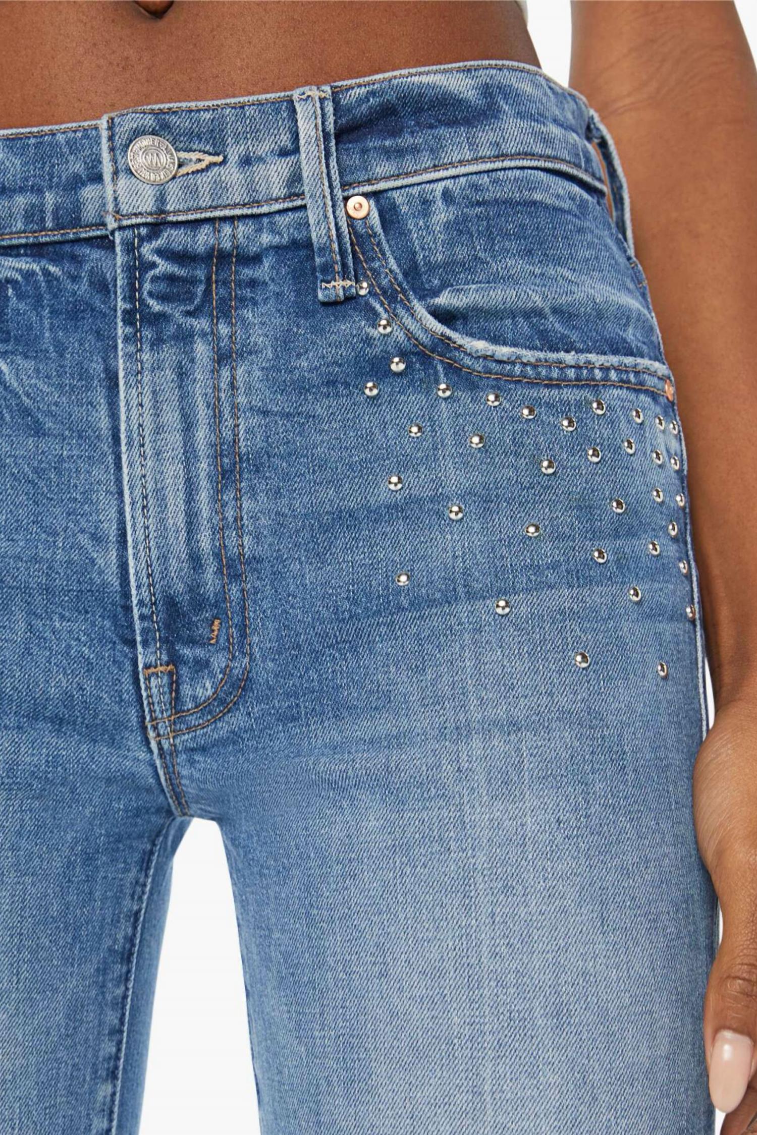 These must-have jeans are fit to perfection. Introducing the Insider Flood Jeans by MOTHER, designed for the modern wardrobe with a focus on comfort and style. These mid-rise bootcut jeans boast a regular fit and a straight leg silhouette, presenting a 10" rise, 28.25" inseam, and 15.75" leg opening. Crafted from a durable blend of 98% cotton and 2% elastane, they feature semi-rigid SUPERIOR denim in the stylish Metal Magic wash with distinct studs around the pockets. Made in Los Angeles, these jeans are equipped with a button closure and are easy to care for – simply machine wash and tumble dry.