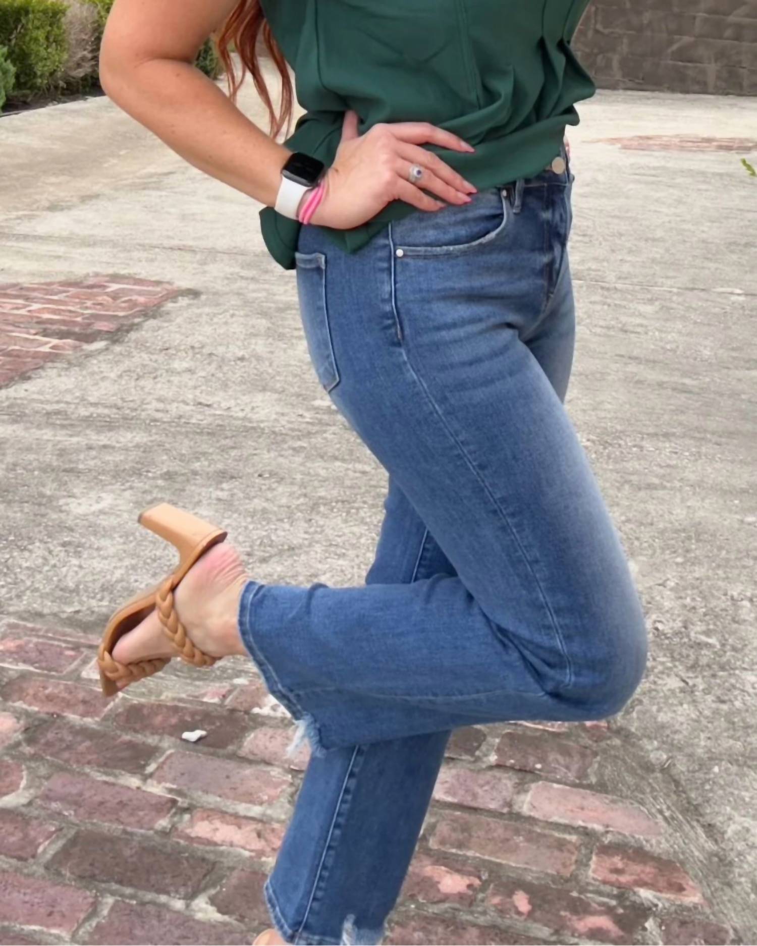 Pair these straight leg jeans with flats, sandals or even heels! You can't go wrong. Elevate your look with the Riley Straight Leg Jeans by RISEN, designed in a sophisticated medium wash for versatile style. With a high-rise waist and ankle-length cut, these jeans offer a relaxed fit that compliments any occasion. Made from a comfortable cotton blend (75% Cotton, 25% Polyester, 2% Spandex), they feature a reliable button closure and practical pockets. Care for these jeans is simple with machine wash instructions, making them an ideal choice for effortless everyday wear.