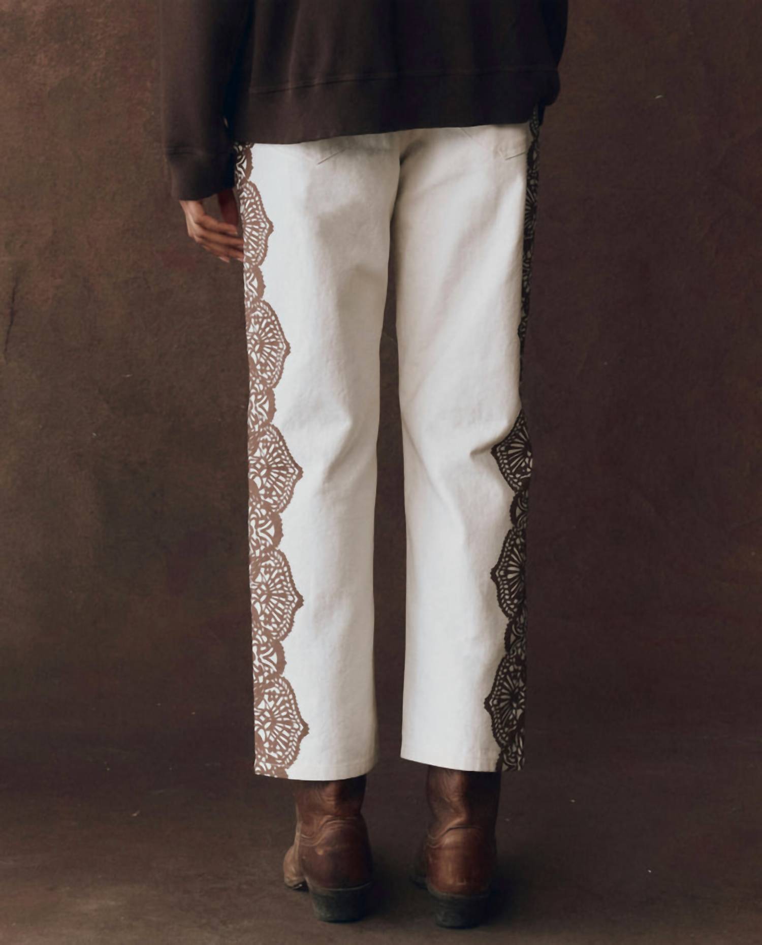 This classic straight leg jean has a perfect fit and goes with just about everything. The Lace Print Wayne Jean by THE GREAT. is a stylish addition to your collection, featuring a unique graphic western lace motif. Crafted from soft cotton, these jeans offer a comfort fit with a versatile straight leg that's cropped perfectly. Designed for women, they come with convenient pockets and a button closure, exuding Boho Chic vibes in a brown/cream palette. Care for these jeans easily with machine wash and tumble dry instructions, making them ideal for a relaxed summer vacation look.
